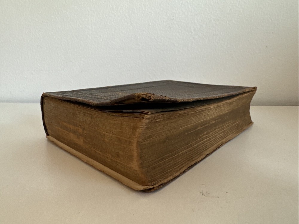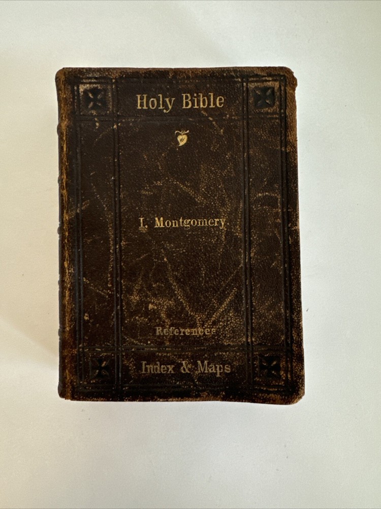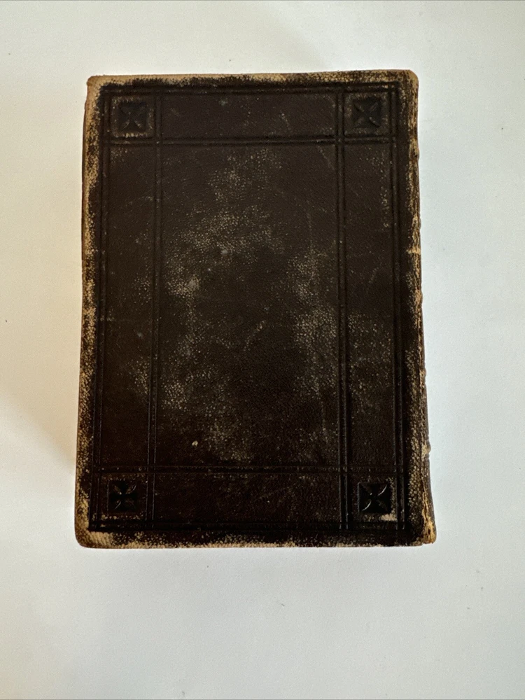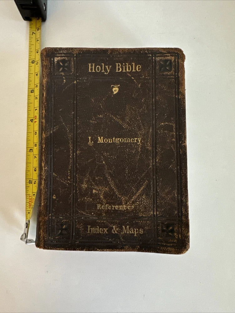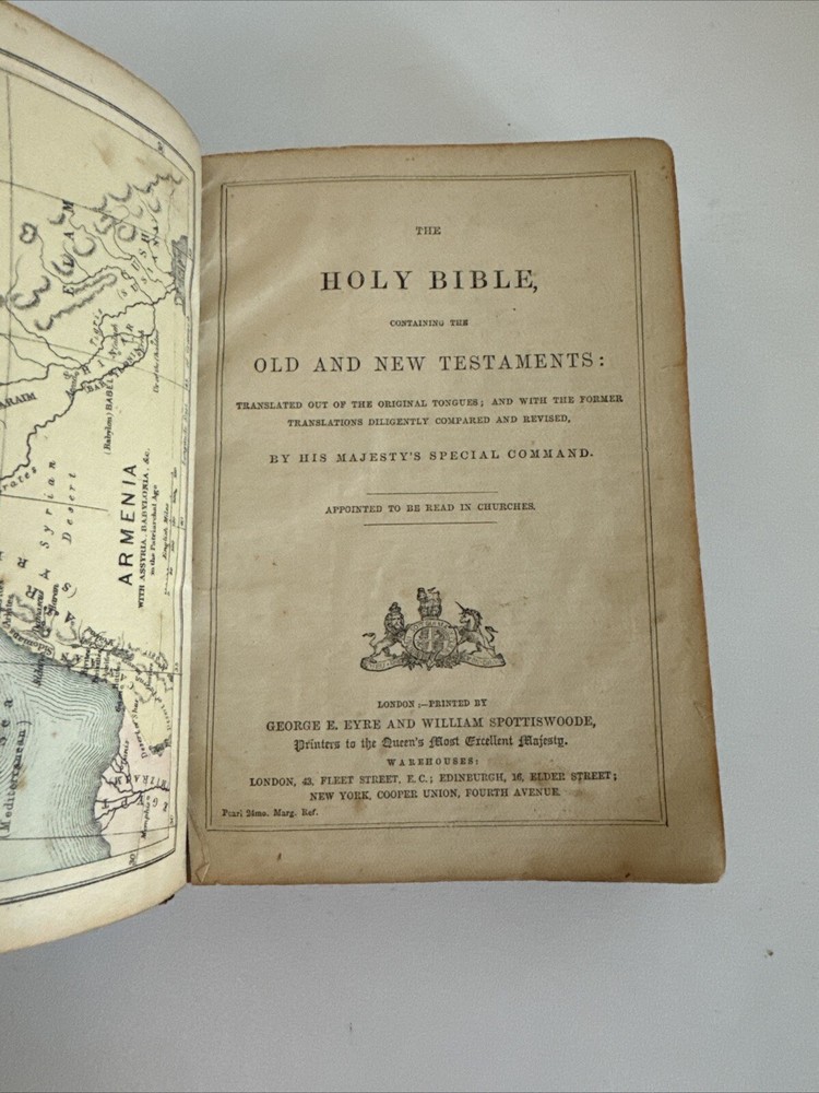 Antique Holy Bible published in mid 1800s by Eyre & Spottiswoode in London. Exact year of print not listed. Leather. With references, color maps, and index. Pocket sized. Condition: binding a bit loose, but still nicely intact. some age and read wear. A bit of writing inside front cover. Some light dirt and a few stains. Age coloring to pages. Remains nicely intact. Shipped for FREE!