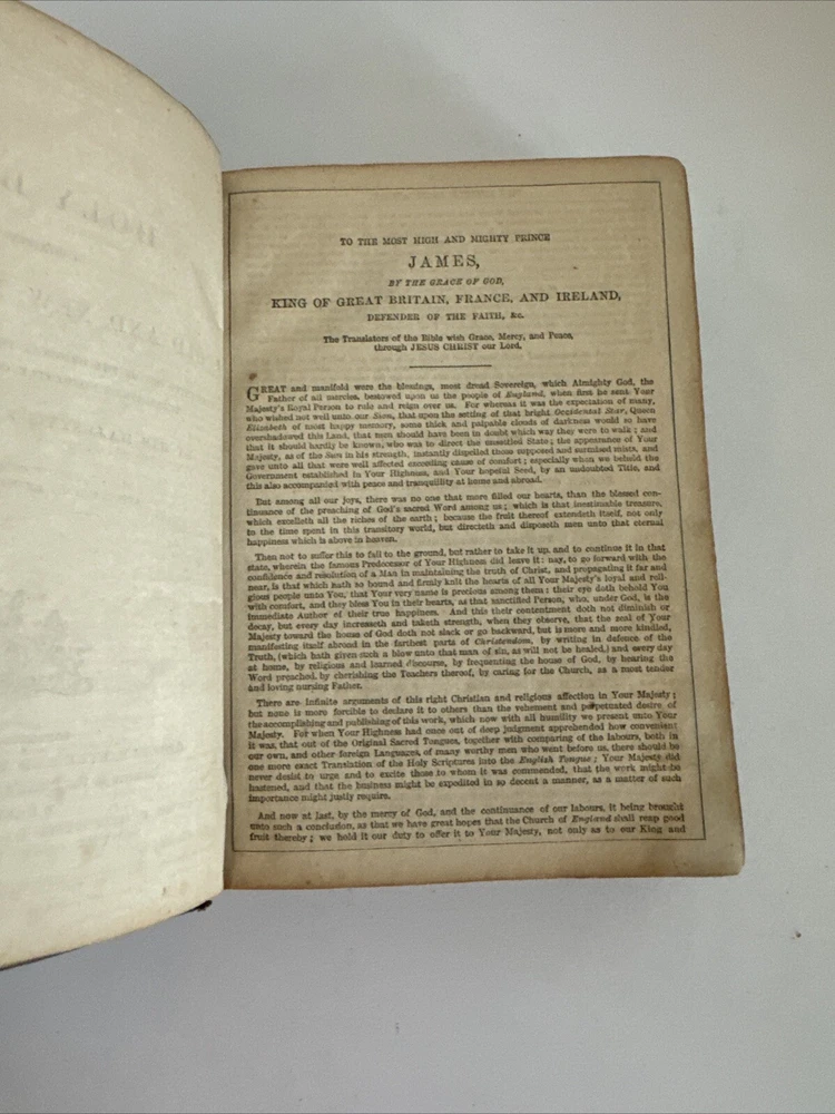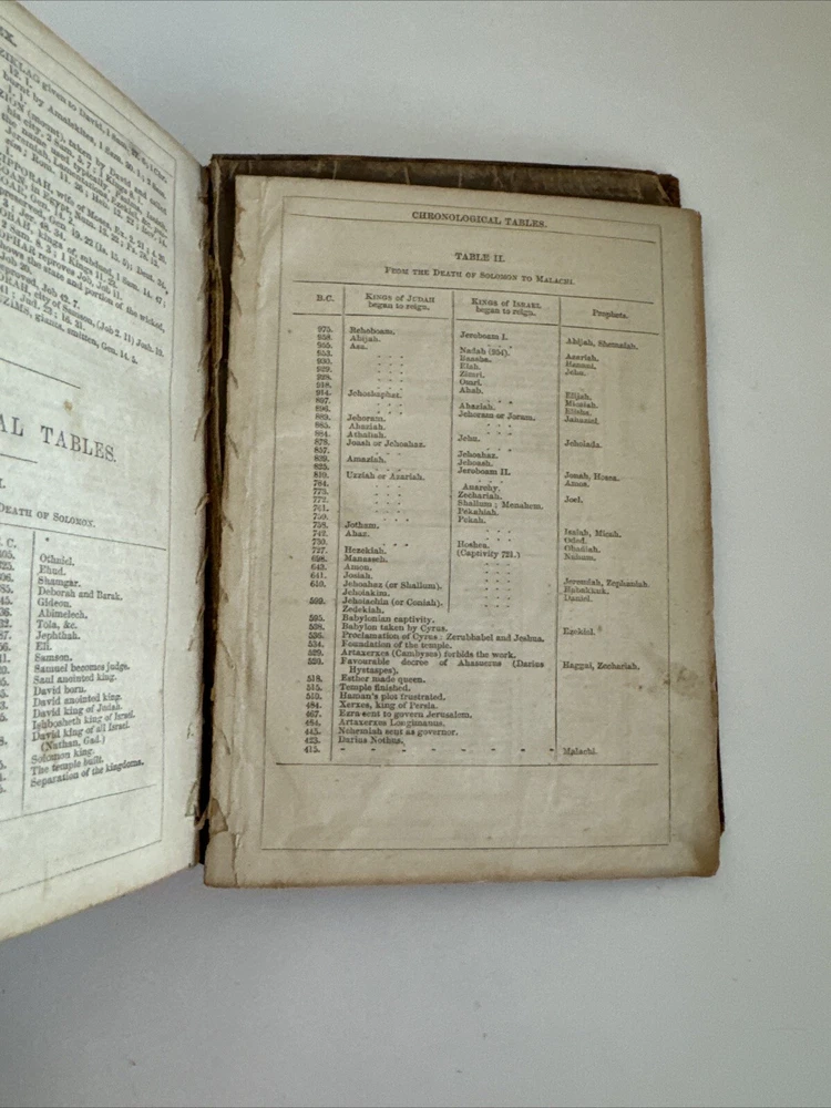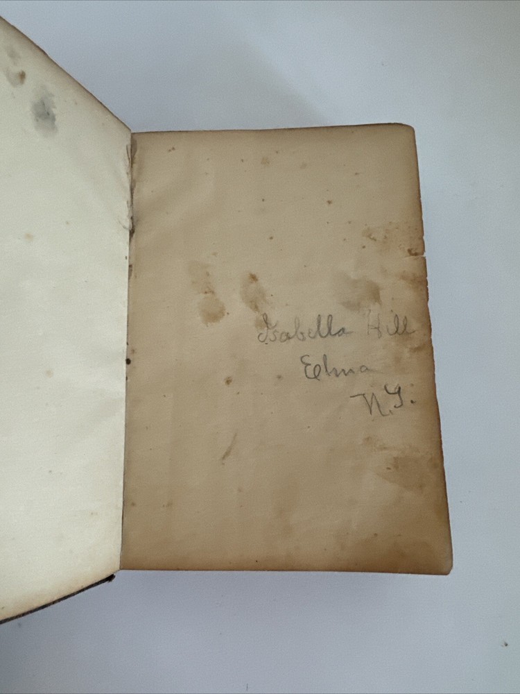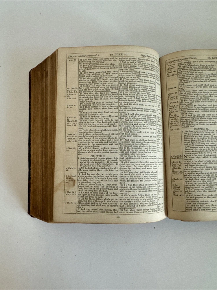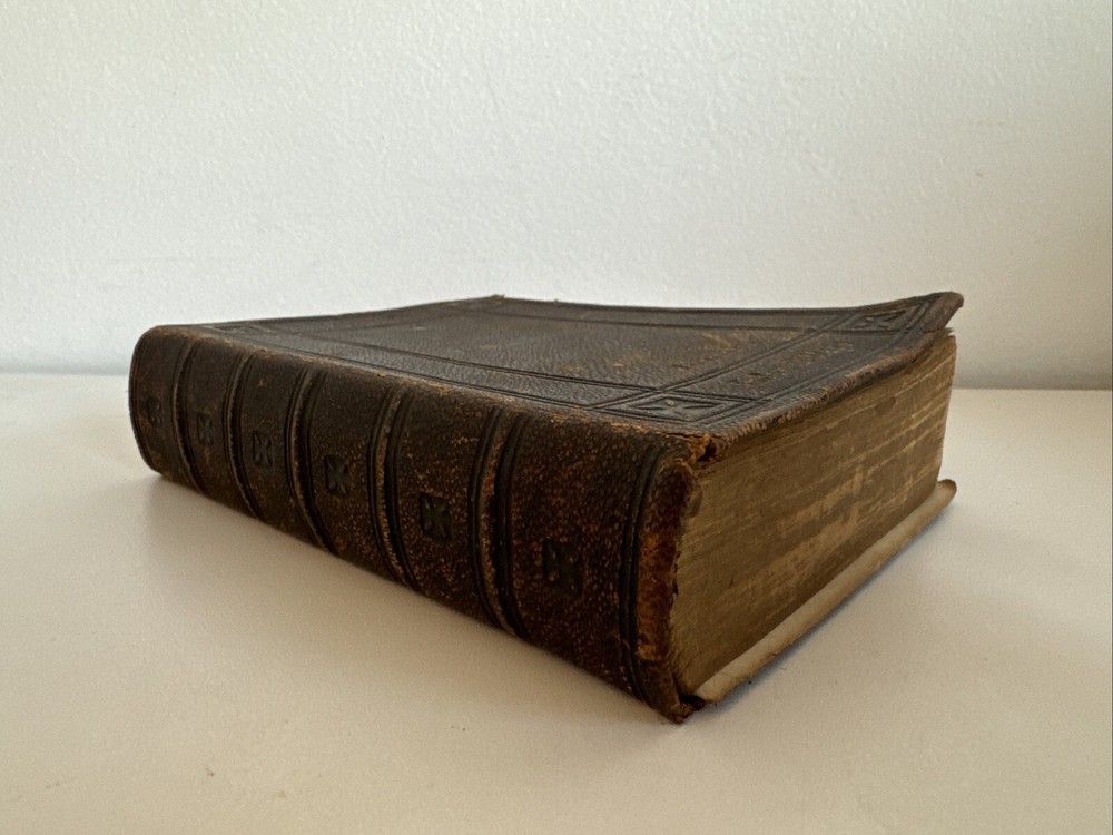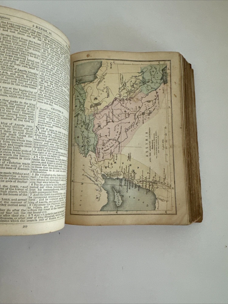 Antique Holy Bible published in mid 1800s by Eyre & Spottiswoode in London. Exact year of print not listed. Leather. With references, color maps, and index. Pocket sized. Condition: binding a bit loose, but still nicely intact. some age and read wear. A bit of writing inside front cover. Some light dirt and a few stains. Age coloring to pages. Remains nicely intact. Shipped for FREE!