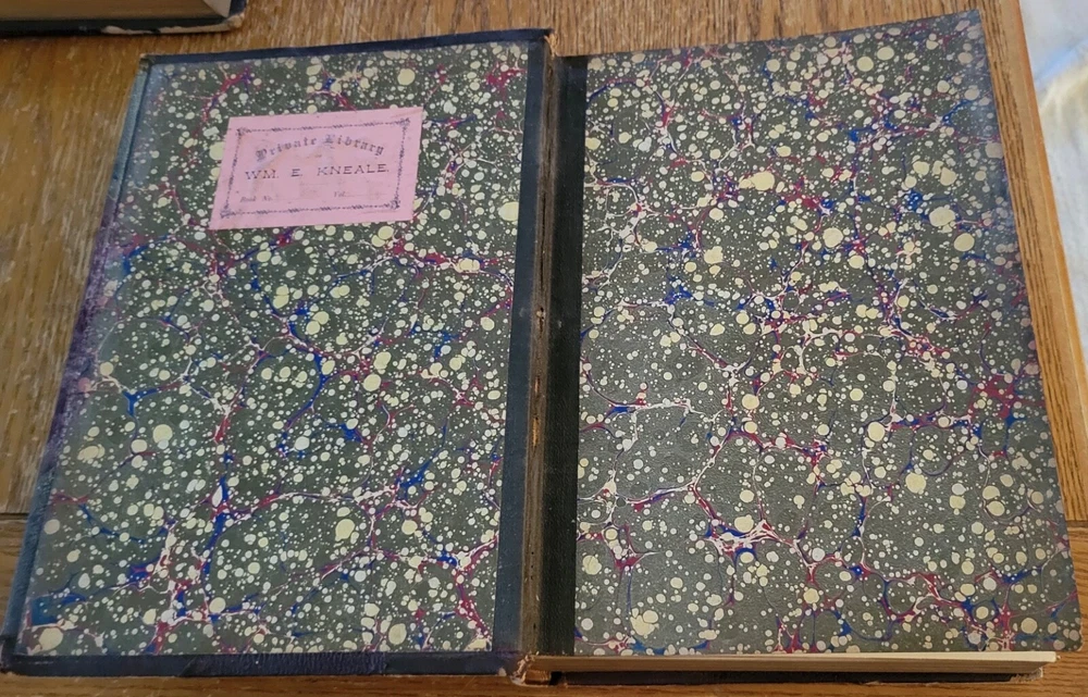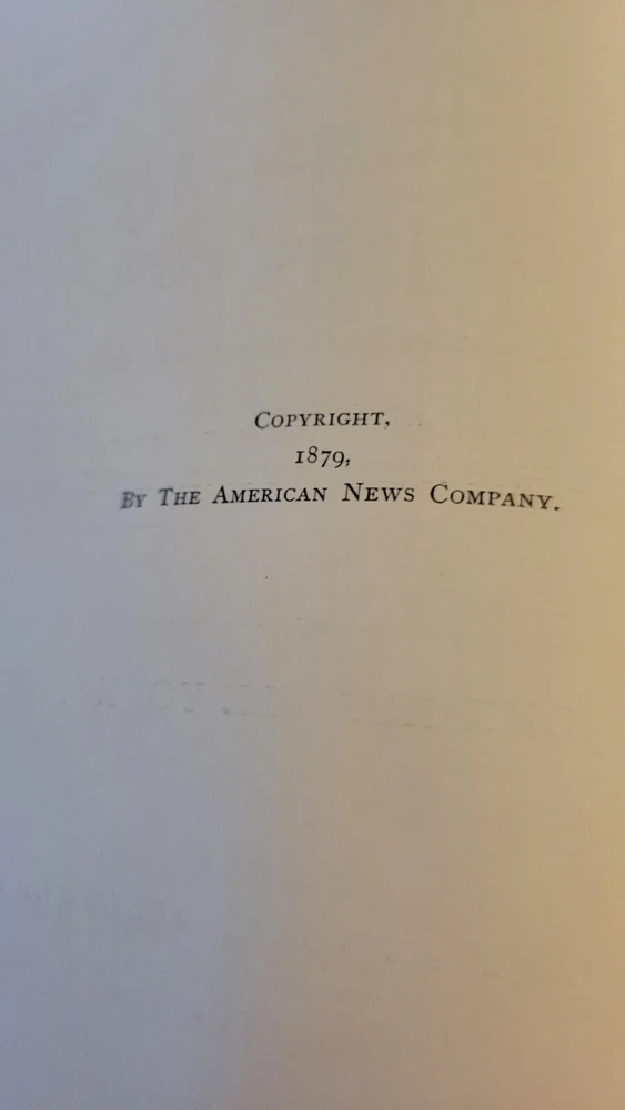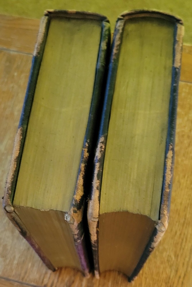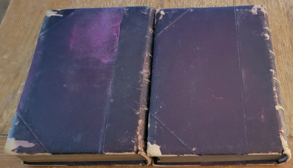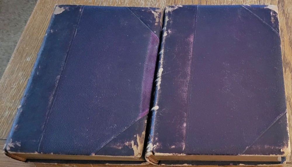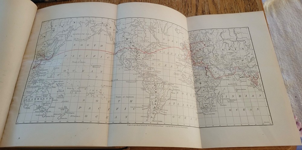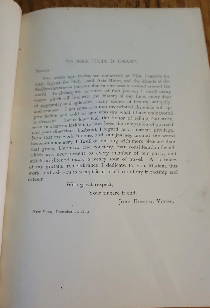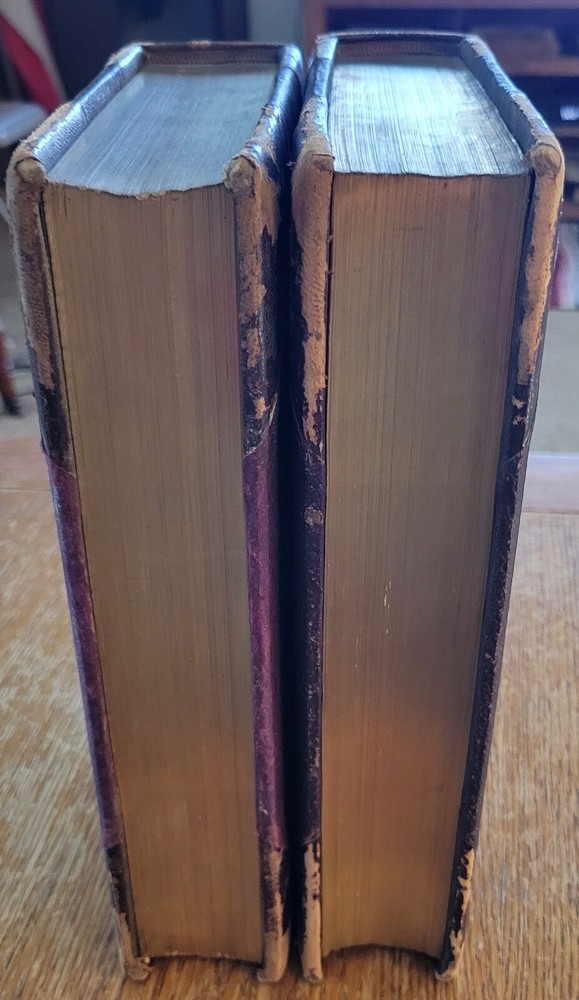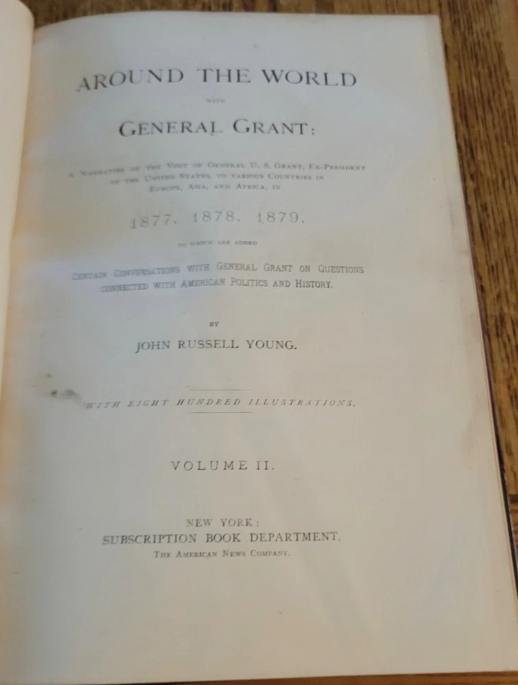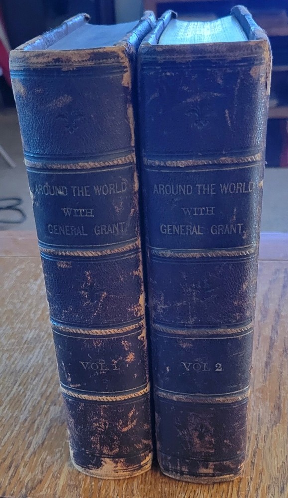 Around The World With General Grant with 800 illustrations. Nice Grant plate front of volume 1 and foldout map front volume 2. Leather wrapped and ribbed spines. Leather corners. People finish cloth on boards. Previous owners Private Library stamp inside front board on both. Gold edges to pages. 631 pages each. Solid copies. Heavy books at over 11 lbs for the set.
