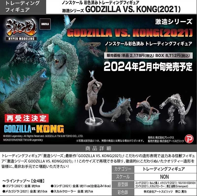 The selling price does not include any local country duties. Duties are to be paid by the recipient. Art Spirits HYPER MODELING Godzilla vs. Kong Set 4 Pcs Figure Mechagodzilla Box Contents: Godzilla figure 9cm Kong figure 18cm Skullcrawler figure 7cm Mechagodzilla figure 10cm