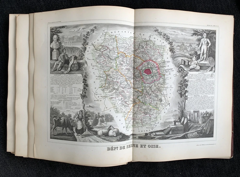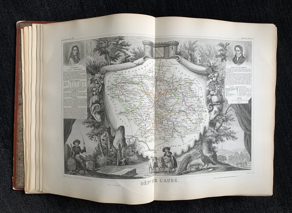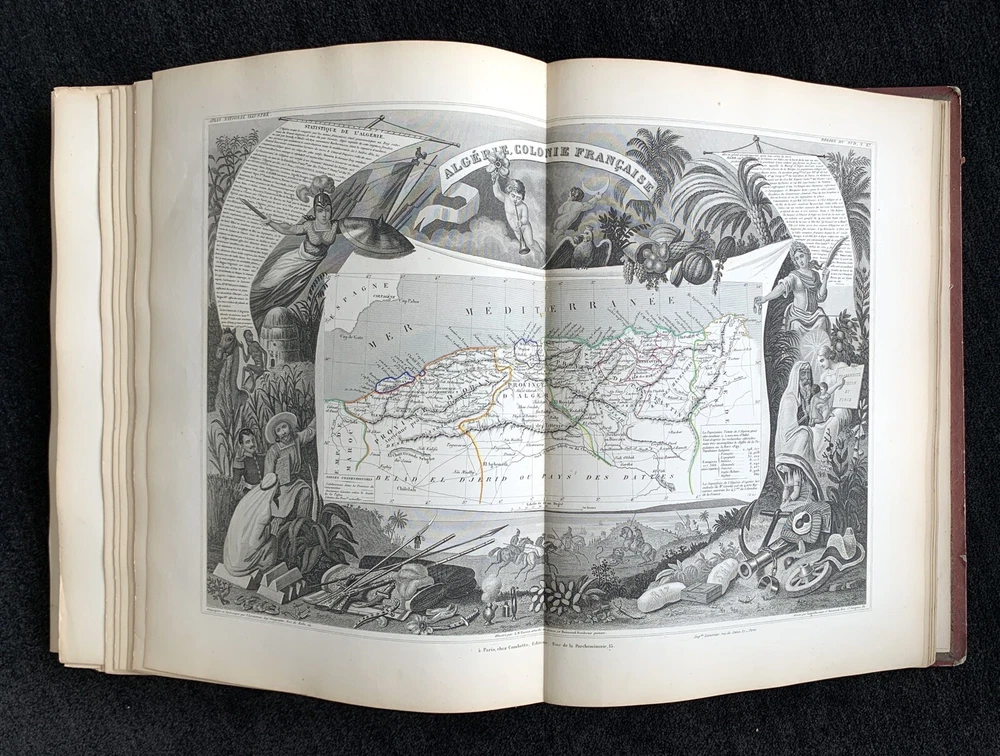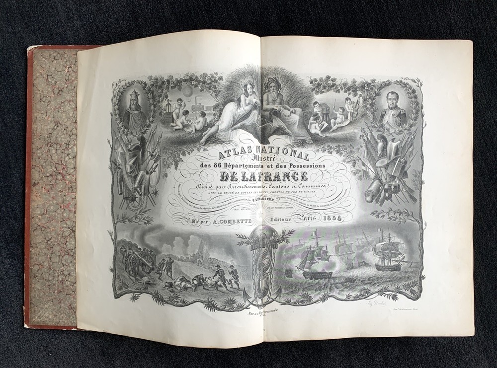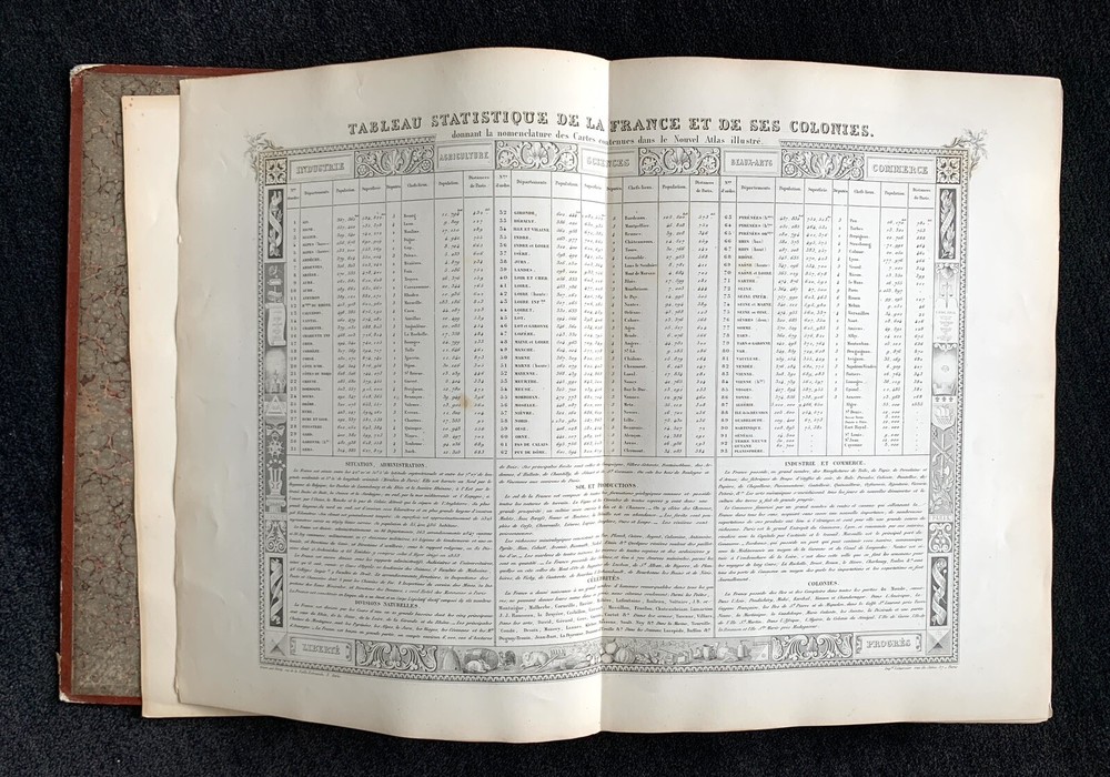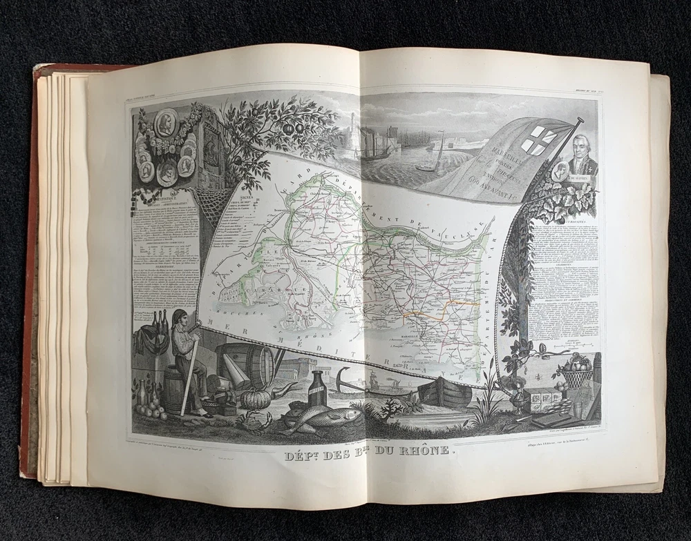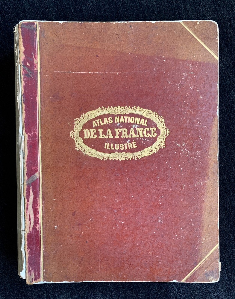 Atlas Nationale Illustre de la France : des 86 Départements et des Possessions de la France divisé par Arrondissements, Cantons et Communes. Avec le tracé de toutes les routes, chemins de fer et canaux illustrated by Victor Levasseur published by Amable Combette folio, engraved throughout, comprising a title-page, statistical table, and maps; elaborate pictorial borders around the double-page sheets, containing townscapes, historical scenes, portraits, costume figures, illustrations of local products, flora and fauna, statistical tables and descriptive panels of text, dated 1854 Victor Levasseur was a French cartographer, engineer and engraver well known for his elaborate map style. Please note that shipping charges are inclusive of insurance, payment processing and carrier fees. All books shipped via media mail usually have a 2-3 day tracking delay out of Chicago. b12top