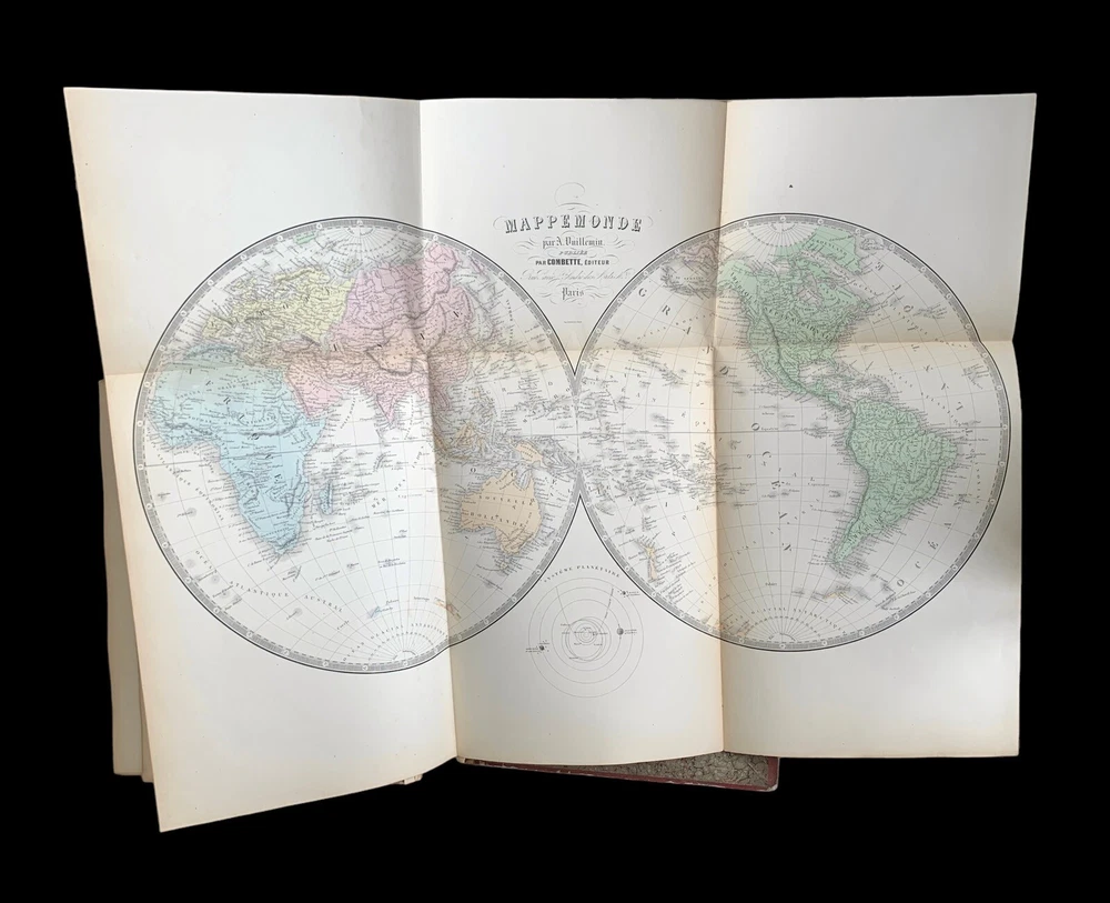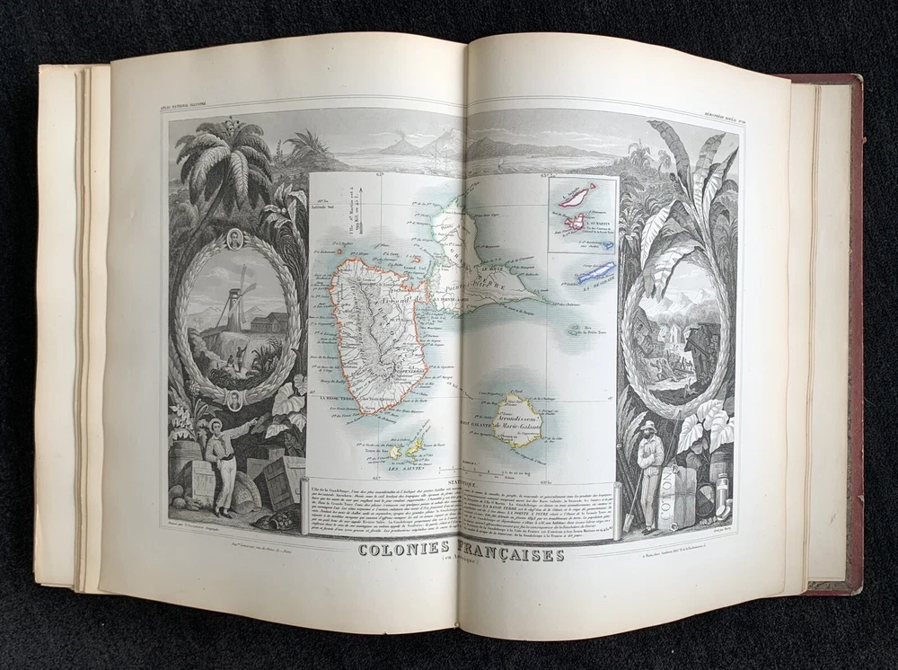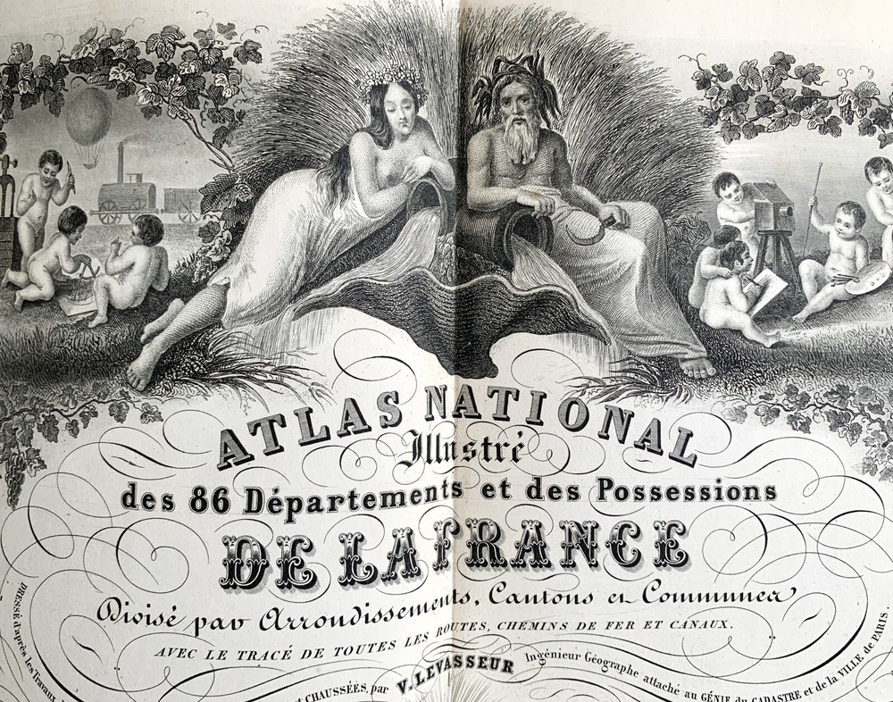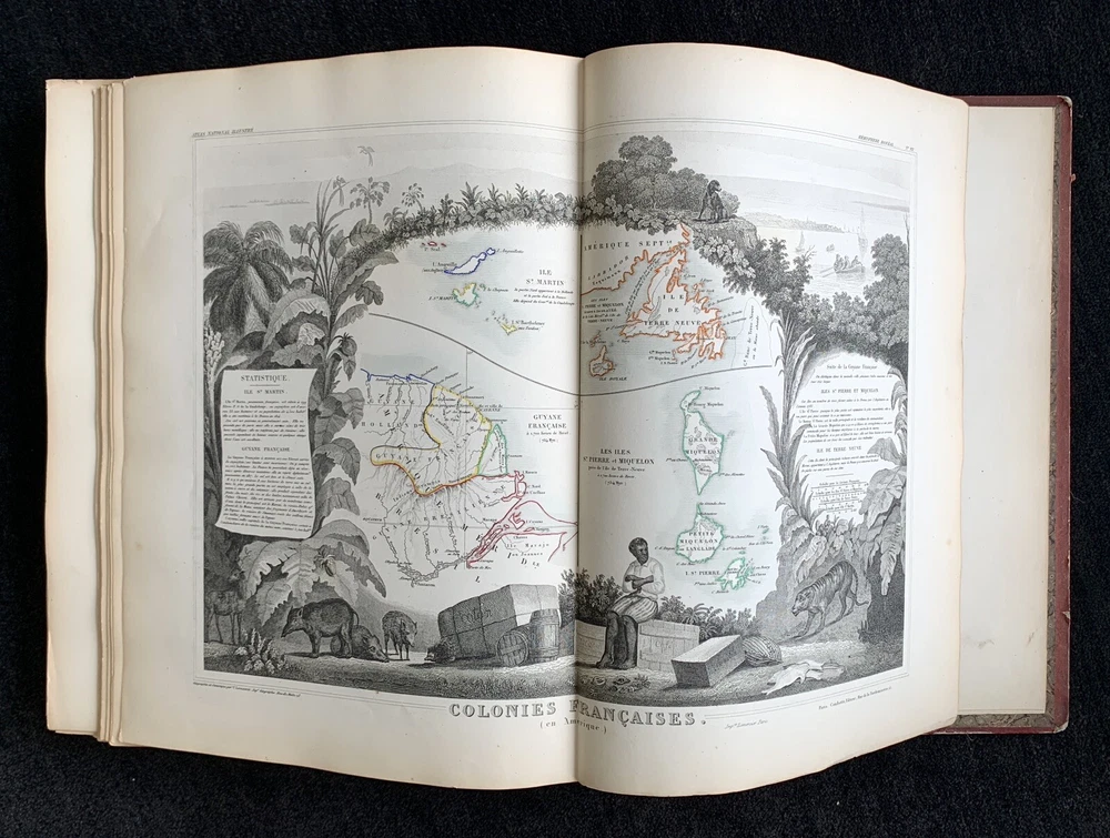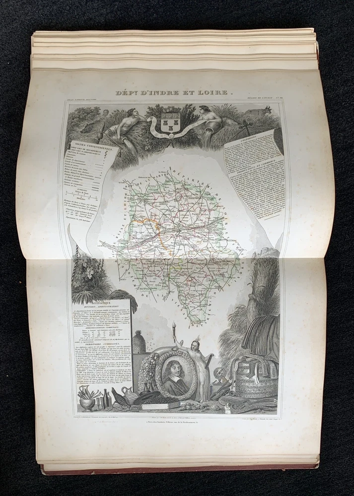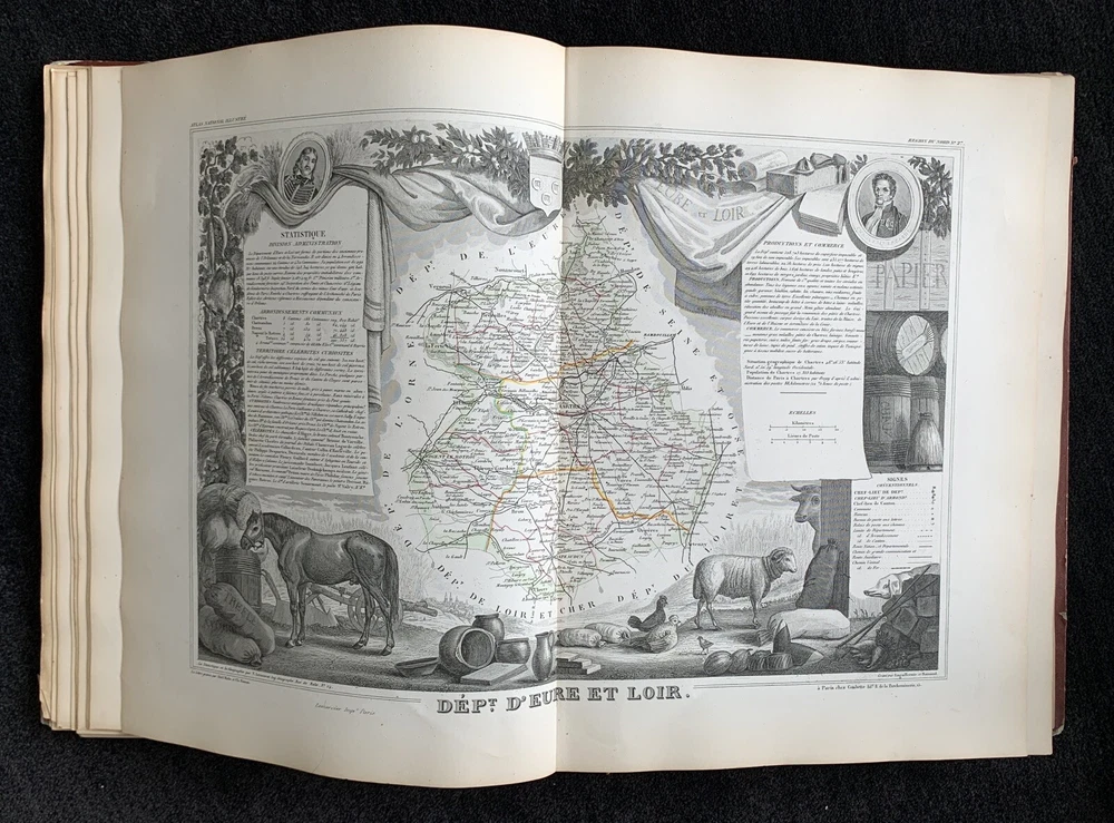 Atlas Nationale Illustre de la France : des 86 Départements et des Possessions de la France divisé par Arrondissements, Cantons et Communes. Avec le tracé de toutes les routes, chemins de fer et canaux illustrated by Victor Levasseur published by Amable Combette folio, engraved throughout, comprising a title-page, statistical table, and maps; elaborate pictorial borders around the double-page sheets, containing townscapes, historical scenes, portraits, costume figures, illustrations of local products, flora and fauna, statistical tables and descriptive panels of text, dated 1854 Victor Levasseur was a French cartographer, engineer and engraver well known for his elaborate map style. Please note that shipping charges are inclusive of insurance, payment processing and carrier fees. All books shipped via media mail usually have a 2-3 day tracking delay out of Chicago. b12top