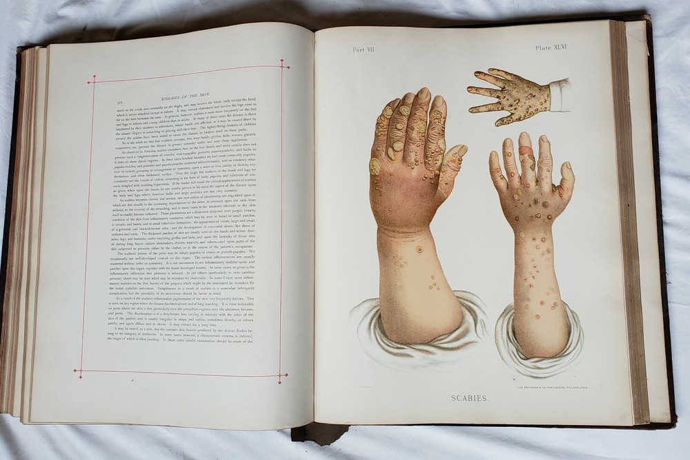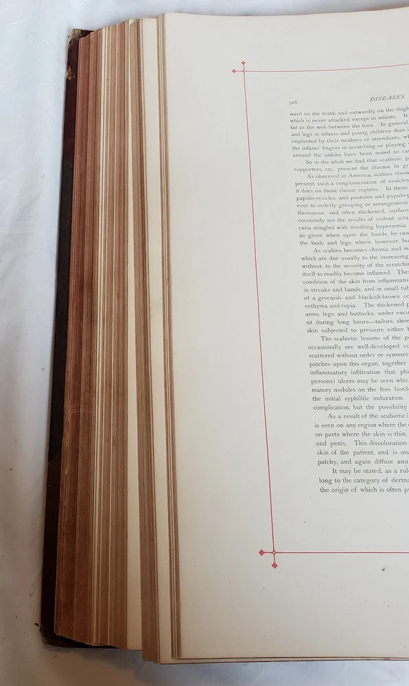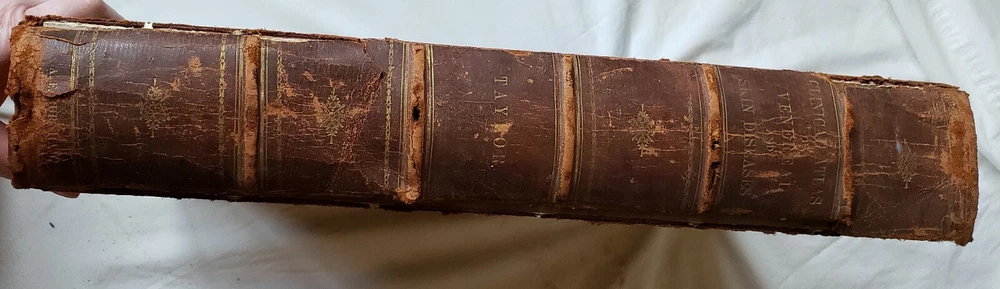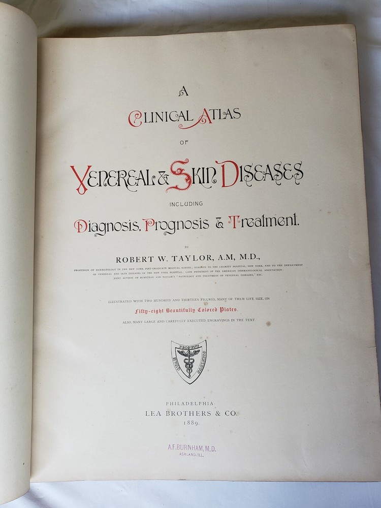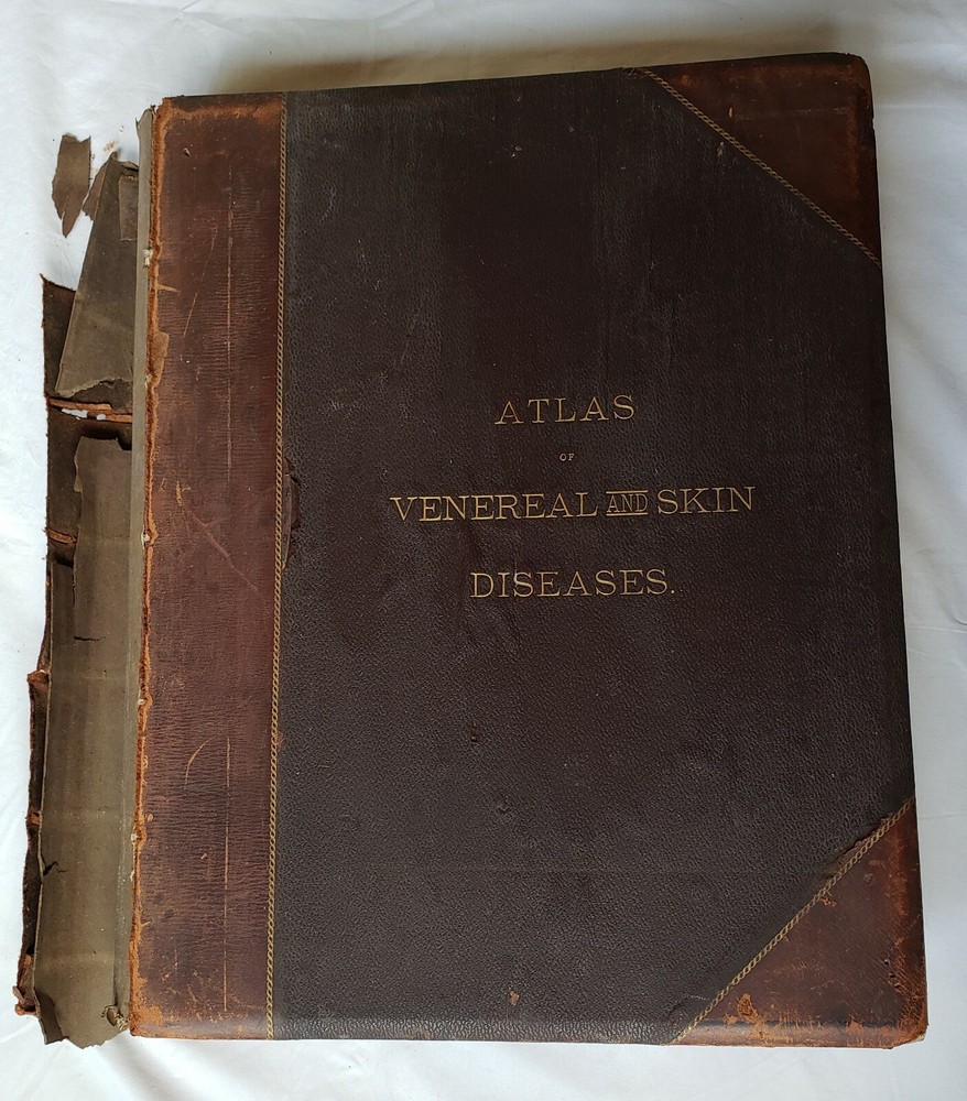 Atlas Of Venereal And Skin Diseases,1889, Rbt. Taylor MD, 58 colored plates + . Illustrated medical book with more than 200 illustrated figures and 58 colored plate illustrations. Book size is approximately 13x19x3 and weighs about 20 pounds. Interior pages are in good condition. No ripped or dog-eared that I can see (didn't check page by page, but looked for that type of damage in general). Page binding is in good condition and still holds pages securely, but the leather outer binding is disintegrating. All pieces are there so a book restoration professional would be able to see what the original gold imprint of book name and decorative stamping looked like for restoration. The front cover is still attached and in reasonably good condition. The back cover is detached and has damage as shown in photos. Would make a wonderful gift for specialist in this field. Shipping will need to include insurance due to book value.