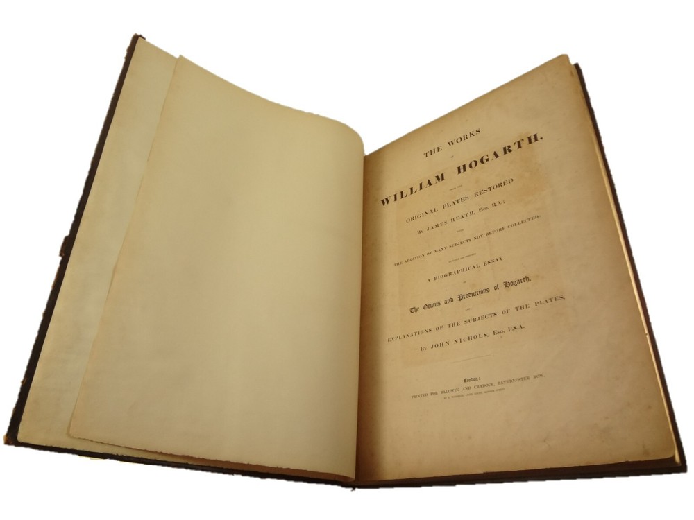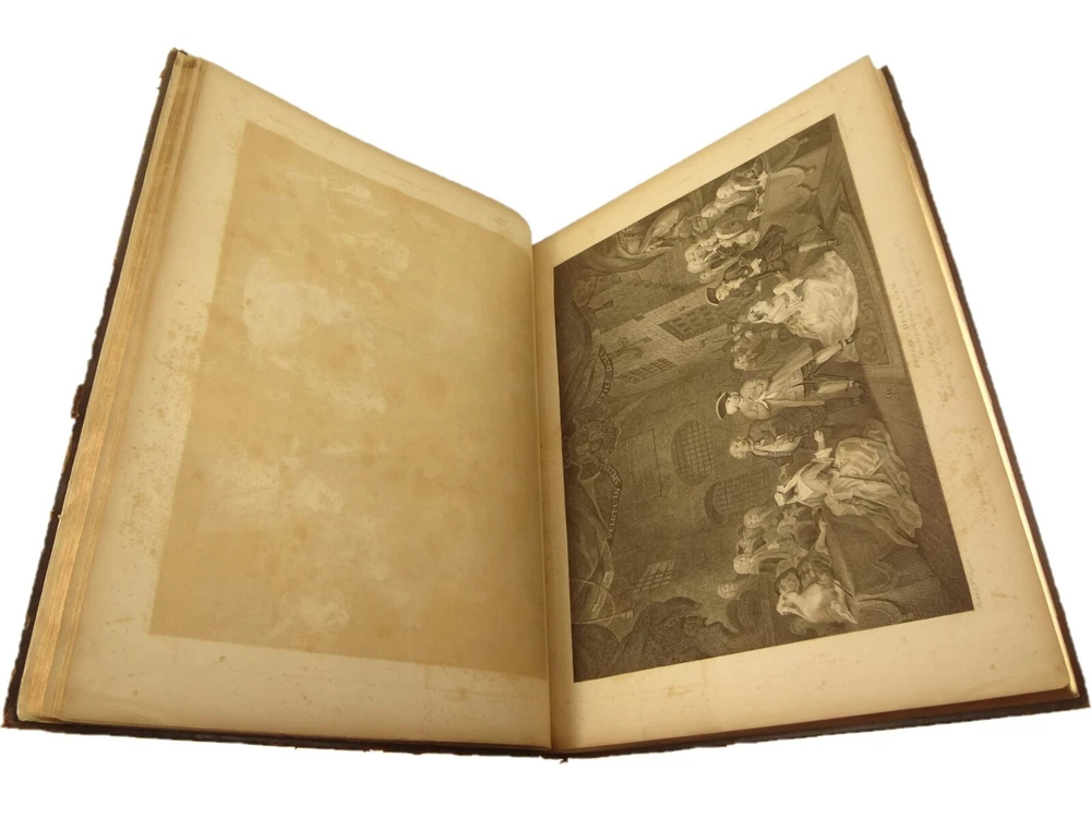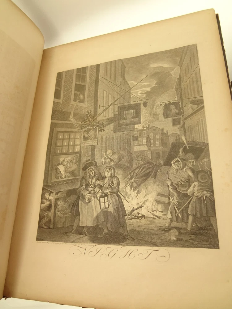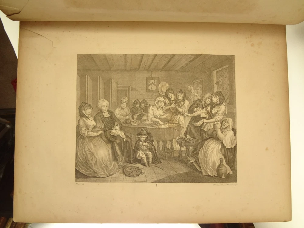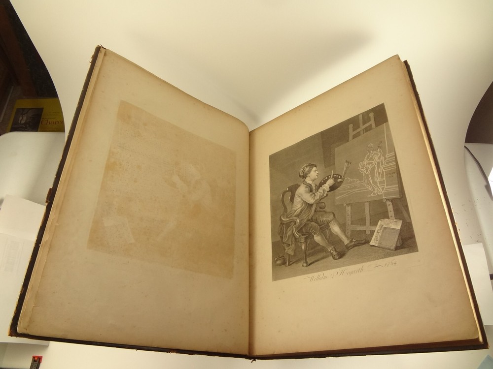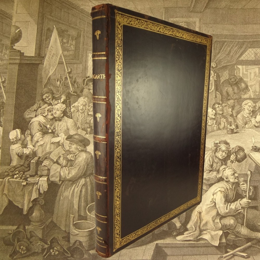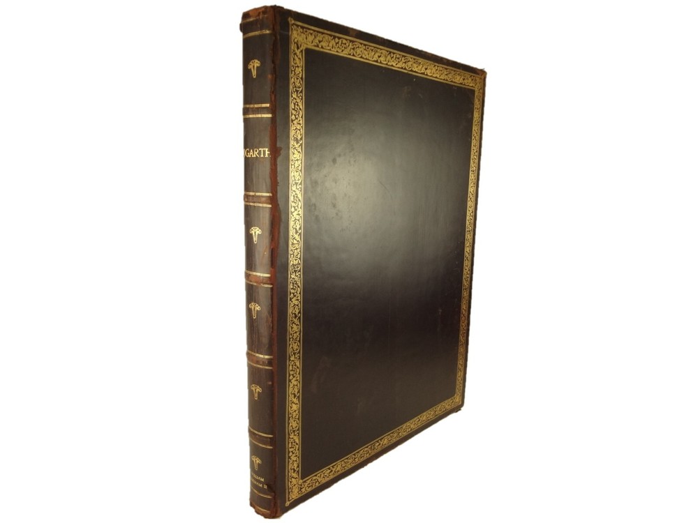 Atlas folio edition of Hogarth's works, printed from the original plates (restored). This imposingly large work measures 25.75" tall at the leaf (by approximately 18.8"). Atlas folio is just slightly larger than elephant folio. Bibliographies record that the original Hogarth plates were at the printer's, Baldwin and Cradock, to produce this impressive work. (p. 188, William Hogarth, Austin Dobson, 1898) This copy is well-worn, and missing five called-for plates (per the index); and likely three "suppressed plates" that bibliographies record being in an envelope at the rear. Still, 110 leaves remain (of 118 leaves). About the Work - This work was first printed in 1822, by Baldwin, Cradock and Joy. It was later reprinted, and Joy was dropped from the publisher's name; this copy is from this later edition. While no date is on the reprint title page, bibliographies place it between 1837 (a date on one of the plates) and 1848 (when a copy appears in Bohn's catalogue). Earlier bibliographers didn't have access to scanned Google Books and I found several advertisements earlier than 1848, placing the date of printing closer to 1837. The 1822 edition had 119 plates. This later edition had three "suppressed plates" at the rear (per bibliographies and Worldcat catalogue entries), and 115 plates listed, adding up to 118 plates total; the three plates at the rear were probably trumped-up as suppressed for this later edition to aid sales (this is pure speculation) as the total number of plates remained nearly the same. About William Hogarth - William Hogarth (1697 – 1764) was an English painter, engraver, pictorial satirist, social critic, editorial cartoonist and occasional writer on art. His work ranges from realistic portraiture to comic strip-like series of pictures called "modern moral subjects", and he is perhaps best known for his series A Harlot's Progress, A Rake's Progress and Marriage A-la-Mode. Knowledge of his work is so pervasive that satirical political illustrations in this style are often referred to as "Hogarthian". Hogarth was born in London to a lower-middle-class family. In his youth he took up an apprenticeship with an engraver, but did not complete the apprenticeship. His father underwent periods of mixed fortune, and was at one time imprisoned in lieu of outstanding debts, an event that is thought to have informed William's paintings and prints with a hard edge. Influenced by French and Italian painting and engraving, Hogarth's works are mostly satirical caricatures, sometimes bawdily sexual, mostly of the first rank of realistic portraiture. They became widely popular and mass-produced via prints in his lifetime, and he was by far the most significant English artist of his generation. Charles Lamb deemed Hogarth's images to be books, filled with "the teeming, fruitful, suggestive meaning of words. Other pictures we look at; his pictures we read." Notes on the Binding - This copy is unique in that it was bound in full-leather for the owner William Buckingham III (his name in gilt at base of spine). Most of the copies are 3/4 leather, and that was probably how they were issued; the reference to a folder of suppressed leaves at the rear indicates that the binding was already on the book when it was sold. William Buckingham III and his wife Ethel (her calling card tucked inside) resided on Vernon Pl. in Cleveland Ohio at the turn-of-the-century. Bibliographic Details - Worldcat OCLC catalogue numbers - 776950147 and 40738662 A Bibliography of William Hogarth, Frank Weitenkempf, page 6, 1890 See earlier note on Dobson printing. Plates Missing - Missing five listed plates, and three "suppressed plates" that bibliographies record being added in a folder at the rear binding. Listed plates from index that are missing: Frontis of Hogarth with Dog Plate 27 Modern Midnight Conversation Plate 48 Strolling Actress Dressing in a Barn Plate 93 The Cockpit Plate 108 The Politician Physical Attributes - Measures approx. 66.75 x 49.25 x 4.75 cm. Leather binding. Boards with frame of gilt decoration; double gilt fillets on outside, leafy sprays in the center, corner florets. Spine with six raised bands; five compartments with a central gilt floret, one compartment with "Hogarth" in gilt. "William Burlingham III" at base of spine in gilt. Leather doublures as pastedowns. Pages - (missing frontis of Hogarth), viiii, 110 plates (of 114), 42 numbered pages of explanation. Condition - See pictures. Wear to binding, with edge and corner wear, rubs. etc. Joints/hinges tender, with some cracking. Chipping at head and tail of spine. Missing five called-for plates, and probably three "suppressed" plates that would be found in original issue (in a pocket at rear); see missing plates list in description. Some dust at gutter. Toned and thumbed throughout. Many page edge chips. Almost all pages have 2-4" tears from bottom-edge, near the gutter, a result of turning the large leaves. Paper was not strong and large size causes tearing; approximately ten leaves with tearing where plate edge contacted paper on printing. Some foxing throughout and occasional small black spots. There is an approx. 1" moisture mark at bottom of gutter, no printing affected. Occasional damp stain from bottom-edge in margin. Hudibras plates 5 and 6 entirely loose. Fore-edge margin plate 2 Four Times missing. Tear in plate 6 and 10 Industry and Idleness. Cruelty in Perfection torn across. 2" tear into Election Entertainment. Gutter tape at Charing the Members. Moisture mark top-edge near rear. 3" tear into bottom of The Staymaker. Moisture mark at gutter margin in rear index of plates. No "suppressed plates", bibliographies note these three were in a folder at the rear of the original release; no mention in index or title page though. Price reflects condition. A desirable edition, pleasing in its large size and reprinting of the original plates, but this copy likely resided in an attic (or similar) for a long period of time and now the