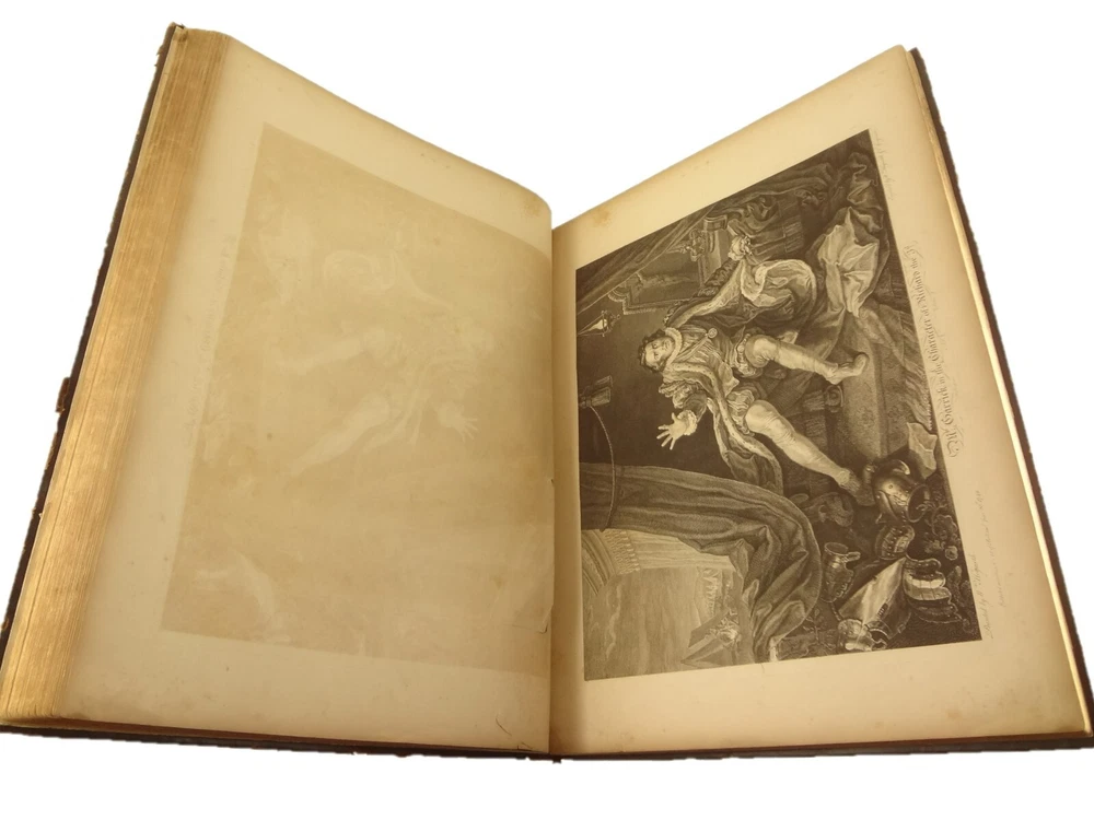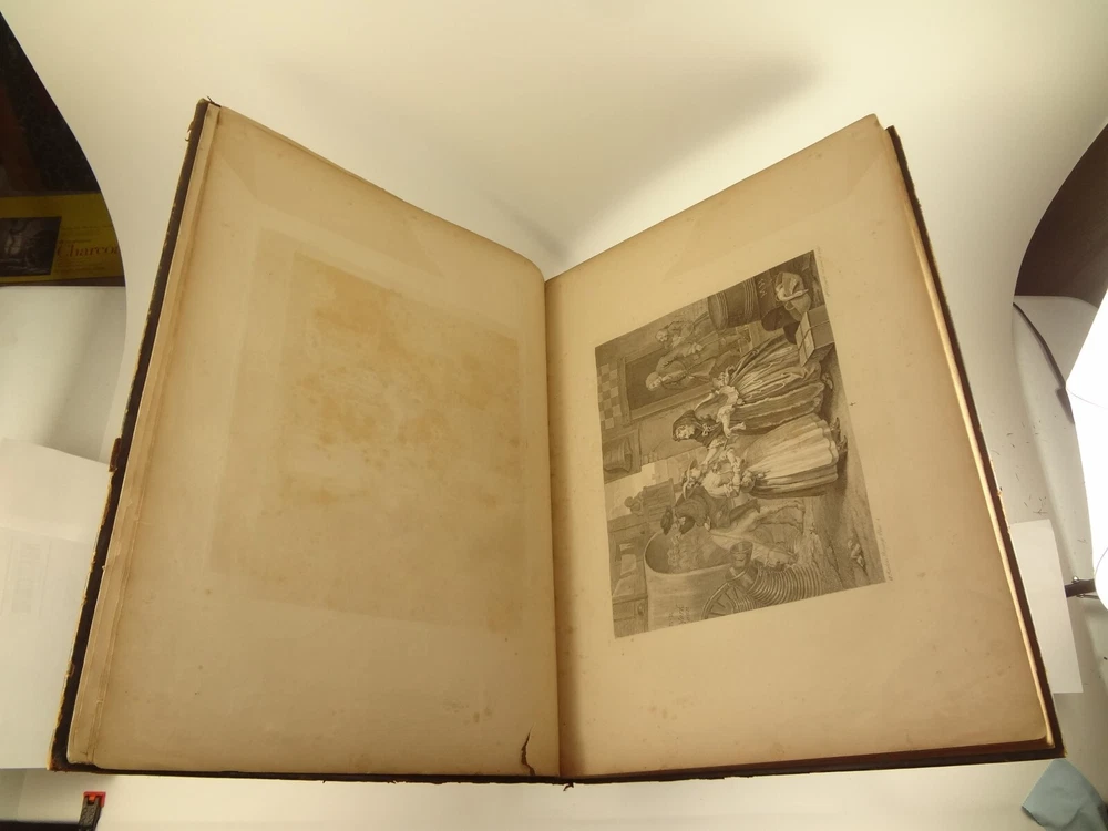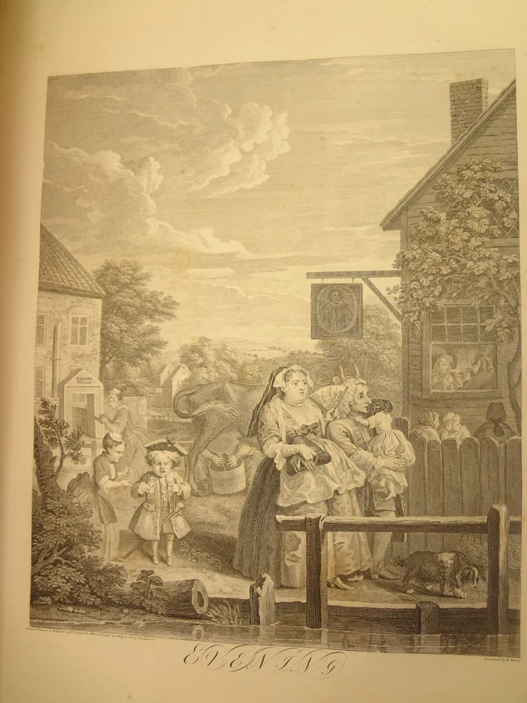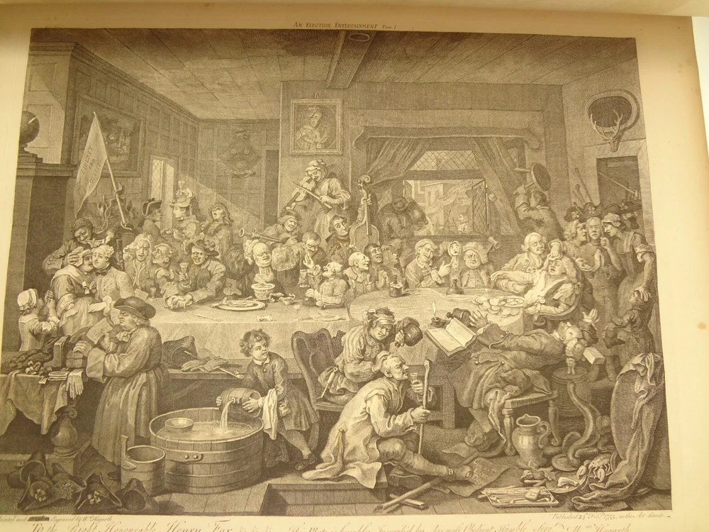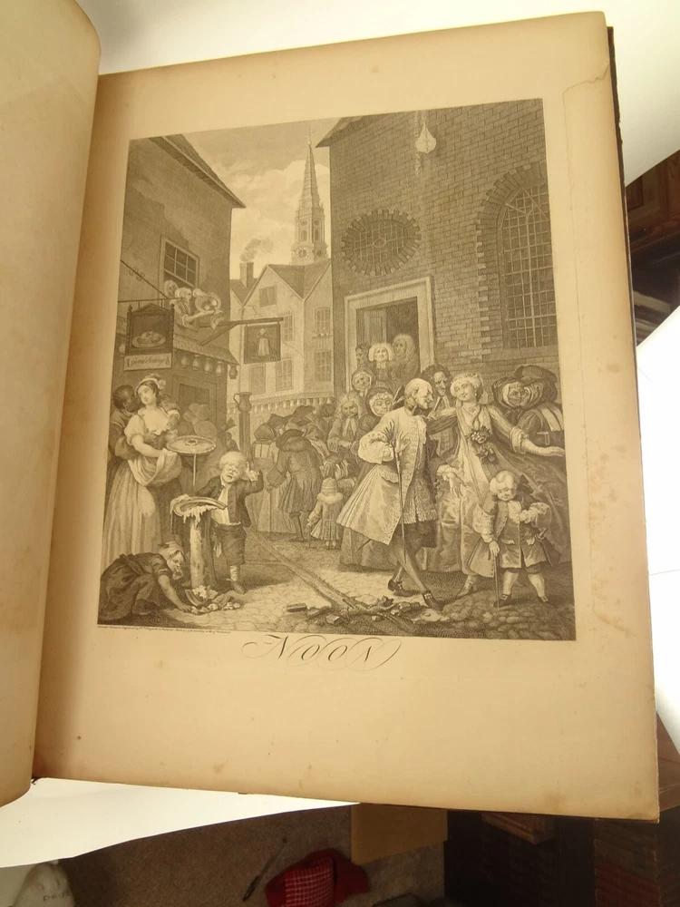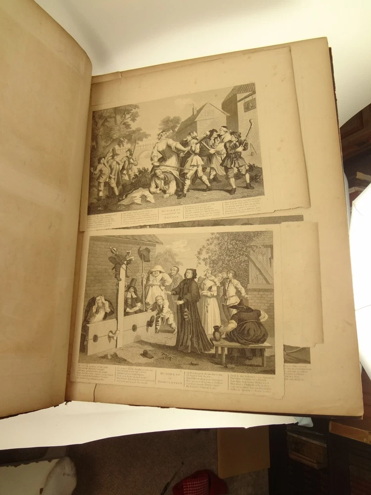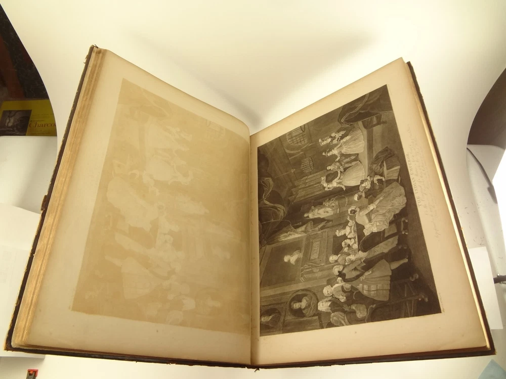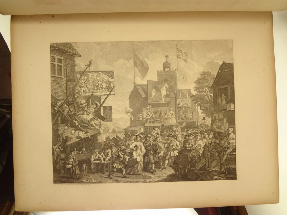 Atlas folio edition of Hogarth's works, printed from the original plates (restored). This imposingly large work measures 25.75" tall at the leaf (by approximately 18.8"). Atlas folio is just slightly larger than elephant folio. Bibliographies record that the original Hogarth plates were at the printer's, Baldwin and Cradock, to produce this impressive work. (p. 188, William Hogarth, Austin Dobson, 1898) This copy is well-worn, and missing five called-for plates (per the index); and likely three "suppressed plates" that bibliographies record being in an envelope at the rear. Still, 110 leaves remain (of 118 leaves). About the Work - This work was first printed in 1822, by Baldwin, Cradock and Joy. It was later reprinted, and Joy was dropped from the publisher's name; this copy is from this later edition. While no date is on the reprint title page, bibliographies place it between 1837 (a date on one of the plates) and 1848 (when a copy appears in Bohn's catalogue). Earlier bibliographers didn't have access to scanned Google Books and I found several advertisements earlier than 1848, placing the date of printing closer to 1837. The 1822 edition had 119 plates. This later edition had three "suppressed plates" at the rear (per bibliographies and Worldcat catalogue entries), and 115 plates listed, adding up to 118 plates total; the three plates at the rear were probably trumped-up as suppressed for this later edition to aid sales (this is pure speculation) as the total number of plates remained nearly the same. About William Hogarth - William Hogarth (1697 – 1764) was an English painter, engraver, pictorial satirist, social critic, editorial cartoonist and occasional writer on art. His work ranges from realistic portraiture to comic strip-like series of pictures called "modern moral subjects", and he is perhaps best known for his series A Harlot's Progress, A Rake's Progress and Marriage A-la-Mode. Knowledge of his work is so pervasive that satirical political illustrations in this style are often referred to as "Hogarthian". Hogarth was born in London to a lower-middle-class family. In his youth he took up an apprenticeship with an engraver, but did not complete the apprenticeship. His father underwent periods of mixed fortune, and was at one time imprisoned in lieu of outstanding debts, an event that is thought to have informed William's paintings and prints with a hard edge. Influenced by French and Italian painting and engraving, Hogarth's works are mostly satirical caricatures, sometimes bawdily sexual, mostly of the first rank of realistic portraiture. They became widely popular and mass-produced via prints in his lifetime, and he was by far the most significant English artist of his generation. Charles Lamb deemed Hogarth's images to be books, filled with "the teeming, fruitful, suggestive meaning of words. Other pictures we look at; his pictures we read." Notes on the Binding - This copy is unique in that it was bound in full-leather for the owner William Buckingham III (his name in gilt at base of spine). Most of the copies are 3/4 leather, and that was probably how they were issued; the reference to a folder of suppressed leaves at the rear indicates that the binding was already on the book when it was sold. William Buckingham III and his wife Ethel (her calling card tucked inside) resided on Vernon Pl. in Cleveland Ohio at the turn-of-the-century. Bibliographic Details - Worldcat OCLC catalogue numbers - 776950147 and 40738662 A Bibliography of William Hogarth, Frank Weitenkempf, page 6, 1890 See earlier note on Dobson printing. Plates Missing - Missing five listed plates, and three "suppressed plates" that bibliographies record being added in a folder at the rear binding. Listed plates from index that are missing: Frontis of Hogarth with Dog Plate 27 Modern Midnight Conversation Plate 48 Strolling Actress Dressing in a Barn Plate 93 The Cockpit Plate 108 The Politician Physical Attributes - Measures approx. 66.75 x 49.25 x 4.75 cm. Leather binding. Boards with frame of gilt decoration; double gilt fillets on outside, leafy sprays in the center, corner florets. Spine with six raised bands; five compartments with a central gilt floret, one compartment with "Hogarth" in gilt. "William Burlingham III" at base of spine in gilt. Leather doublures as pastedowns. Pages - (missing frontis of Hogarth), viiii, 110 plates (of 114), 42 numbered pages of explanation. Condition - See pictures. Wear to binding, with edge and corner wear, rubs. etc. Joints/hinges tender, with some cracking. Chipping at head and tail of spine. Missing five called-for plates, and probably three "suppressed" plates that would be found in original issue (in a pocket at rear); see missing plates list in description. Some dust at gutter. Toned and thumbed throughout. Many page edge chips. Almost all pages have 2-4" tears from bottom-edge, near the gutter, a result of turning the large leaves. Paper was not strong and large size causes tearing; approximately ten leaves with tearing where plate edge contacted paper on printing. Some foxing throughout and occasional small black spots. There is an approx. 1" moisture mark at bottom of gutter, no printing affected. Occasional damp stain from bottom-edge in margin. Hudibras plates 5 and 6 entirely loose. Fore-edge margin plate 2 Four Times missing. Tear in plate 6 and 10 Industry and Idleness. Cruelty in Perfection torn across. 2" tear into Election Entertainment. Gutter tape at Charing the Members. Moisture mark top-edge near rear. 3" tear into bottom of The Staymaker. Moisture mark at gutter margin in rear index of plates. No "suppressed plates", bibliographies note these three were in a folder at the rear of the original release; no mention in index or title page though. Price reflects condition. A desirable edition, pleasing in its large size and reprinting of the original plates, but this copy likely resided in an attic (or similar) for a long period of time and now the