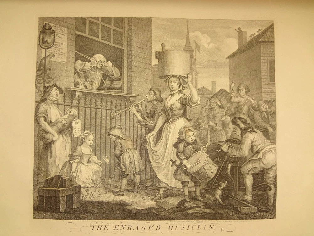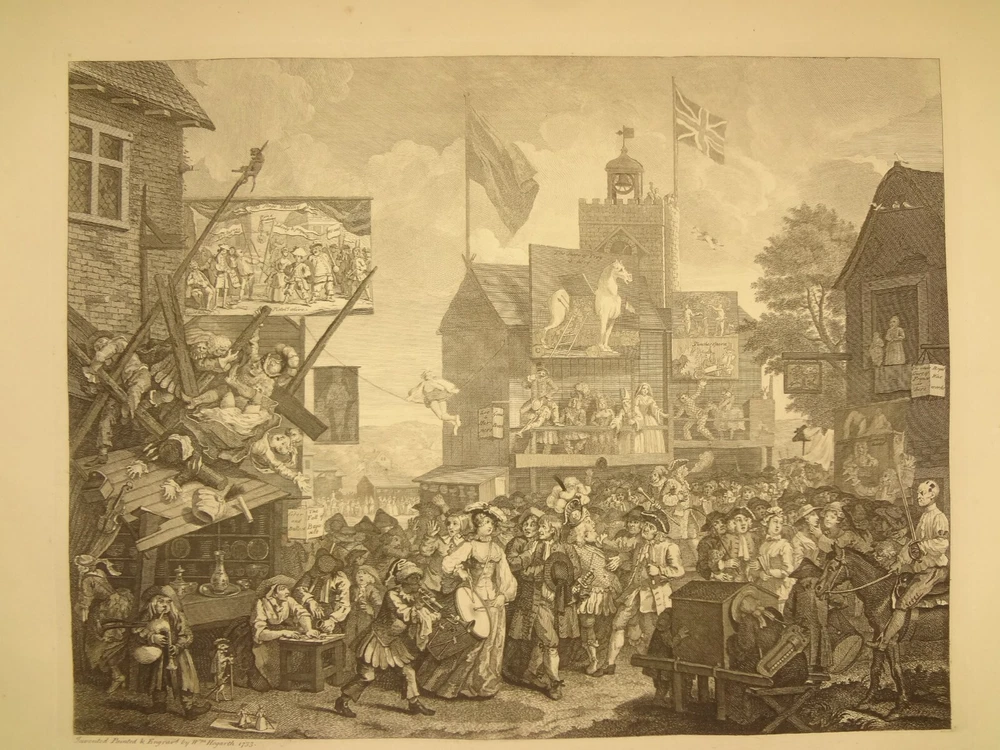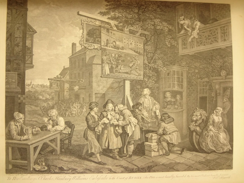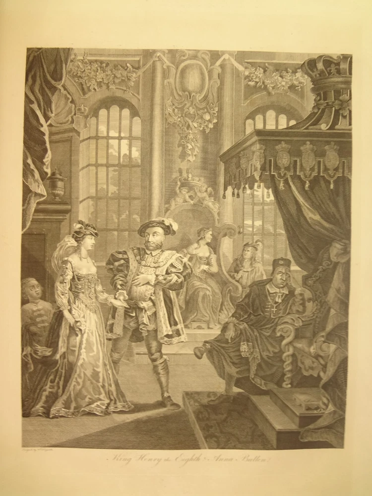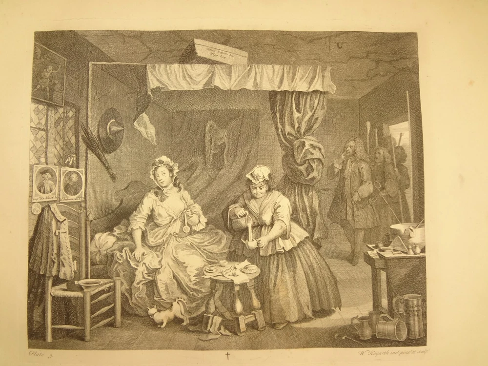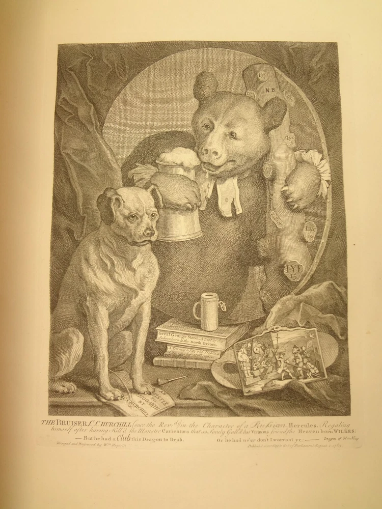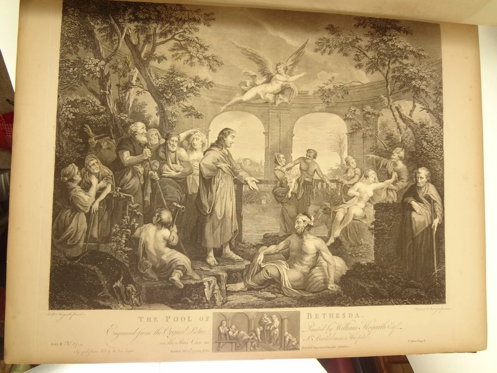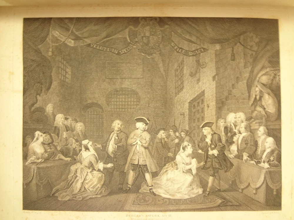 Atlas folio edition of Hogarth's works, printed from the original plates (restored). This imposingly large work measures 25.75" tall at the leaf (by approximately 18.8"). Atlas folio is just slightly larger than elephant folio. Bibliographies record that the original Hogarth plates were at the printer's, Baldwin and Cradock, to produce this impressive work. (p. 188, William Hogarth, Austin Dobson, 1898) This copy is well-worn, and missing five called-for plates (per the index); and likely three "suppressed plates" that bibliographies record being in an envelope at the rear. Still, 110 leaves remain (of 118 leaves). About the Work - This work was first printed in 1822, by Baldwin, Cradock and Joy. It was later reprinted, and Joy was dropped from the publisher's name; this copy is from this later edition. While no date is on the reprint title page, bibliographies place it between 1837 (a date on one of the plates) and 1848 (when a copy appears in Bohn's catalogue). Earlier bibliographers didn't have access to scanned Google Books and I found several advertisements earlier than 1848, placing the date of printing closer to 1837. The 1822 edition had 119 plates. This later edition had three "suppressed plates" at the rear (per bibliographies and Worldcat catalogue entries), and 115 plates listed, adding up to 118 plates total; the three plates at the rear were probably trumped-up as suppressed for this later edition to aid sales (this is pure speculation) as the total number of plates remained nearly the same. About William Hogarth - William Hogarth (1697 – 1764) was an English painter, engraver, pictorial satirist, social critic, editorial cartoonist and occasional writer on art. His work ranges from realistic portraiture to comic strip-like series of pictures called "modern moral subjects", and he is perhaps best known for his series A Harlot's Progress, A Rake's Progress and Marriage A-la-Mode. Knowledge of his work is so pervasive that satirical political illustrations in this style are often referred to as "Hogarthian". Hogarth was born in London to a lower-middle-class family. In his youth he took up an apprenticeship with an engraver, but did not complete the apprenticeship. His father underwent periods of mixed fortune, and was at one time imprisoned in lieu of outstanding debts, an event that is thought to have informed William's paintings and prints with a hard edge. Influenced by French and Italian painting and engraving, Hogarth's works are mostly satirical caricatures, sometimes bawdily sexual, mostly of the first rank of realistic portraiture. They became widely popular and mass-produced via prints in his lifetime, and he was by far the most significant English artist of his generation. Charles Lamb deemed Hogarth's images to be books, filled with "the teeming, fruitful, suggestive meaning of words. Other pictures we look at; his pictures we read." Notes on the Binding - This copy is unique in that it was bound in full-leather for the owner William Buckingham III (his name in gilt at base of spine). Most of the copies are 3/4 leather, and that was probably how they were issued; the reference to a folder of suppressed leaves at the rear indicates that the binding was already on the book when it was sold. William Buckingham III and his wife Ethel (her calling card tucked inside) resided on Vernon Pl. in Cleveland Ohio at the turn-of-the-century. Bibliographic Details - Worldcat OCLC catalogue numbers - 776950147 and 40738662 A Bibliography of William Hogarth, Frank Weitenkempf, page 6, 1890 See earlier note on Dobson printing. Plates Missing - Missing five listed plates, and three "suppressed plates" that bibliographies record being added in a folder at the rear binding. Listed plates from index that are missing: Frontis of Hogarth with Dog Plate 27 Modern Midnight Conversation Plate 48 Strolling Actress Dressing in a Barn Plate 93 The Cockpit Plate 108 The Politician Physical Attributes - Measures approx. 66.75 x 49.25 x 4.75 cm. Leather binding. Boards with frame of gilt decoration; double gilt fillets on outside, leafy sprays in the center, corner florets. Spine with six raised bands; five compartments with a central gilt floret, one compartment with "Hogarth" in gilt. "William Burlingham III" at base of spine in gilt. Leather doublures as pastedowns. Pages - (missing frontis of Hogarth), viiii, 110 plates (of 114), 42 numbered pages of explanation. Condition - See pictures. Wear to binding, with edge and corner wear, rubs. etc. Joints/hinges tender, with some cracking. Chipping at head and tail of spine. Missing five called-for plates, and probably three "suppressed" plates that would be found in original issue (in a pocket at rear); see missing plates list in description. Some dust at gutter. Toned and thumbed throughout. Many page edge chips. Almost all pages have 2-4" tears from bottom-edge, near the gutter, a result of turning the large leaves. Paper was not strong and large size causes tearing; approximately ten leaves with tearing where plate edge contacted paper on printing. Some foxing throughout and occasional small black spots. There is an approx. 1" moisture mark at bottom of gutter, no printing affected. Occasional damp stain from bottom-edge in margin. Hudibras plates 5 and 6 entirely loose. Fore-edge margin plate 2 Four Times missing. Tear in plate 6 and 10 Industry and Idleness. Cruelty in Perfection torn across. 2" tear into Election Entertainment. Gutter tape at Charing the Members. Moisture mark top-edge near rear. 3" tear into bottom of The Staymaker. Moisture mark at gutter margin in rear index of plates. No "suppressed plates", bibliographies note these three were in a folder at the rear of the original release; no mention in index or title page though. Price reflects condition. A desirable edition, pleasing in its large size and reprinting of the original plates, but this copy likely resided in an attic (or similar) for a long period of time and now the