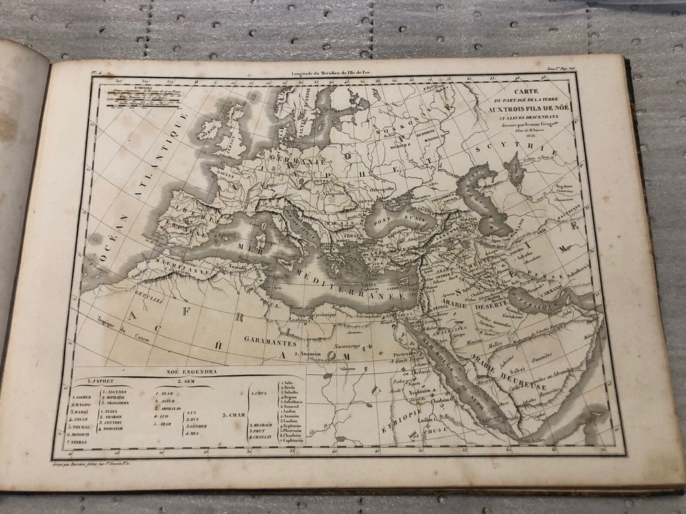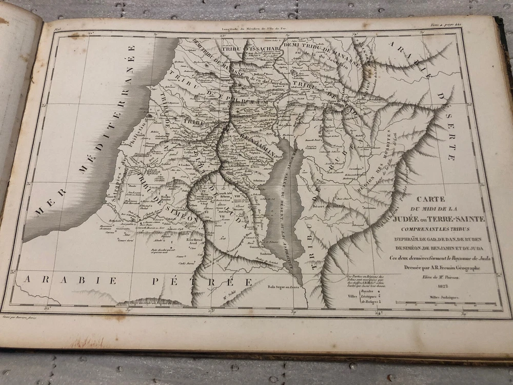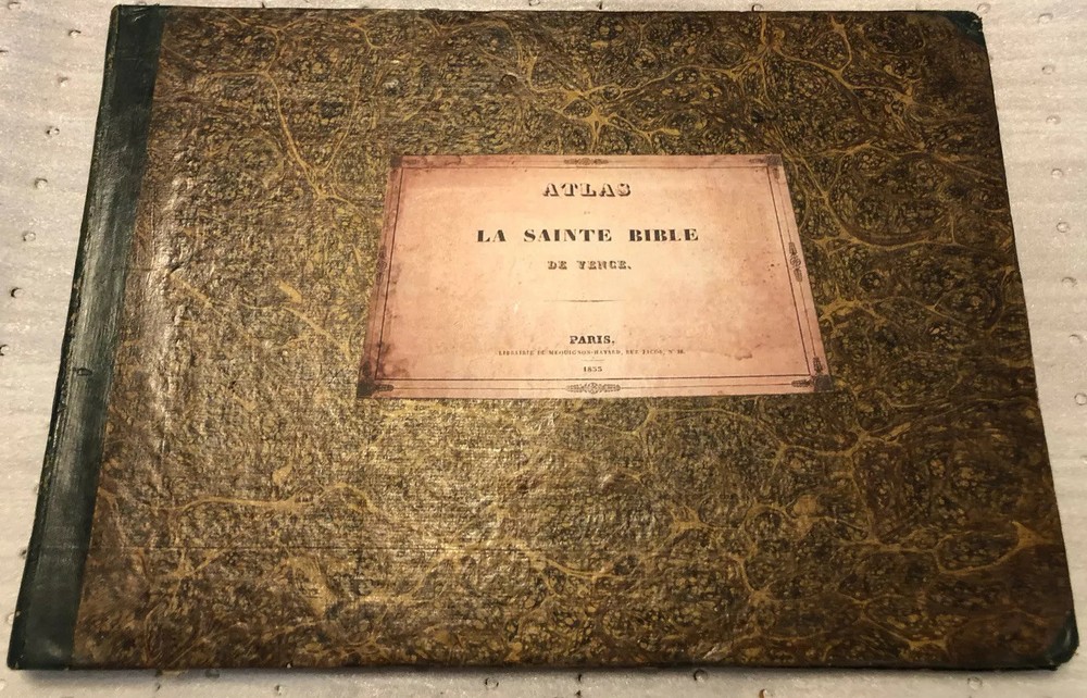 French made entitled ATLAS LA SAINTE BIBLE DE VENCE. TRANSLATION: Atlas of the Holy Bible Vence 1855. Oblong folio. 37 plates; good bindings leather spine with gold lettering. Handwritten note on first blank page: “ by Abbe Vence complete w/ 37 plates, Atlas to La Sainte Bible, Paris 1827 - 1833”. Unmarked image pages with scattered foxing consistent with aging. More pictures available. AbeBooks.fr is selling this Atlas for over 500 Euros! FREE shipping in USA.