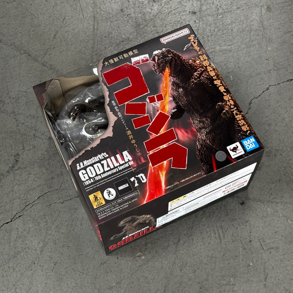 Product Description To commemorate the 70th anniversary of "Godzilla," Godzilla (1954) is now available in S.H.MonsterArts, painted in the poster color image! The figure has been sculpted and colored by Yuji Sakai, the leading Godzilla sculptor. Product Features Approx. 5.91 inches (15cm) Made of PVC and ABS Based on the Godzilla (1954) film Part of the S.H.MonsterArts series Celebrates the 70th anniversary Highly detailed Box Contents Godzilla figure Pair of interchangeable hand parts Radiation heat ray effect parts 2 Airplane parts Stand