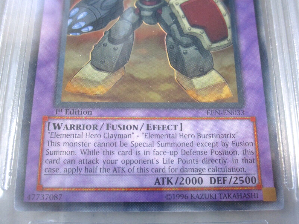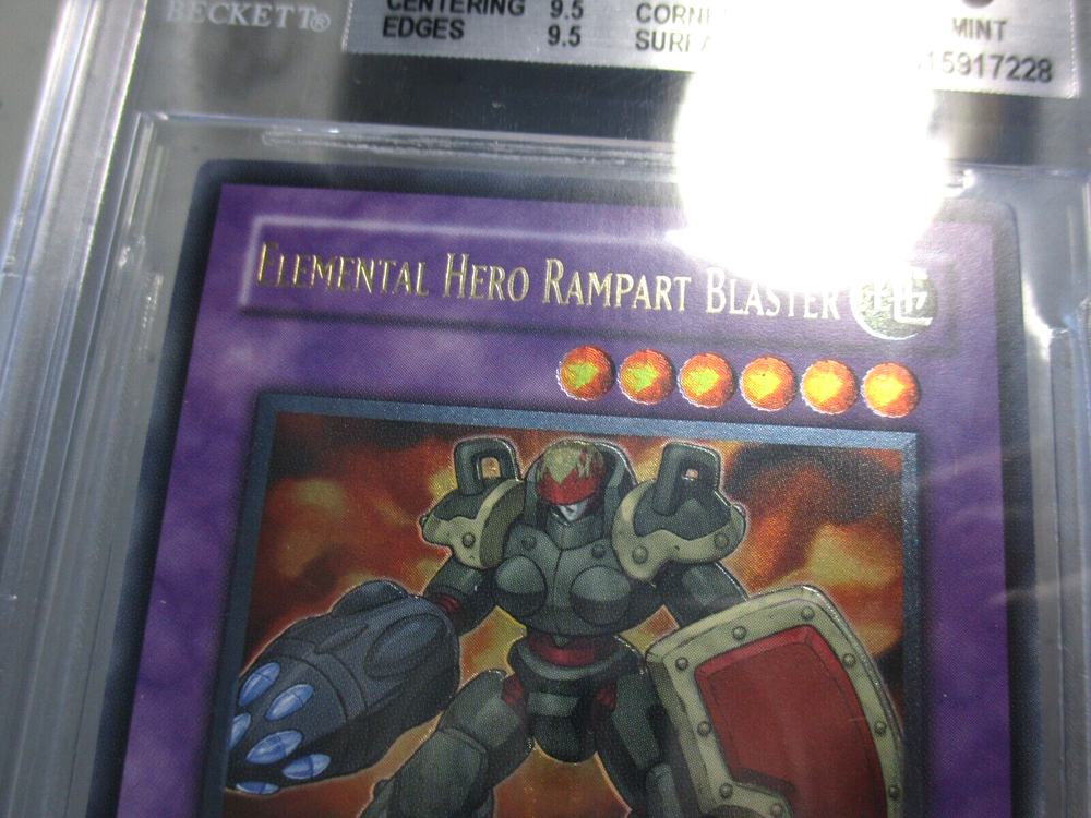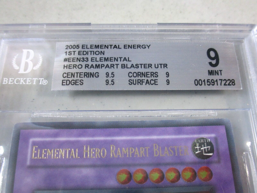 ITEM: Elemental Hero Rampart Blaster - EEN-EN033 1st Edition Ultimate Rare - English Note: This card was personally pulled from pack to sleeve, and has been sitting in my binder for nearly two decades. I got it graded in 2023. CONDITION: BGS 9 mint Same day handling when paid before 12 CST. I ship every day except Sundays.