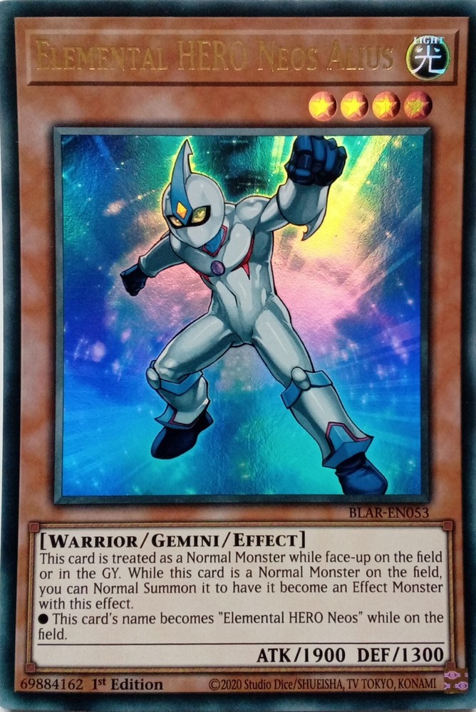 BLAR-EN053 ELEMENTAL HERO NEOS ALIUS ULTRA RARE 1ST EDITION ALL YU-GI-OH CARDS I SELL ARE KONAMI TOURNAMENT LEGAL. CARDS ARE ALL NEAR MINT TO LIGHTLY PLAYED CONDITION POSTAGE IS FREE SO YOU CAN BUY AS MANY CARDS AS YOU WANT FROM US AND NOT PAY A PENNY POSTAGE. IF YOU HAVE ANY QUESTIONS PLEASE FEEL FREE TO CONTACT ME. Track Page Views Wi4.9 Auctiva's FREE Counter