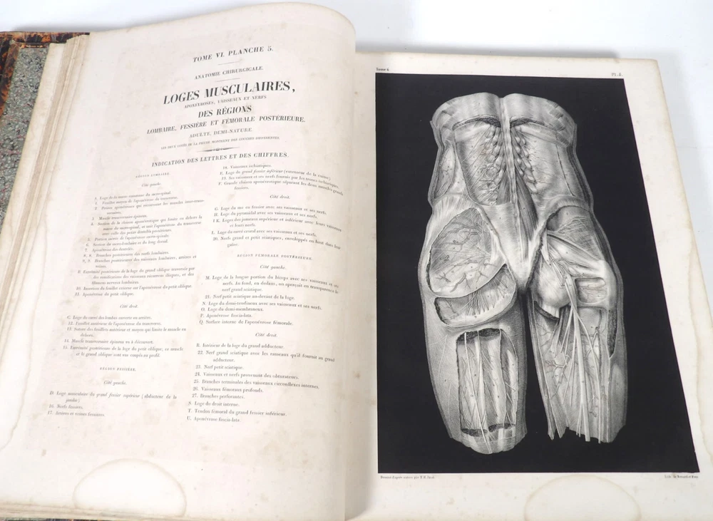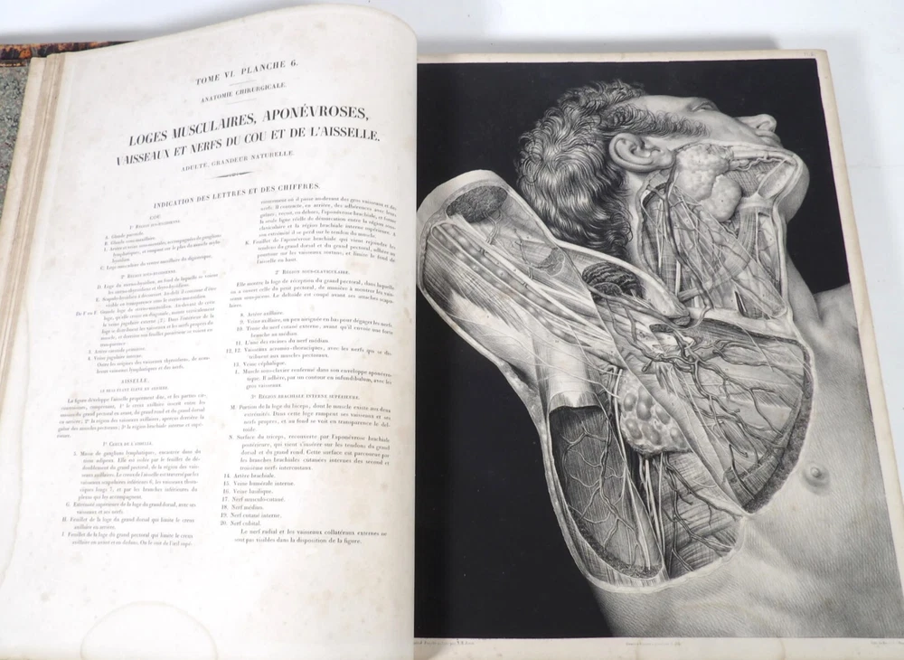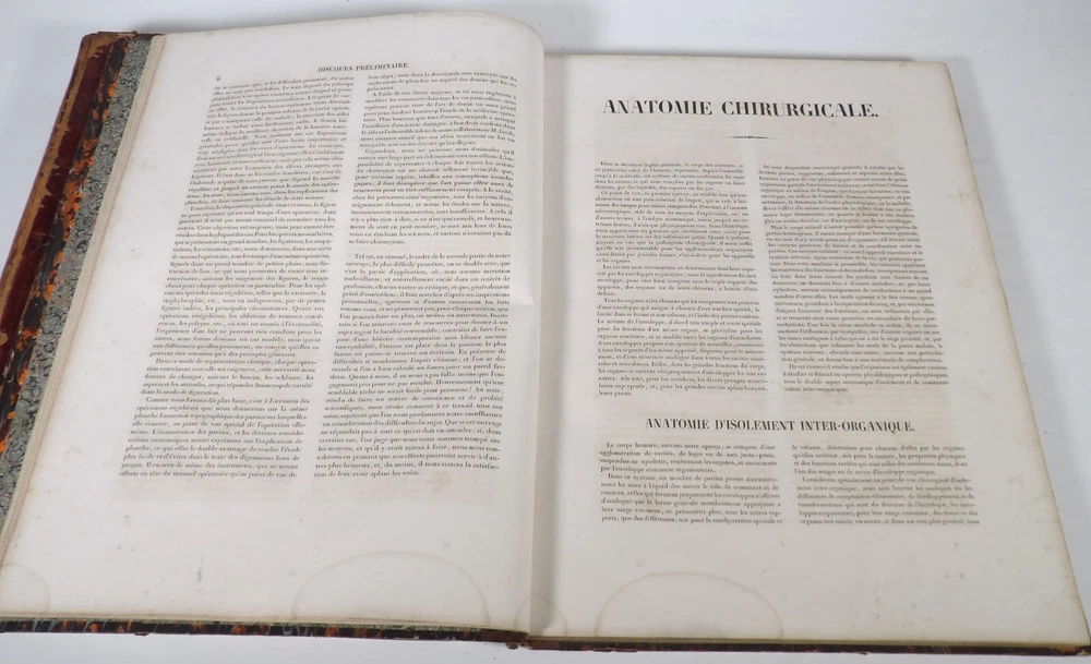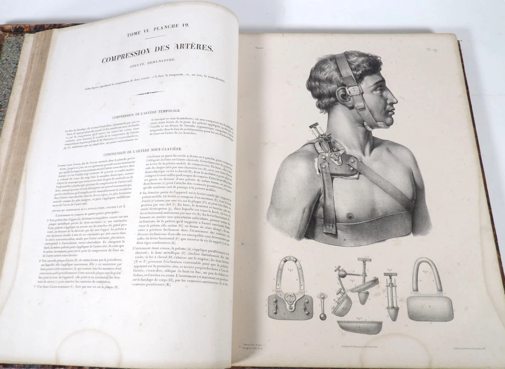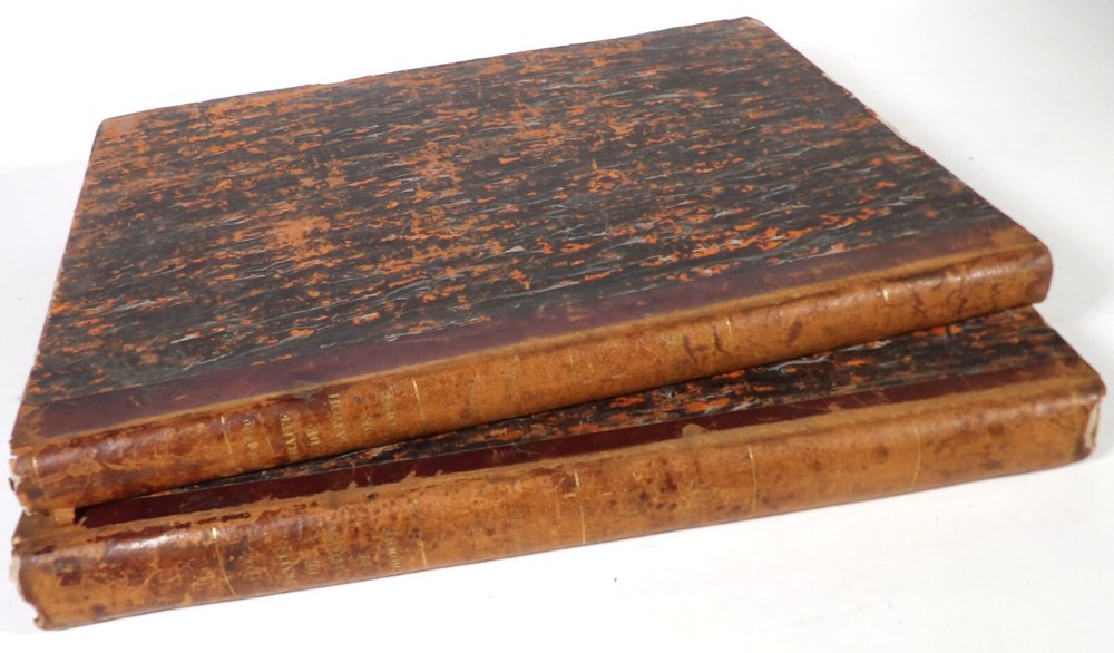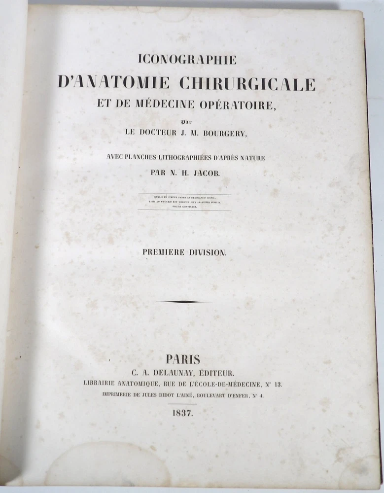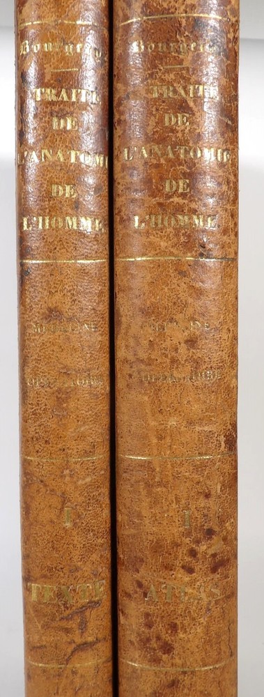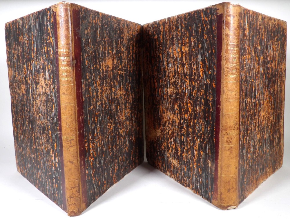 Please consult the conditions of sale at the end of the description before any purchase. Bourgery, J [Ean] .M [Arc]., Doctor; Jacob, n [iColas] .H [Enri]. Leveille, JB; Hublier, ch. Complete treaty of man's anatomy comprising operating medicine, with lithographed boards from nature. Sixth volume: operating medicine. [Text] & iconography of surgical anatomy and operating medicine. First division. [Atlas]. Paris, Ca Delaunay publisher, anatomical bookstore, printing of Jules Didot L'Aîné, Imprimerie Lemercier, Bernard et Cie, 1837. 2 volumes [text + atlas]. Folio , 33 x 43.5 cm. Havana half-basin binding , smooth back decorated with nets, titles and golden tomaisons, dishes of marbled paper. Text: 280 pp. ; Atlas: 1 f. (title), 85 p. and 93 plates. Original edition of this volume VI of the treaty (...) of the anatomy of man dedicated to operating medicine, whose atlas is decorated with 93 lithographed boards (in black). This "monument" of medicine remains an essential work, still sought after today. Very rubbed bindings, damaged headdresses and with gaps (Atlas), freckles and brown pages, marginal wetting (gutter and tail) without consequences on the boards in the volume of Atlas, otherwise Solid copy. Bourgery and Jacob's work holds a special place in the history of anatomical atlas. -Put its duration: the publication continued for about 40 years, if we add to the first edition by Delaunay (1831-1854), that of Louis Guérin, enriched with numerous supplements from 1867 to 1871. -Put his perspectives: fully drawn from nature, from dissections, it aims not only to renew the iconography of the human body, but in addition to carry an educational dimension. Thus the part dedicated to operating medicine details the material, the procedures, the required gestures and the anatomical regions concerned for the various operations, carefully described. -Put the mobilization of many actors and trades (anatomists, prosectors, doctors, designers, lithographers, technicians, printers, publishers, patrons, booksellers, etc.), under the leadership of the two project managers, the anatomist doctor Jean -Marc Bourgery and the painter-designer-lithographer Nicolas-Henri Jacob, who play an unprecedented complementary role. Extreme precision and technical quality that is as much aesthetic and scientific of the boards have considerably marked contemporaries, who have readily called it as "masterpieces". "Let us say here that Mr. Bourgery's work is one of the most beautiful that our century will be glorified. To all the facts that the most in -depth historical knowledge could reveal to him, the author joins their own discoveries; And he had the talent of bringing the attention of anatomists back to particularities seen by former authors, but forgotten, or even rejected, by observers less attentive than him. »Ph. The bottom, "Bougery (JM)", in the universe. France: encyclopedic dictionary, vol. 3, Paris, Firmin Didot Frères, 1840-1845, p. 247. Jean-Baptiste Marc Bourgery , born in Orleans in 1797 and died in Paris in 1849, entered the School of Medicine in Paris in 1811. Brilliant pupil of Lamarck and Laennec, external in 1815, internal the following year, he obtained in 1819, the gold medal of the hospitals of Paris. After practicing as a health officer in a copper foundry near Rouen, at the end of his boarding school, he returned to Paris in 1827. He then supported his doctoral thesis on "the use of circular ligatures of members in most periodic diseases", which he dedicated to Guillaume Dupuytren, his mentor. The publication of this work, as well as that of a treaty of small surgery (1828), met with some success. It was thanks to the patronage of Baron Benjamin Delessert that he can then undertake, from 1829, his major work, the complete treaty of the anatomy of man, published between 1831 and 1854 (the last volume, as posthumous), hailed by his peers and many intellectual and artistic personalities (Cuvier, Michelet, Delécluze, Claude Bernard, Hirschfeld…). During the last twenty years of his life, while devoting himself essentially to this monumental work, he studied breathing, the nervous system, the structures of lungs, heart, spleen, thyroid, etc. In addition, Doctor Félix Thibert had entrusted him with the direction of the museum of imitative anatomy, which he had founded on rue du Montparnasse: he produced certain pieces of cardboard, in order to specify and modernize the representations of various visceral lesions ( Until then made in wax). Unhappy candidate in several prestigious positions or functions, he confesses his bitterness towards this lack of recognition in the eighth volume of the treaty ("Today, after twenty years, I am nothing and I'm not waiting Nothing. I'm finished with this singular revelation: it is the cry of twenty years of oppression that escapes me. Also I give my example to flee, if there was some reckless ready to be seduced, as I did, by an inconsiderate love of science. At least he will learn from me that the conscientious work leads to anything. Let me forgive me for this complaint, it is the first, it will also be the last. [Pp. II-III]). Bourgery died in Passy, in June 1849, at the age of 52, victim of cholera. Nicolas-Henri Jacob (Paris, 1782-1871) , grandson of painter and son of a carpenter, cousin of the famous cabinetmaker Georges Jacob, is the pupil in painting by Jacques-Louis David, in sculpture, Dupasquier and Morgan. Entering the service of Eugène de Beauharnais, in Milan, as a courtyard (between 1805 and 1814), he also made himself known in the drawing and the design of furniture, in particular for Marie Desarnaud or the Duchess of Berry. Back in France, in 1830 he opened his own drawing lesson in Paris in 1830, after having taught this art to the National Veterinary School of Alfort. Nevertheless, he was passionate very early for lithography, a new technique, and frequently exhibits his works with lounges under restoration (gold medal in 1834). From 1831