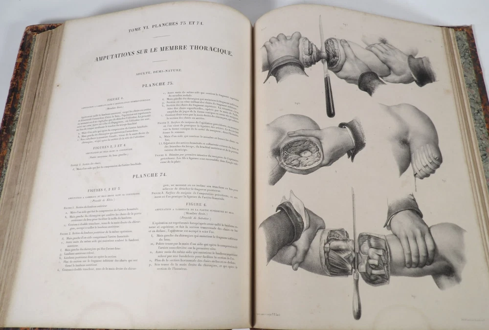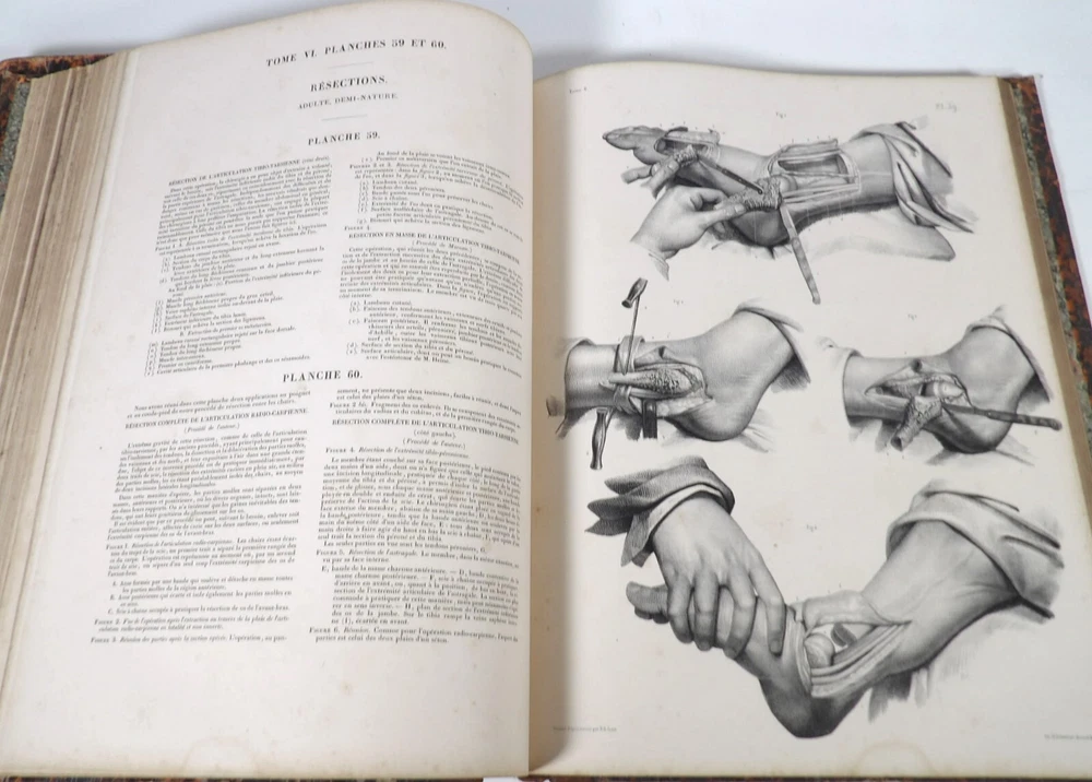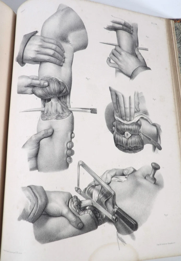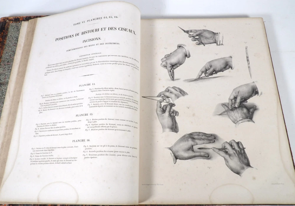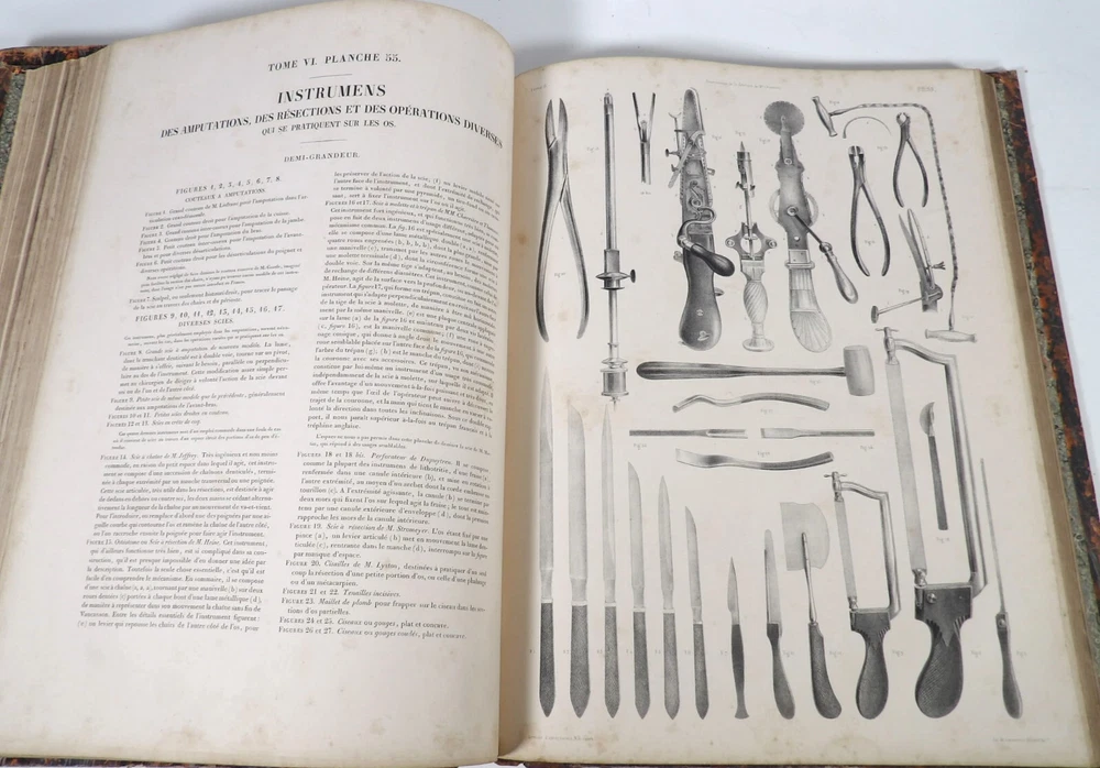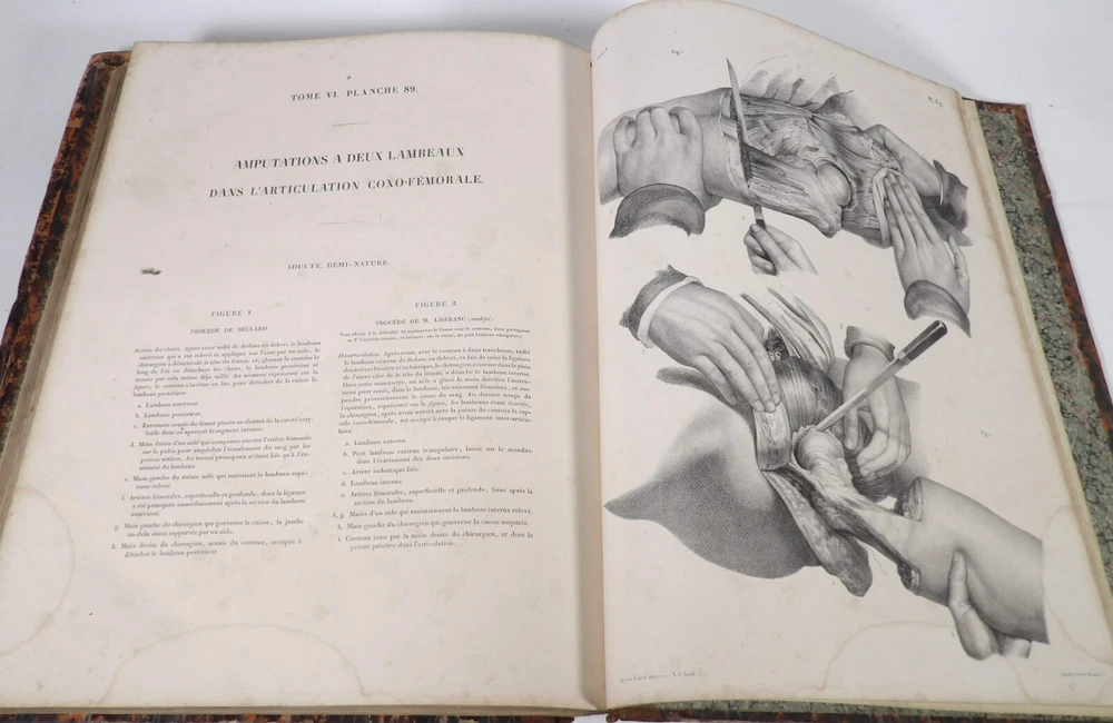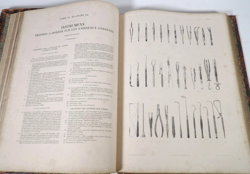 Please consult the conditions of sale at the end of the description before any purchase. Bourgery, J [Ean] .M [Arc]., Doctor; Jacob, n [iColas] .H [Enri]. Leveille, JB; Hublier, ch. Complete treaty of man's anatomy comprising operating medicine, with lithographed boards from nature. Sixth volume: operating medicine. [Text] & iconography of surgical anatomy and operating medicine. First division. [Atlas]. Paris, Ca Delaunay publisher, anatomical bookstore, printing of Jules Didot L'Aîné, Imprimerie Lemercier, Bernard et Cie, 1837. 2 volumes [text + atlas]. Folio , 33 x 43.5 cm. Havana half-basin binding , smooth back decorated with nets, titles and golden tomaisons, dishes of marbled paper. Text: 280 pp. ; Atlas: 1 f. (title), 85 p. and 93 plates. Original edition of this volume VI of the treaty (...) of the anatomy of man dedicated to operating medicine, whose atlas is decorated with 93 lithographed boards (in black). This "monument" of medicine remains an essential work, still sought after today. Very rubbed bindings, damaged headdresses and with gaps (Atlas), freckles and brown pages, marginal wetting (gutter and tail) without consequences on the boards in the volume of Atlas, otherwise Solid copy. Bourgery and Jacob's work holds a special place in the history of anatomical atlas. -Put its duration: the publication continued for about 40 years, if we add to the first edition by Delaunay (1831-1854), that of Louis Guérin, enriched with numerous supplements from 1867 to 1871. -Put his perspectives: fully drawn from nature, from dissections, it aims not only to renew the iconography of the human body, but in addition to carry an educational dimension. Thus the part dedicated to operating medicine details the material, the procedures, the required gestures and the anatomical regions concerned for the various operations, carefully described. -Put the mobilization of many actors and trades (anatomists, prosectors, doctors, designers, lithographers, technicians, printers, publishers, patrons, booksellers, etc.), under the leadership of the two project managers, the anatomist doctor Jean -Marc Bourgery and the painter-designer-lithographer Nicolas-Henri Jacob, who play an unprecedented complementary role. Extreme precision and technical quality that is as much aesthetic and scientific of the boards have considerably marked contemporaries, who have readily called it as "masterpieces". "Let us say here that Mr. Bourgery's work is one of the most beautiful that our century will be glorified. To all the facts that the most in -depth historical knowledge could reveal to him, the author joins their own discoveries; And he had the talent of bringing the attention of anatomists back to particularities seen by former authors, but forgotten, or even rejected, by observers less attentive than him. »Ph. The bottom, "Bougery (JM)", in the universe. France: encyclopedic dictionary, vol. 3, Paris, Firmin Didot Frères, 1840-1845, p. 247. Jean-Baptiste Marc Bourgery , born in Orleans in 1797 and died in Paris in 1849, entered the School of Medicine in Paris in 1811. Brilliant pupil of Lamarck and Laennec, external in 1815, internal the following year, he obtained in 1819, the gold medal of the hospitals of Paris. After practicing as a health officer in a copper foundry near Rouen, at the end of his boarding school, he returned to Paris in 1827. He then supported his doctoral thesis on "the use of circular ligatures of members in most periodic diseases", which he dedicated to Guillaume Dupuytren, his mentor. The publication of this work, as well as that of a treaty of small surgery (1828), met with some success. It was thanks to the patronage of Baron Benjamin Delessert that he can then undertake, from 1829, his major work, the complete treaty of the anatomy of man, published between 1831 and 1854 (the last volume, as posthumous), hailed by his peers and many intellectual and artistic personalities (Cuvier, Michelet, Delécluze, Claude Bernard, Hirschfeld…). During the last twenty years of his life, while devoting himself essentially to this monumental work, he studied breathing, the nervous system, the structures of lungs, heart, spleen, thyroid, etc. In addition, Doctor Félix Thibert had entrusted him with the direction of the museum of imitative anatomy, which he had founded on rue du Montparnasse: he produced certain pieces of cardboard, in order to specify and modernize the representations of various visceral lesions ( Until then made in wax). Unhappy candidate in several prestigious positions or functions, he confesses his bitterness towards this lack of recognition in the eighth volume of the treaty ("Today, after twenty years, I am nothing and I'm not waiting Nothing. I'm finished with this singular revelation: it is the cry of twenty years of oppression that escapes me. Also I give my example to flee, if there was some reckless ready to be seduced, as I did, by an inconsiderate love of science. At least he will learn from me that the conscientious work leads to anything. Let me forgive me for this complaint, it is the first, it will also be the last. [Pp. II-III]). Bourgery died in Passy, in June 1849, at the age of 52, victim of cholera. Nicolas-Henri Jacob (Paris, 1782-1871) , grandson of painter and son of a carpenter, cousin of the famous cabinetmaker Georges Jacob, is the pupil in painting by Jacques-Louis David, in sculpture, Dupasquier and Morgan. Entering the service of Eugène de Beauharnais, in Milan, as a courtyard (between 1805 and 1814), he also made himself known in the drawing and the design of furniture, in particular for Marie Desarnaud or the Duchess of Berry. Back in France, in 1830 he opened his own drawing lesson in Paris in 1830, after having taught this art to the National Veterinary School of Alfort. Nevertheless, he was passionate very early for lithography, a new technique, and frequently exhibits his works with lounges under restoration (gold medal in 1834). From 1831
