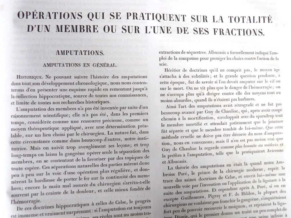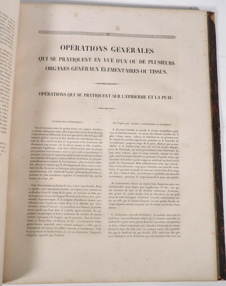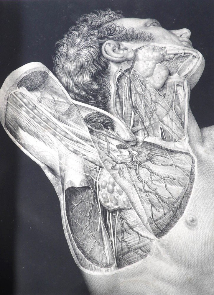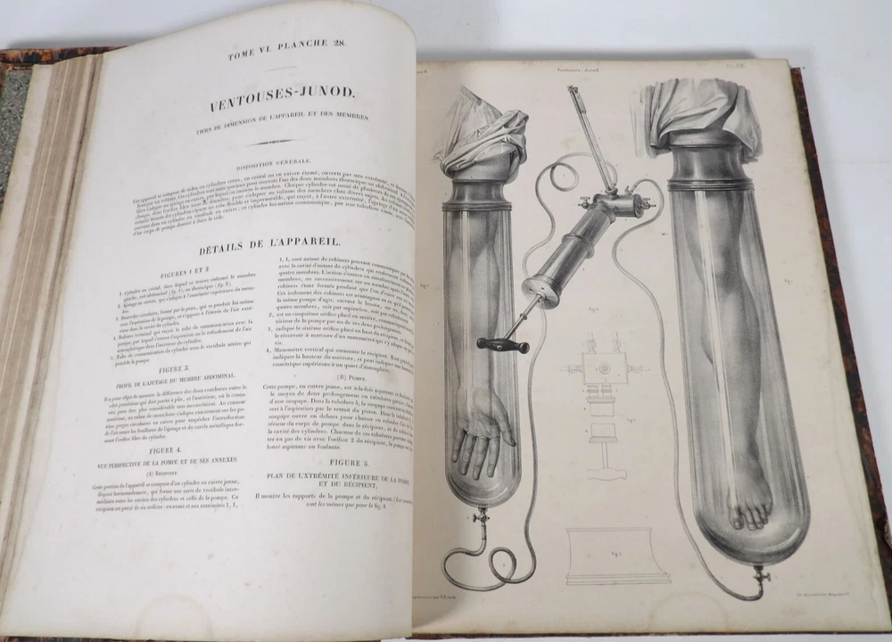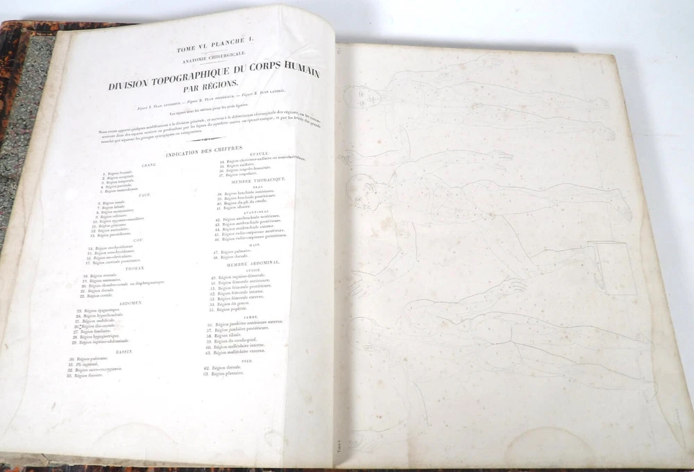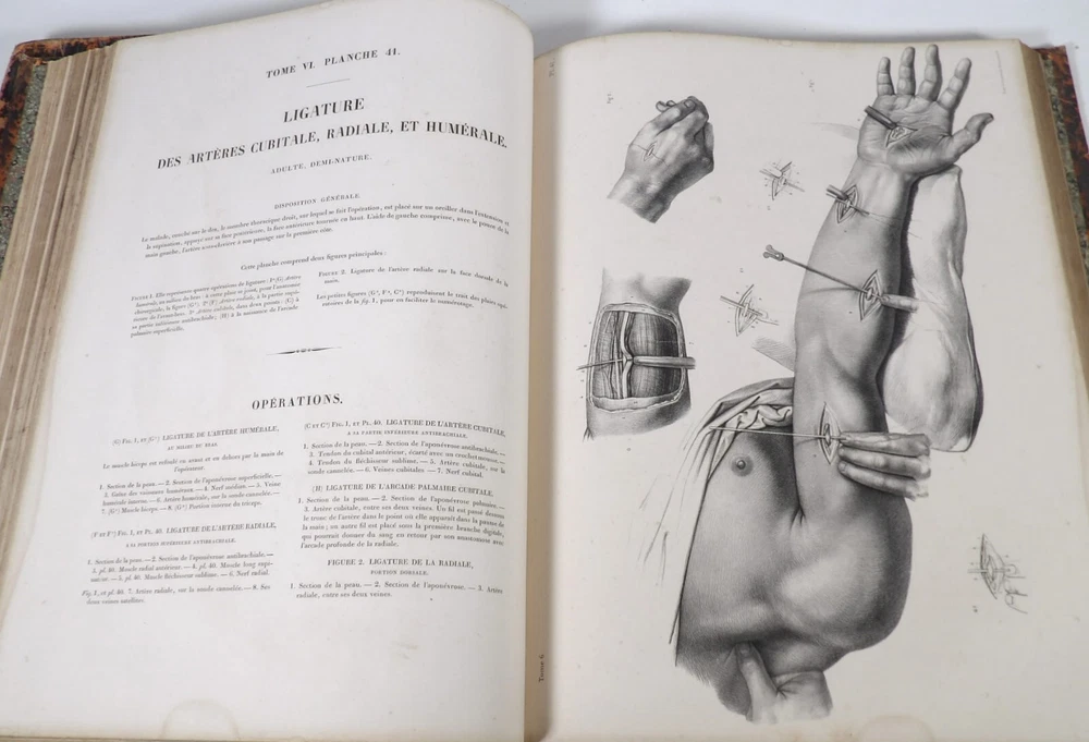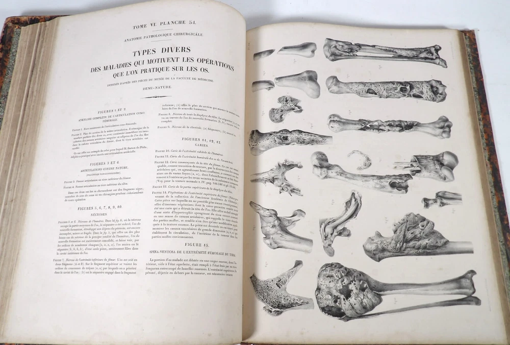 Please consult the conditions of sale at the end of the description before any purchase. Bourgery, J [Ean] .M [Arc]., Doctor; Jacob, n [iColas] .H [Enri]. Leveille, JB; Hublier, ch. Complete treaty of man's anatomy comprising operating medicine, with lithographed boards from nature. Sixth volume: operating medicine. [Text] & iconography of surgical anatomy and operating medicine. First division. [Atlas]. Paris, Ca Delaunay publisher, anatomical bookstore, printing of Jules Didot L'Aîné, Imprimerie Lemercier, Bernard et Cie, 1837. 2 volumes [text + atlas]. Folio , 33 x 43.5 cm. Havana half-basin binding , smooth back decorated with nets, titles and golden tomaisons, dishes of marbled paper. Text: 280 pp. ; Atlas: 1 f. (title), 85 p. and 93 plates. Original edition of this volume VI of the treaty (...) of the anatomy of man dedicated to operating medicine, whose atlas is decorated with 93 lithographed boards (in black). This "monument" of medicine remains an essential work, still sought after today. Very rubbed bindings, damaged headdresses and with gaps (Atlas), freckles and brown pages, marginal wetting (gutter and tail) without consequences on the boards in the volume of Atlas, otherwise Solid copy. Bourgery and Jacob's work holds a special place in the history of anatomical atlas. -Put its duration: the publication continued for about 40 years, if we add to the first edition by Delaunay (1831-1854), that of Louis Guérin, enriched with numerous supplements from 1867 to 1871. -Put his perspectives: fully drawn from nature, from dissections, it aims not only to renew the iconography of the human body, but in addition to carry an educational dimension. Thus the part dedicated to operating medicine details the material, the procedures, the required gestures and the anatomical regions concerned for the various operations, carefully described. -Put the mobilization of many actors and trades (anatomists, prosectors, doctors, designers, lithographers, technicians, printers, publishers, patrons, booksellers, etc.), under the leadership of the two project managers, the anatomist doctor Jean -Marc Bourgery and the painter-designer-lithographer Nicolas-Henri Jacob, who play an unprecedented complementary role. Extreme precision and technical quality that is as much aesthetic and scientific of the boards have considerably marked contemporaries, who have readily called it as "masterpieces". "Let us say here that Mr. Bourgery's work is one of the most beautiful that our century will be glorified. To all the facts that the most in -depth historical knowledge could reveal to him, the author joins their own discoveries; And he had the talent of bringing the attention of anatomists back to particularities seen by former authors, but forgotten, or even rejected, by observers less attentive than him. »Ph. The bottom, "Bougery (JM)", in the universe. France: encyclopedic dictionary, vol. 3, Paris, Firmin Didot Frères, 1840-1845, p. 247. Jean-Baptiste Marc Bourgery , born in Orleans in 1797 and died in Paris in 1849, entered the School of Medicine in Paris in 1811. Brilliant pupil of Lamarck and Laennec, external in 1815, internal the following year, he obtained in 1819, the gold medal of the hospitals of Paris. After practicing as a health officer in a copper foundry near Rouen, at the end of his boarding school, he returned to Paris in 1827. He then supported his doctoral thesis on "the use of circular ligatures of members in most periodic diseases", which he dedicated to Guillaume Dupuytren, his mentor. The publication of this work, as well as that of a treaty of small surgery (1828), met with some success. It was thanks to the patronage of Baron Benjamin Delessert that he can then undertake, from 1829, his major work, the complete treaty of the anatomy of man, published between 1831 and 1854 (the last volume, as posthumous), hailed by his peers and many intellectual and artistic personalities (Cuvier, Michelet, Delécluze, Claude Bernard, Hirschfeld…). During the last twenty years of his life, while devoting himself essentially to this monumental work, he studied breathing, the nervous system, the structures of lungs, heart, spleen, thyroid, etc. In addition, Doctor Félix Thibert had entrusted him with the direction of the museum of imitative anatomy, which he had founded on rue du Montparnasse: he produced certain pieces of cardboard, in order to specify and modernize the representations of various visceral lesions ( Until then made in wax). Unhappy candidate in several prestigious positions or functions, he confesses his bitterness towards this lack of recognition in the eighth volume of the treaty ("Today, after twenty years, I am nothing and I'm not waiting Nothing. I'm finished with this singular revelation: it is the cry of twenty years of oppression that escapes me. Also I give my example to flee, if there was some reckless ready to be seduced, as I did, by an inconsiderate love of science. At least he will learn from me that the conscientious work leads to anything. Let me forgive me for this complaint, it is the first, it will also be the last. [Pp. II-III]). Bourgery died in Passy, in June 1849, at the age of 52, victim of cholera. Nicolas-Henri Jacob (Paris, 1782-1871) , grandson of painter and son of a carpenter, cousin of the famous cabinetmaker Georges Jacob, is the pupil in painting by Jacques-Louis David, in sculpture, Dupasquier and Morgan. Entering the service of Eugène de Beauharnais, in Milan, as a courtyard (between 1805 and 1814), he also made himself known in the drawing and the design of furniture, in particular for Marie Desarnaud or the Duchess of Berry. Back in France, in 1830 he opened his own drawing lesson in Paris in 1830, after having taught this art to the National Veterinary School of Alfort. Nevertheless, he was passionate very early for lithography, a new technique, and frequently exhibits his works with lounges under restoration (gold medal in 1834). From 1831