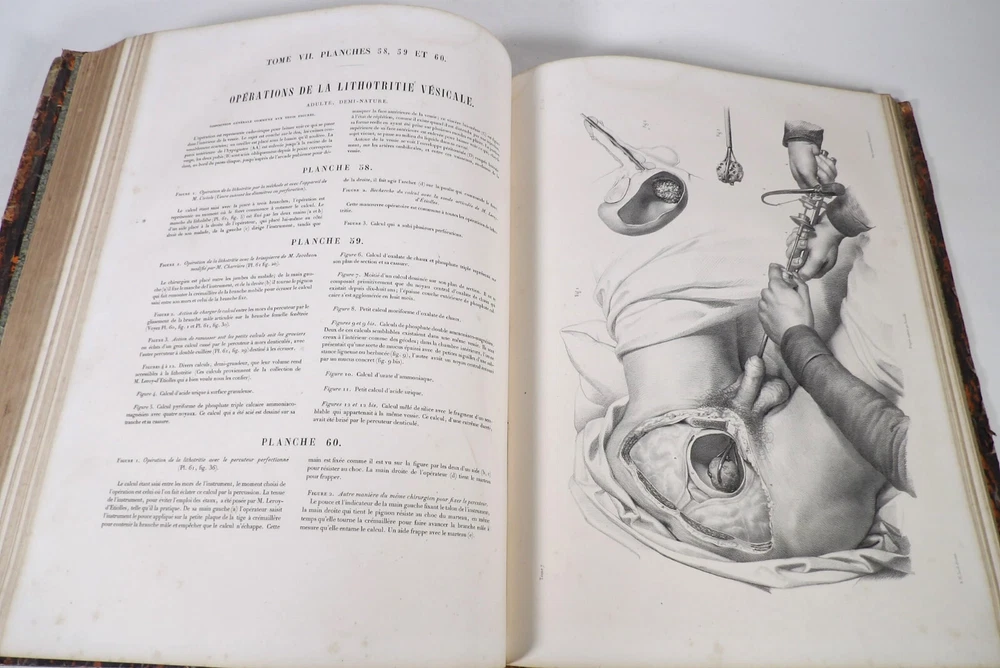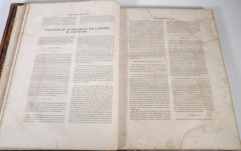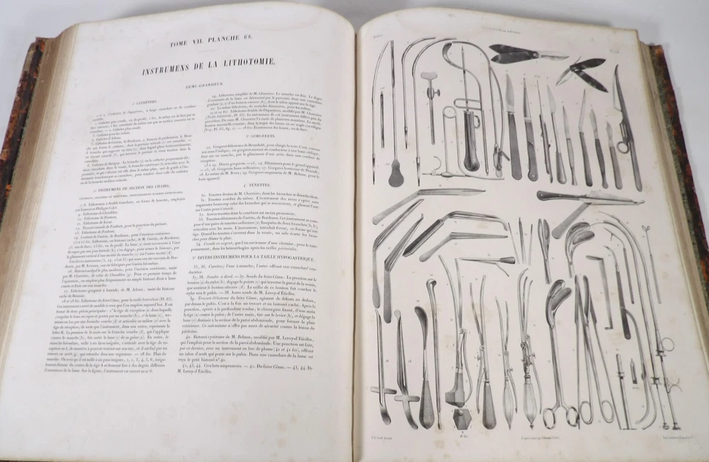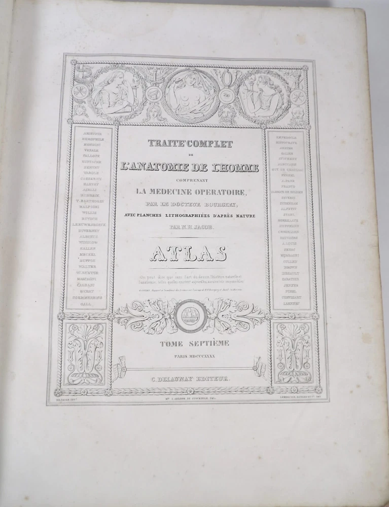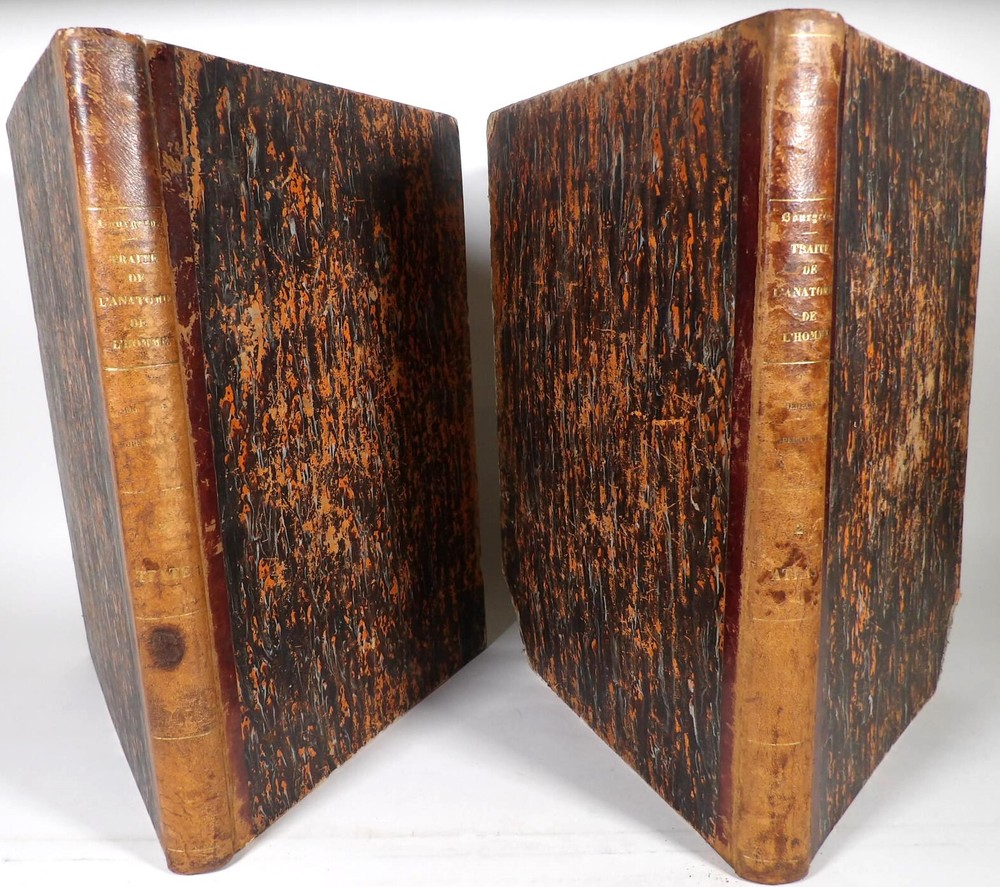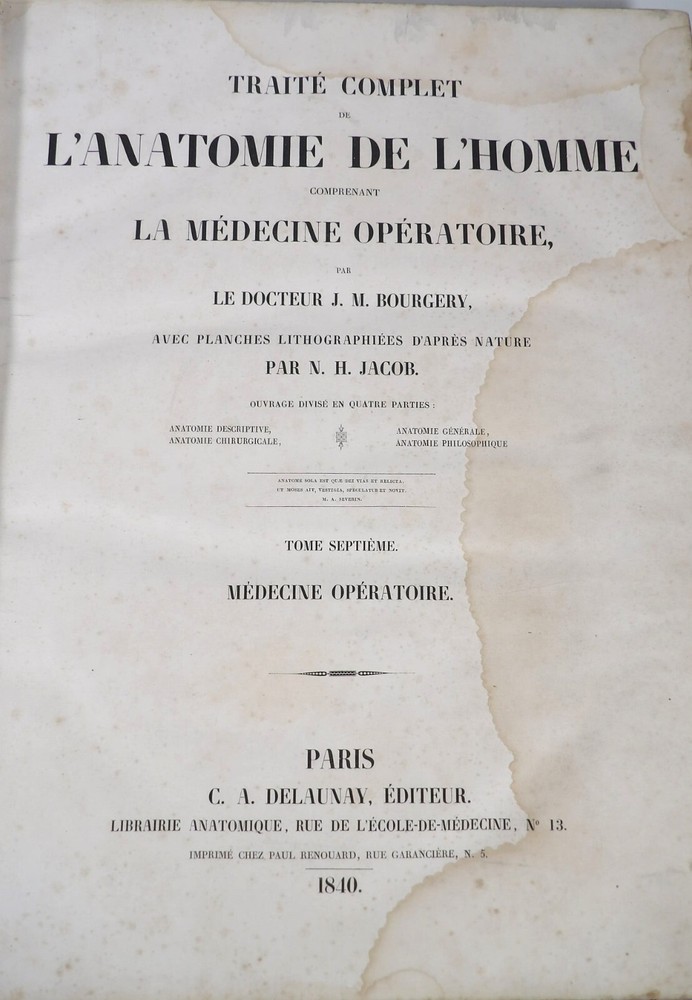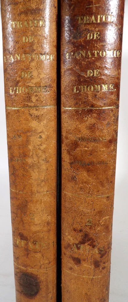 Please consult the conditions of sale at the end of the description before purchasing. BOURGERY, J[ean].M[arc]., Doctor; JACOB, N[icolas].H[enri]. LEVEILLE, JB; HUBLIER, Ch. Complete treatise on human anatomy including operative medicine, with lithographed plates from nature. Seventh volume: Operative medicine. Supplement to the iconography of surgical anatomy and operative medicine. [Text] & Iconography of surgical anatomy and operative medicine. Second division. [Atlas]. Paris, CA Delaunay publisher, Anatomical Librairie, Printed by Paul Renouard, Imprimerie Lemercier, Bernard et Cie, 1840. 2 volumes [Text + Atlas]. Large folio , 33 x 43.5 cm. Binding in tan half-sheepskin , smooth spine decorated with golden fillets, titles and volume numbers, marbled paper boards. Text: 356 pp., lij, (1 f.); Atlas: 1 f. (title), 82 + 16 plates, descriptive leaflets. First edition of this volume VII of the Treatise (...) of the anatomy of man devoted to operative medicine, with an atlas containing 98 lithographed plates , including 82 numbered from 1 to 77 and 16, corresponding to the Supplement, identified by letters, from A to P (General aspects of strabismus operations, Strabismus operations, Stuttering operations, Clubfoot operations, Tenotomy instruments MJ Guérin, Various cases of retraction of muscles of the vertebral grooves treated only by the use of mechanical means, Subcutaneous puncture method of MJ Guérin). This “monument” of medicine remains an essential work, still sought after today. Very rubbed bindings, jaws of the first cover slightly cracked at the head of the text volume (not serious), lower corners of the two covers torn off on the volume of plates, foxing, stains and browned pages, a tear without loss or damage to the text p. xlvij of the Supplement (restored with filmoplast), relatively significant marginal watermarks in the gutter on the first 50 leaves and at the head over the entire book block in the text volume, scattered foxing and healthy watermarks at the head margin of the volume of atlas, a tear without missing (restored with filmoplast on the back) on plate 77, otherwise solid and readable copy. The work of Bourgery and Jacob holds a special place in the history of anatomical atlases. -by its duration: the publication continued for approximately 40 years, if we add to the first edition by Delaunay (1831-1854), that of Louis Guérin, enriched with numerous supplements from 1867 to 1871. -by its perspectives: drawn entirely from nature, from dissections, its objective is not only to renew the iconography of the human body, but also to provide an educational dimension. Thus the part dedicated to operative medicine details the equipment, procedures, required gestures and the anatomical regions concerned for the different operations, carefully described. -by the mobilization of numerous actors and trades (anatomists, prosectors, doctors, designers, lithographers, technicians, printers, publishers, patrons, booksellers, etc.), under the leadership of the two project managers, the anatomist doctor Jean -Marc Bourgery and the painter-designer-lithographer Nicolas-Henri Jacob, who play an unprecedented complementary role. The extreme precision and technical, as well as aesthetic and scientific, quality of the boards had a considerable impact on contemporaries, who readily qualified it as a "masterpiece". “It is enough for us to say here that the work of Mr. Bourgery is one of the most beautiful of which our century will boast. To all the facts that the most in-depth historical knowledge could reveal to him, the author adds discoveries of his own; and he had the talent to bring the attention of anatomists back to particularities glimpsed by ancient authors, but forgotten, or even rejected, by observers less attentive than himself. » Ph. The Bottom, “Bougery (JM)”, in L’Univers. France: Encyclopedic Dictionary, vol. 3, Paris, Firmin Didot brothers, 1840-1845, p. 247. Jean-Baptiste Marc Bourgery , born in Orléans in 1797 and died in Paris in 1849, entered the Paris School of Medicine in 1811. A brilliant student of Lamarck and Laennec, external in 1815, internal the following year, he notably obtained, in 1819, the gold medal from the Paris hospitals. After working as a health officer in a copper foundry near Rouen, at the end of his internship, he returned to Paris in 1827. He then defended his doctoral thesis on “the use of circular limb ligatures in most periodic diseases”, which he dedicated to Guillaume Dupuytren, his mentor. The publication of these works, as well as that of a Treatise on minor surgery (1828), met with some success. It was thanks to the patronage of Baron Benjamin Delessert that he was then able to undertake, from 1829, his major work, the Complete Treatise on the Anatomy of Man, published between 1831 and 1854 (the last volume, as posthumous), praised by his peers and numerous intellectual and artistic personalities (Cuvier, Michelet, Delécluze, Claude Bernard, Hirschfeld, etc.). During the last twenty years of his life, while devoting himself essentially to this monumental work, he studied breathing, the nervous system, the structures of the lungs, the heart, the spleen, the thyroid, etc. In addition, Doctor Félix Thibert had entrusted him with the management of the Museum of Imitative Anatomy, which he had founded on rue du Montparnasse: he made certain pieces in pasteboard, in order to clarify and modernize the representations of various visceral lesions ( previously made of wax). An unsuccessful candidate for several prestigious positions or functions, he confesses his bitterness regarding this lack of recognition in the eighth volume of the Treatise (“Today, after twenty years, I am nothing and I no longer expect Nothing. I have finished with this singular revelation: it is the cry of twenty years of oppression that escapes me. So I give my example to be avoided, if there were any imprudent person ready to allow himself to be s