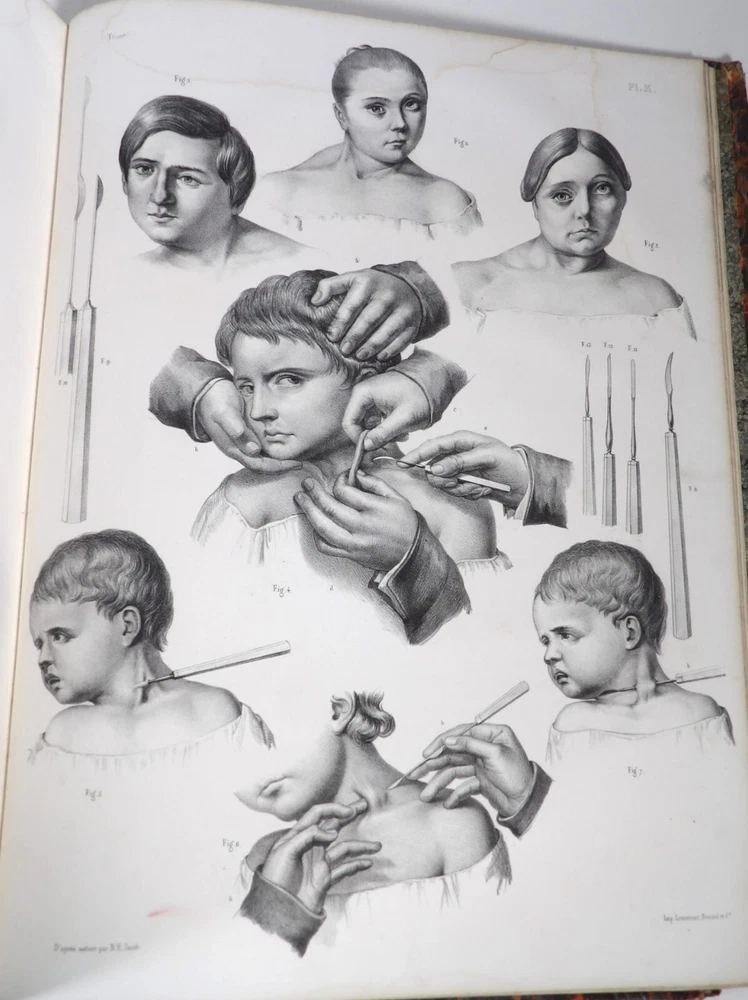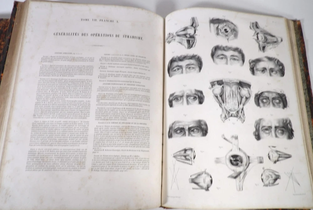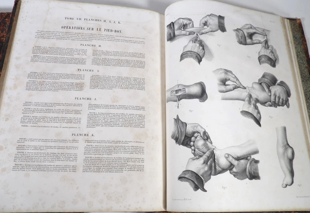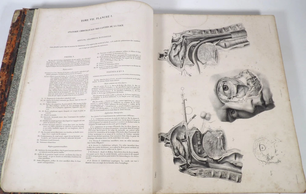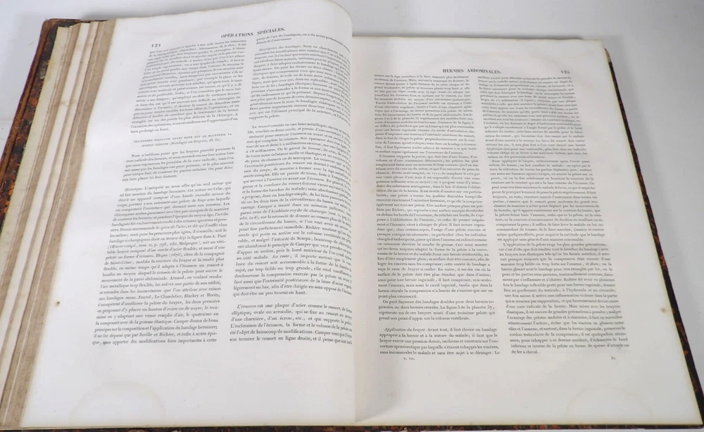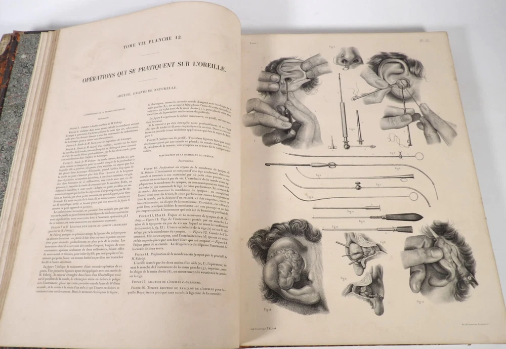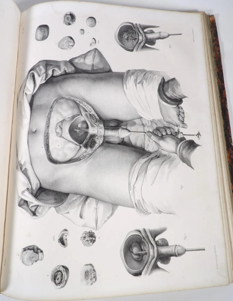 Please consult the conditions of sale at the end of the description before purchasing. BOURGERY, J[ean].M[arc]., Doctor; JACOB, N[icolas].H[enri]. LEVEILLE, JB; HUBLIER, Ch. Complete treatise on human anatomy including operative medicine, with lithographed plates from nature. Seventh volume: Operative medicine. Supplement to the iconography of surgical anatomy and operative medicine. [Text] & Iconography of surgical anatomy and operative medicine. Second division. [Atlas]. Paris, CA Delaunay publisher, Anatomical Librairie, Printed by Paul Renouard, Imprimerie Lemercier, Bernard et Cie, 1840. 2 volumes [Text + Atlas]. Large folio , 33 x 43.5 cm. Binding in tan half-sheepskin , smooth spine decorated with golden fillets, titles and volume numbers, marbled paper boards. Text: 356 pp., lij, (1 f.); Atlas: 1 f. (title), 82 + 16 plates, descriptive leaflets. First edition of this volume VII of the Treatise (...) of the anatomy of man devoted to operative medicine, with an atlas containing 98 lithographed plates , including 82 numbered from 1 to 77 and 16, corresponding to the Supplement, identified by letters, from A to P (General aspects of strabismus operations, Strabismus operations, Stuttering operations, Clubfoot operations, Tenotomy instruments MJ Guérin, Various cases of retraction of muscles of the vertebral grooves treated only by the use of mechanical means, Subcutaneous puncture method of MJ Guérin). This “monument” of medicine remains an essential work, still sought after today. Very rubbed bindings, jaws of the first cover slightly cracked at the head of the text volume (not serious), lower corners of the two covers torn off on the volume of plates, foxing, stains and browned pages, a tear without loss or damage to the text p. xlvij of the Supplement (restored with filmoplast), relatively significant marginal watermarks in the gutter on the first 50 leaves and at the head over the entire book block in the text volume, scattered foxing and healthy watermarks at the head margin of the volume of atlas, a tear without missing (restored with filmoplast on the back) on plate 77, otherwise solid and readable copy. The work of Bourgery and Jacob holds a special place in the history of anatomical atlases. -by its duration: the publication continued for approximately 40 years, if we add to the first edition by Delaunay (1831-1854), that of Louis Guérin, enriched with numerous supplements from 1867 to 1871. -by its perspectives: drawn entirely from nature, from dissections, its objective is not only to renew the iconography of the human body, but also to provide an educational dimension. Thus the part dedicated to operative medicine details the equipment, procedures, required gestures and the anatomical regions concerned for the different operations, carefully described. -by the mobilization of numerous actors and trades (anatomists, prosectors, doctors, designers, lithographers, technicians, printers, publishers, patrons, booksellers, etc.), under the leadership of the two project managers, the anatomist doctor Jean -Marc Bourgery and the painter-designer-lithographer Nicolas-Henri Jacob, who play an unprecedented complementary role. The extreme precision and technical, as well as aesthetic and scientific, quality of the boards had a considerable impact on contemporaries, who readily qualified it as a "masterpiece". “It is enough for us to say here that the work of Mr. Bourgery is one of the most beautiful of which our century will boast. To all the facts that the most in-depth historical knowledge could reveal to him, the author adds discoveries of his own; and he had the talent to bring the attention of anatomists back to particularities glimpsed by ancient authors, but forgotten, or even rejected, by observers less attentive than himself. » Ph. The Bottom, “Bougery (JM)”, in L’Univers. France: Encyclopedic Dictionary, vol. 3, Paris, Firmin Didot brothers, 1840-1845, p. 247. Jean-Baptiste Marc Bourgery , born in Orléans in 1797 and died in Paris in 1849, entered the Paris School of Medicine in 1811. A brilliant student of Lamarck and Laennec, external in 1815, internal the following year, he notably obtained, in 1819, the gold medal from the Paris hospitals. After working as a health officer in a copper foundry near Rouen, at the end of his internship, he returned to Paris in 1827. He then defended his doctoral thesis on “the use of circular limb ligatures in most periodic diseases”, which he dedicated to Guillaume Dupuytren, his mentor. The publication of these works, as well as that of a Treatise on minor surgery (1828), met with some success. It was thanks to the patronage of Baron Benjamin Delessert that he was then able to undertake, from 1829, his major work, the Complete Treatise on the Anatomy of Man, published between 1831 and 1854 (the last volume, as posthumous), praised by his peers and numerous intellectual and artistic personalities (Cuvier, Michelet, Delécluze, Claude Bernard, Hirschfeld, etc.). During the last twenty years of his life, while devoting himself essentially to this monumental work, he studied breathing, the nervous system, the structures of the lungs, the heart, the spleen, the thyroid, etc. In addition, Doctor Félix Thibert had entrusted him with the management of the Museum of Imitative Anatomy, which he had founded on rue du Montparnasse: he made certain pieces in pasteboard, in order to clarify and modernize the representations of various visceral lesions ( previously made of wax). An unsuccessful candidate for several prestigious positions or functions, he confesses his bitterness regarding this lack of recognition in the eighth volume of the Treatise (“Today, after twenty years, I am nothing and I no longer expect Nothing. I have finished with this singular revelation: it is the cry of twenty years of oppression that escapes me. So I give my example to be avoided, if there were any imprudent person ready to allow himself to be s
