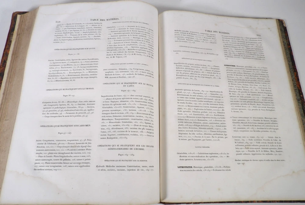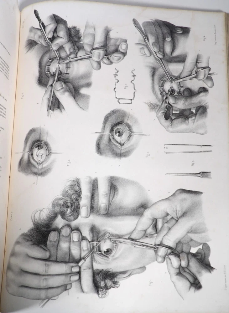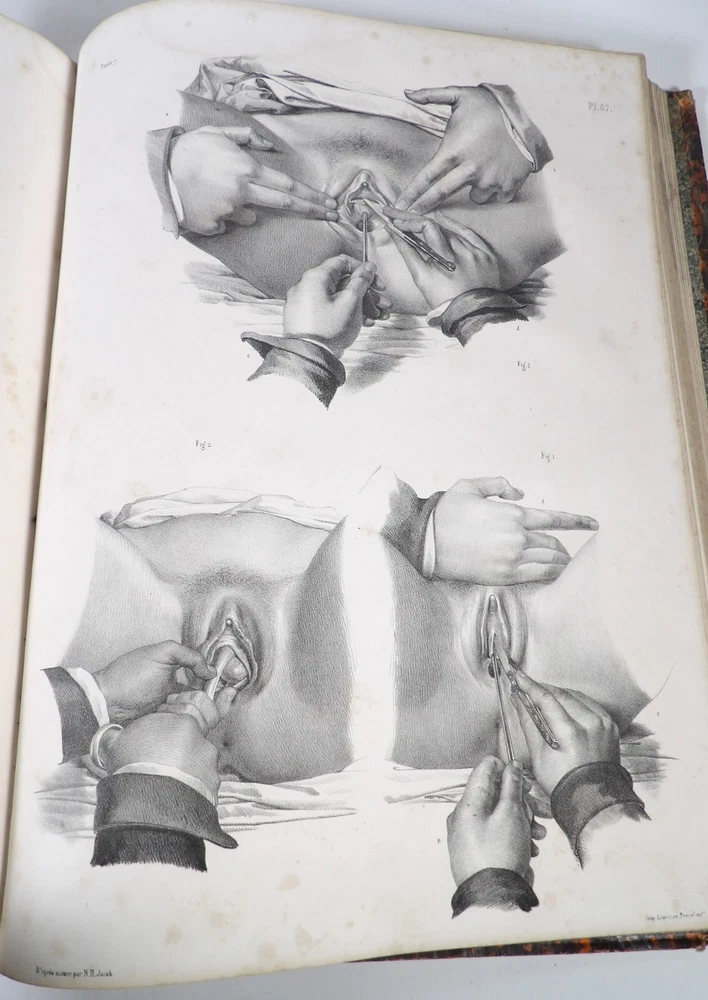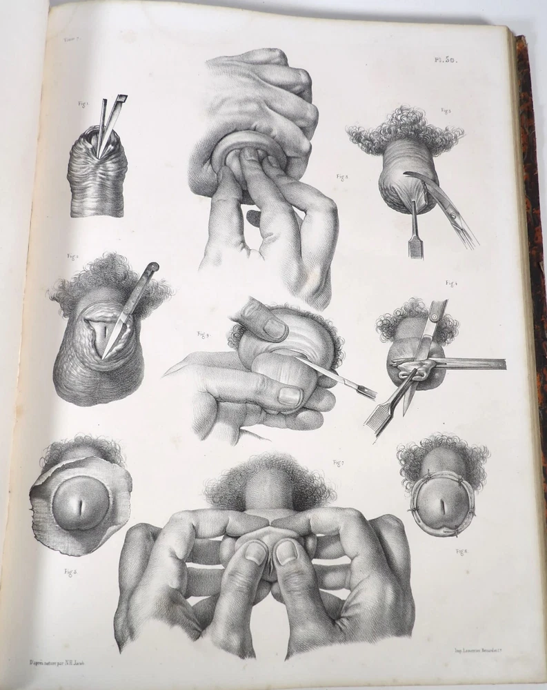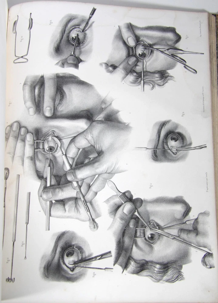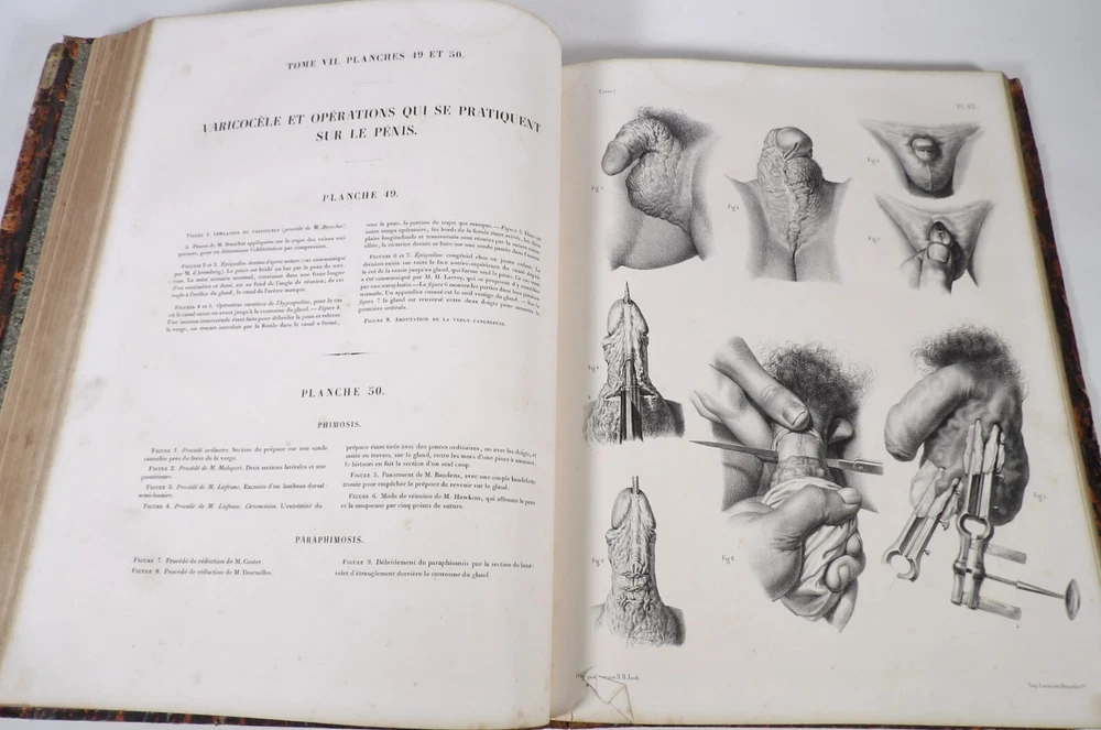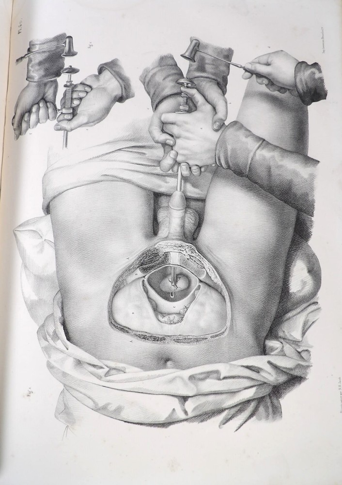 Please consult the conditions of sale at the end of the description before purchasing. BOURGERY, J[ean].M[arc]., Doctor; JACOB, N[icolas].H[enri]. LEVEILLE, JB; HUBLIER, Ch. Complete treatise on human anatomy including operative medicine, with lithographed plates from nature. Seventh volume: Operative medicine. Supplement to the iconography of surgical anatomy and operative medicine. [Text] & Iconography of surgical anatomy and operative medicine. Second division. [Atlas]. Paris, CA Delaunay publisher, Anatomical Librairie, Printed by Paul Renouard, Imprimerie Lemercier, Bernard et Cie, 1840. 2 volumes [Text + Atlas]. Large folio , 33 x 43.5 cm. Binding in tan half-sheepskin , smooth spine decorated with golden fillets, titles and volume numbers, marbled paper boards. Text: 356 pp., lij, (1 f.); Atlas: 1 f. (title), 82 + 16 plates, descriptive leaflets. First edition of this volume VII of the Treatise (...) of the anatomy of man devoted to operative medicine, with an atlas containing 98 lithographed plates , including 82 numbered from 1 to 77 and 16, corresponding to the Supplement, identified by letters, from A to P (General aspects of strabismus operations, Strabismus operations, Stuttering operations, Clubfoot operations, Tenotomy instruments MJ Guérin, Various cases of retraction of muscles of the vertebral grooves treated only by the use of mechanical means, Subcutaneous puncture method of MJ Guérin). This “monument” of medicine remains an essential work, still sought after today. Very rubbed bindings, jaws of the first cover slightly cracked at the head of the text volume (not serious), lower corners of the two covers torn off on the volume of plates, foxing, stains and browned pages, a tear without loss or damage to the text p. xlvij of the Supplement (restored with filmoplast), relatively significant marginal watermarks in the gutter on the first 50 leaves and at the head over the entire book block in the text volume, scattered foxing and healthy watermarks at the head margin of the volume of atlas, a tear without missing (restored with filmoplast on the back) on plate 77, otherwise solid and readable copy. The work of Bourgery and Jacob holds a special place in the history of anatomical atlases. -by its duration: the publication continued for approximately 40 years, if we add to the first edition by Delaunay (1831-1854), that of Louis Guérin, enriched with numerous supplements from 1867 to 1871. -by its perspectives: drawn entirely from nature, from dissections, its objective is not only to renew the iconography of the human body, but also to provide an educational dimension. Thus the part dedicated to operative medicine details the equipment, procedures, required gestures and the anatomical regions concerned for the different operations, carefully described. -by the mobilization of numerous actors and trades (anatomists, prosectors, doctors, designers, lithographers, technicians, printers, publishers, patrons, booksellers, etc.), under the leadership of the two project managers, the anatomist doctor Jean -Marc Bourgery and the painter-designer-lithographer Nicolas-Henri Jacob, who play an unprecedented complementary role. The extreme precision and technical, as well as aesthetic and scientific, quality of the boards had a considerable impact on contemporaries, who readily qualified it as a "masterpiece". “It is enough for us to say here that the work of Mr. Bourgery is one of the most beautiful of which our century will boast. To all the facts that the most in-depth historical knowledge could reveal to him, the author adds discoveries of his own; and he had the talent to bring the attention of anatomists back to particularities glimpsed by ancient authors, but forgotten, or even rejected, by observers less attentive than himself. » Ph. The Bottom, “Bougery (JM)”, in L’Univers. France: Encyclopedic Dictionary, vol. 3, Paris, Firmin Didot brothers, 1840-1845, p. 247. Jean-Baptiste Marc Bourgery , born in Orléans in 1797 and died in Paris in 1849, entered the Paris School of Medicine in 1811. A brilliant student of Lamarck and Laennec, external in 1815, internal the following year, he notably obtained, in 1819, the gold medal from the Paris hospitals. After working as a health officer in a copper foundry near Rouen, at the end of his internship, he returned to Paris in 1827. He then defended his doctoral thesis on “the use of circular limb ligatures in most periodic diseases”, which he dedicated to Guillaume Dupuytren, his mentor. The publication of these works, as well as that of a Treatise on minor surgery (1828), met with some success. It was thanks to the patronage of Baron Benjamin Delessert that he was then able to undertake, from 1829, his major work, the Complete Treatise on the Anatomy of Man, published between 1831 and 1854 (the last volume, as posthumous), praised by his peers and numerous intellectual and artistic personalities (Cuvier, Michelet, Delécluze, Claude Bernard, Hirschfeld, etc.). During the last twenty years of his life, while devoting himself essentially to this monumental work, he studied breathing, the nervous system, the structures of the lungs, the heart, the spleen, the thyroid, etc. In addition, Doctor Félix Thibert had entrusted him with the management of the Museum of Imitative Anatomy, which he had founded on rue du Montparnasse: he made certain pieces in pasteboard, in order to clarify and modernize the representations of various visceral lesions ( previously made of wax). An unsuccessful candidate for several prestigious positions or functions, he confesses his bitterness regarding this lack of recognition in the eighth volume of the Treatise (“Today, after twenty years, I am nothing and I no longer expect Nothing. I have finished with this singular revelation: it is the cry of twenty years of oppression that escapes me. So I give my example to be avoided, if there were any imprudent person ready to allow himself to be s