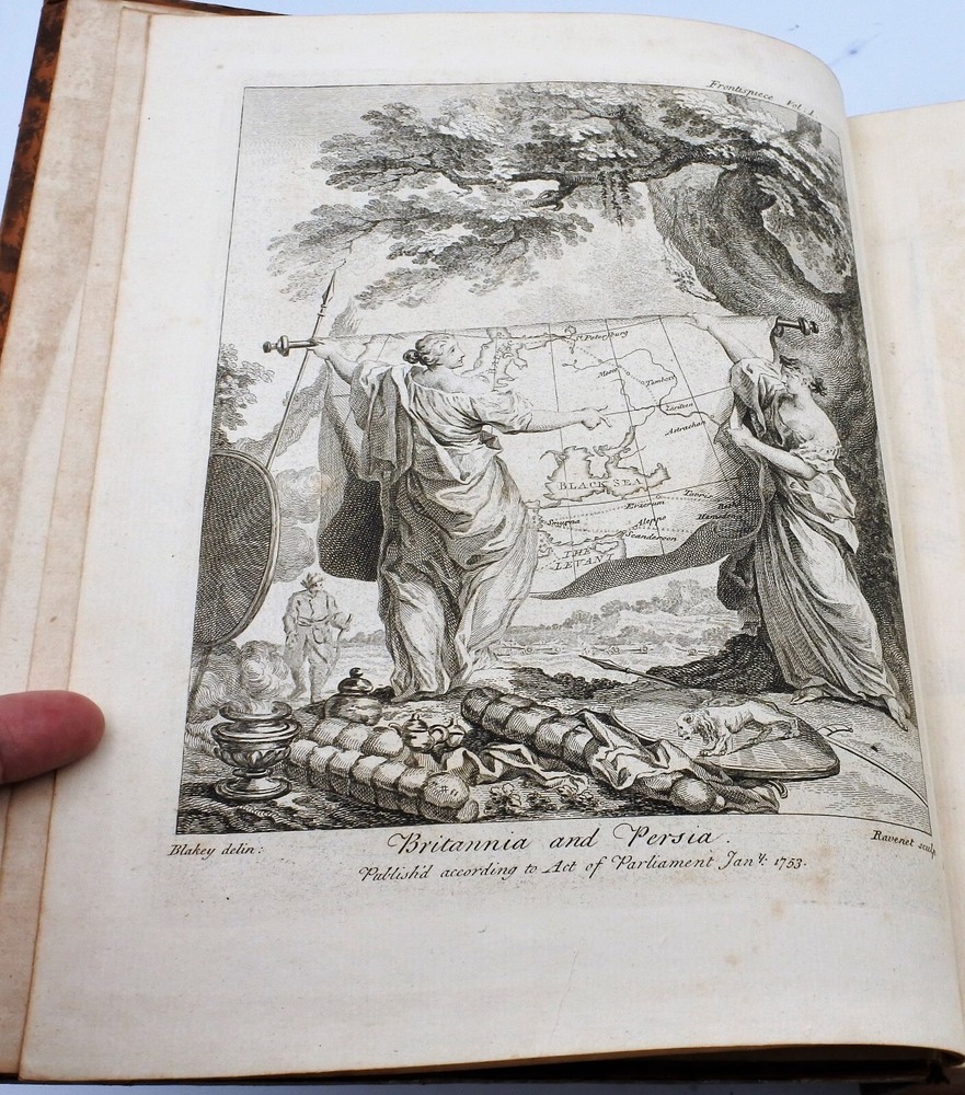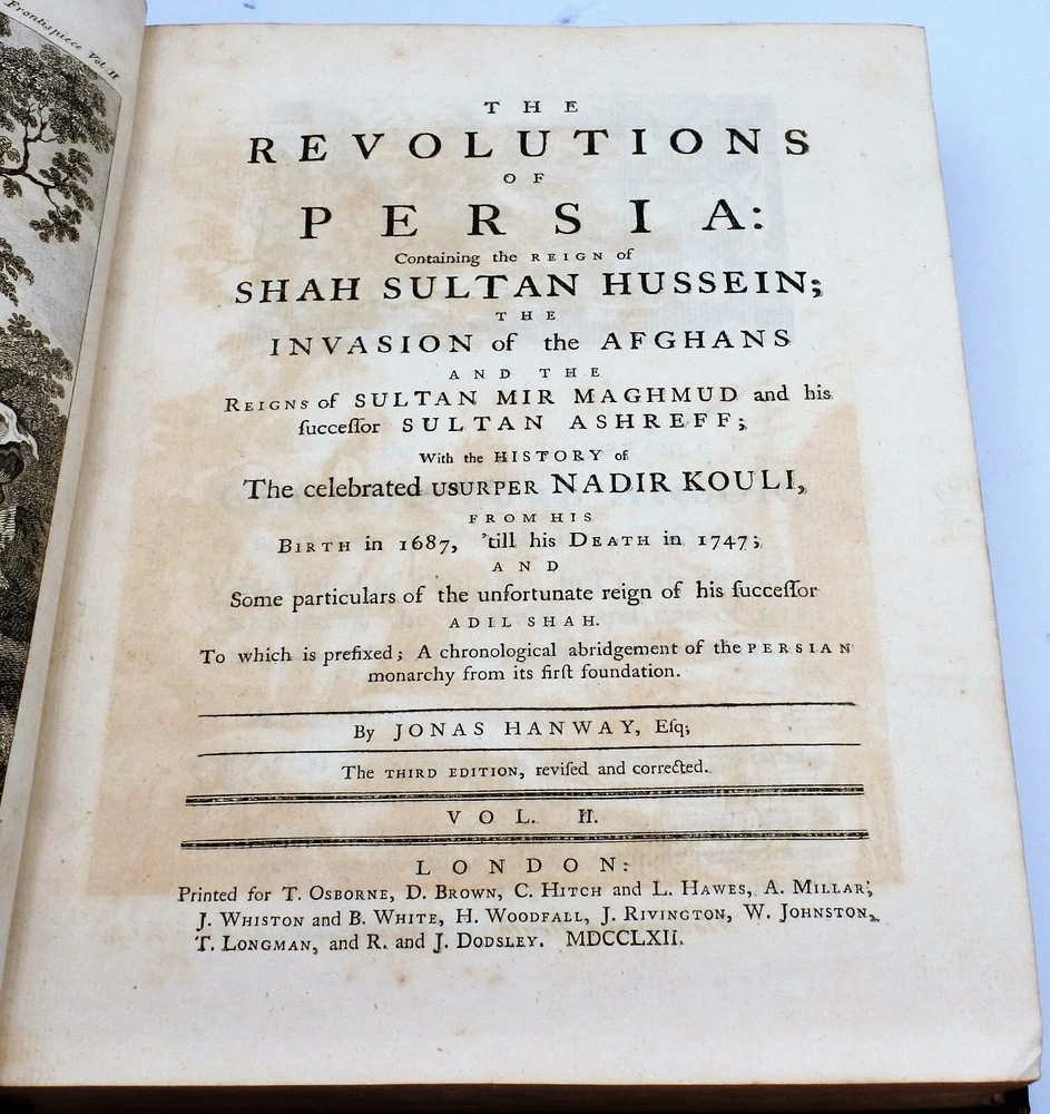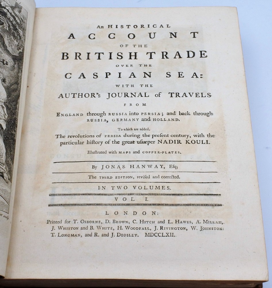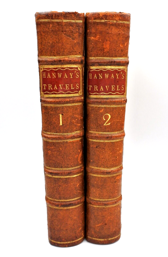 An Historical Account of the British Trade over the Caspian Sea: with a journal of travels from London through Russia into Persia, and back through Russia, Germany and Holland. To which are added, the revolutions of Persia during the present century, with the particular history of the great usurper Nadir Kouli. By Johas Hanway. The Third Edition Revised and Corrected in Two Volumes. Contemporary full leather bindings are in very good condition. Contents are clean and tight and in very good condition. Vol. I with 460 pages plus index , frontis, illustrations and foldout maps. Vol. II with 460 pages plus index, frontis, illustrations and foldout maps. Books measure 9'' x 11''.