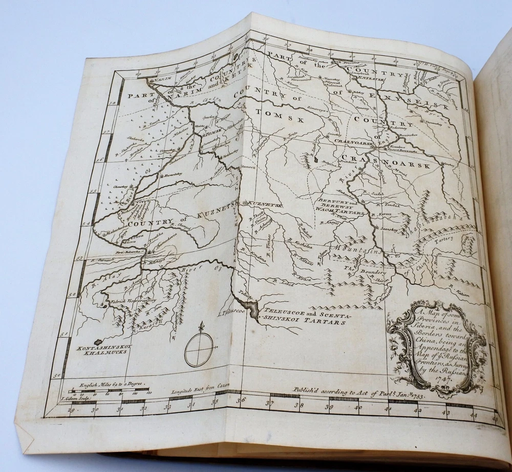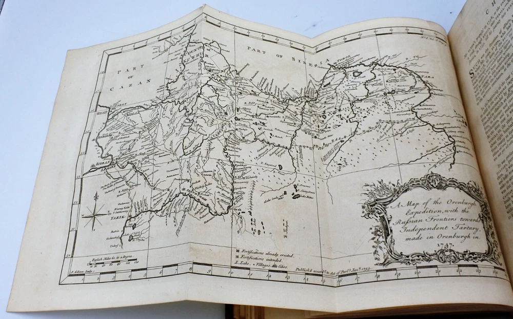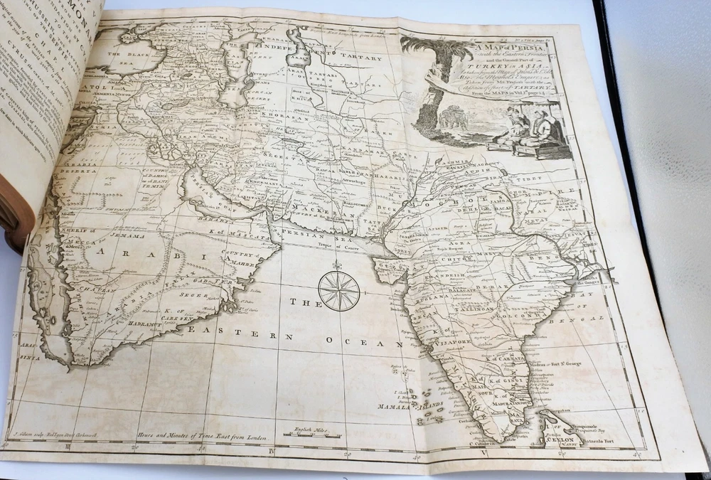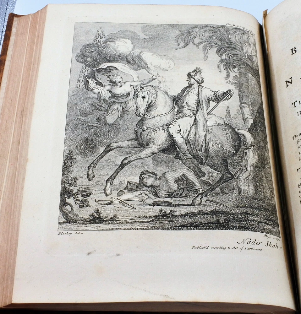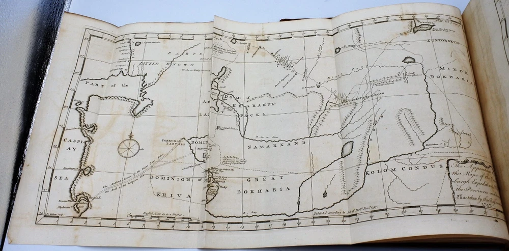 An Historical Account of the British Trade over the Caspian Sea: with a journal of travels from London through Russia into Persia, and back through Russia, Germany and Holland. To which are added, the revolutions of Persia during the present century, with the particular history of the great usurper Nadir Kouli. By Johas Hanway. The Third Edition Revised and Corrected in Two Volumes. Contemporary full leather bindings are in very good condition. Contents are clean and tight and in very good condition. Vol. I with 460 pages plus index , frontis, illustrations and foldout maps. Vol. II with 460 pages plus index, frontis, illustrations and foldout maps. Books measure 9'' x 11''.