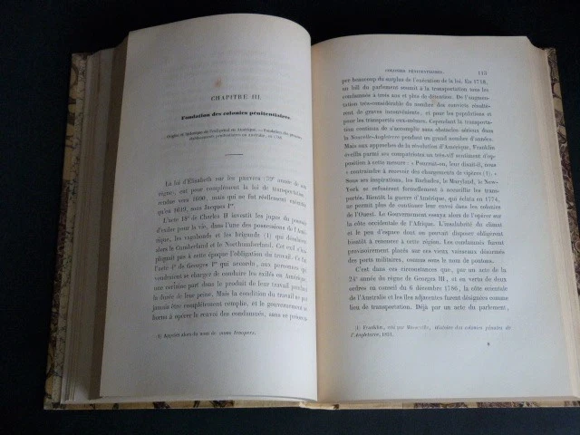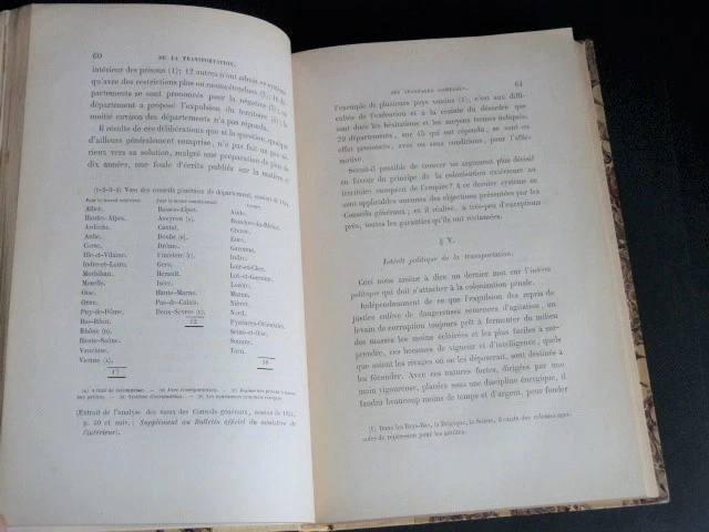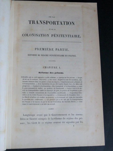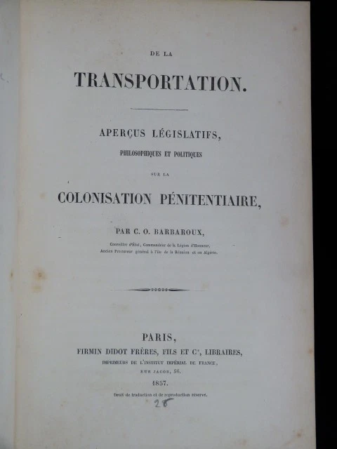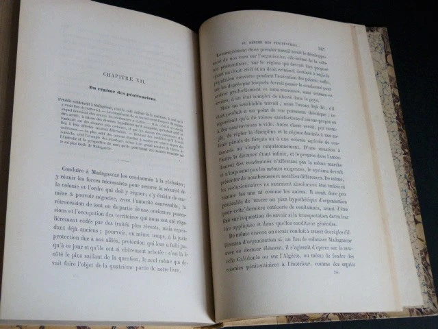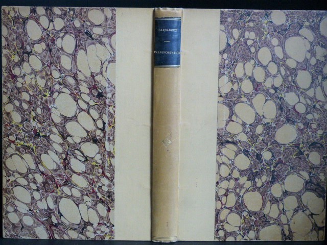 Please consult the conditions of sale at the end of the description before purchasing. BARBAROUX, C[harles-].O[ger]. Of Transportation. Legislative, philosophical and political insights into prison colonization. Paris, Firmin Didot Frères, fils et Cie, booksellers, 1857. In-8 - 15.5 x 24 cm. Contemporary binding in beige half-cloth, smooth spine decorated with a black title piece, a fleuron and golden fillets, marbled paper boards. XIII, (3 p.), 423 pp. Very complete work of his color folding map of the island of Madagascar. Rare work on a little-discussed subject (Grandidier's Bibliography of Madagascar, II, 6371, only mentions another title by this author on the same subject).|1 Reform of the prison regime in France. 2 Britain's prison system. 3 Of penitentiary colonization. 4 Colonization of Madagascar. Barbaroux Charles-Oger, magistrate and writer, son of the conventional, was born in Marseille in 1792. He was first a lawyer in Nîmes, contributed to various publications, fulfilled, after 1830, the functions of attorney general in Pondicherry, then on Bourbon Island, finally in Algiers in 1848. At that time he was elected representative to the Constituent Assembly by the island of Reunion. He died in Vaux in 1867. (19th century Larousse). Beautiful state of conservation. ___ Bookstore L’Art et la Manner 19 Route de Pithiviers 45300 BOYNES France Member of SLAM and LILA ( National Union of Ancient and Modern Bookstores / International League of Old Booksellers) ILAB (International League of Antiquarian Booksellers) English spoken Please don't hesitate to contact us if you have any inquiry The greatest care is taken in the description of the works, however, unintentional errors may be made. Do not hesitate to inform us, including after receipt of your purchase. Regarding shipping: The choice is yours! So that you can benefit from the best services and the most advantageous quality/price ratio, the bookstore offers you: Hand delivery by appointment, in Boynes, near Pithiviers, or in Paris on Saturday mornings or during old book fairs. Sending by the Post Office : by letter for folds less than 3 cm thick (packaging included) or by colissimo. Deposit in Relay Point . The bookstore practices group shipments . If you make multiple purchases in our store, u A new claim for payment with adjusted postage costs will be sent to you within a maximum period of 24 hours . THE insurance is optional (option not available for Relay Point shipments). For shipments to Overseas , please contact us beforehand to find out the exact amount of postal costs. Although packaging costs are offered, packages are reinforced and prepared with great care. The Librairie l'Art et la Manière is always on the lookout for rare and old works, to purchase individually or in batches. We travel primarily in Loiret (45), Paris (75) and the south of Ile-de-France (91, 77, 78, 92, 94) as well as in Yonne (89) and Eure-et-Loir (28). If you would like to sell some, do not hesitate to contact us. Just type “Librairie l’Art et la Manière” into your favorite search engine! Rare work on a little-discussed subject (Grandidier's Bibliography of Madagascar, II, 6371, only mentions another title by this author on the same subject).|1 Reform of the prison regime in France. 2 Britain's prison system. 3 Of penitentiary colonization. 4 Colonization of Madagascar. Barbaroux Charles-Oger, magistrate and writer, son of the conventional, was born in Marseille in 1792. He was first a lawyer in Nîmes, contributed to various publications, fulfilled, after 1830, the functions of attorney general in Pondicherry, then on Bourbon Island, finally in Algiers in 1848. At that time he was elected representative to the Constituent Assembly by the island of Reunion. He died in Vaux in 1867. (19th century Larousse). The Librairie l'Art et la Manière is always on the lookout for rare a