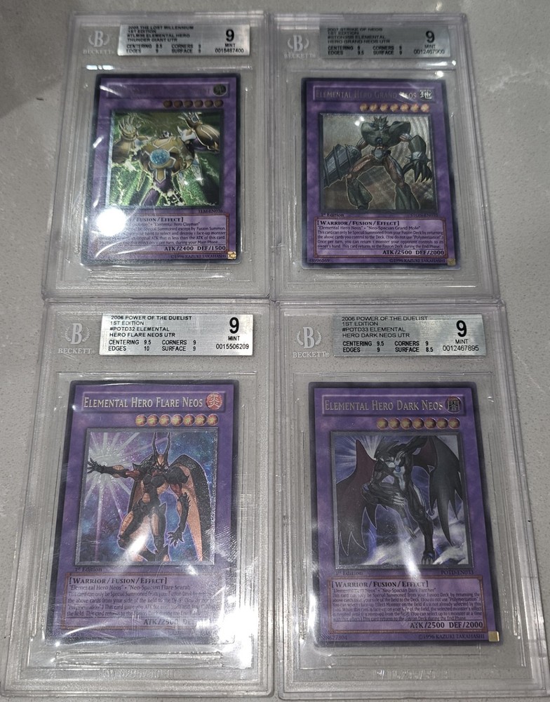 These Beckett 9-graded Elemental Hero cards are absolutely stunning! The Ultimate 1st Edition prints look flawless under the slab, with vibrant colors and crisp artwork. As a collector, having Grand Neos, Flare Neos, Dark Neos, and Thunder Giant in pristine condition is a dream come true. The Beckett grading guarantees their value and authenticity, making them a must-have for any serious Yu-Gi-Oh! enthusiast. Highly recommended for both display and investment!