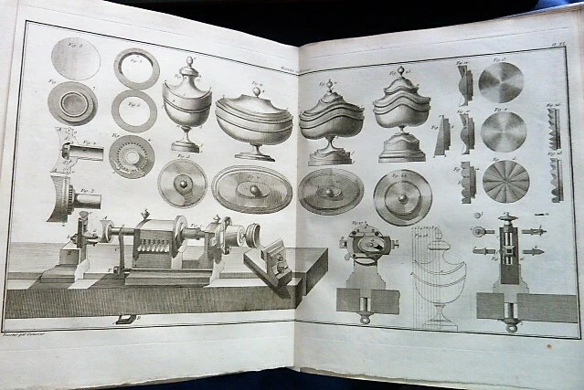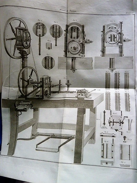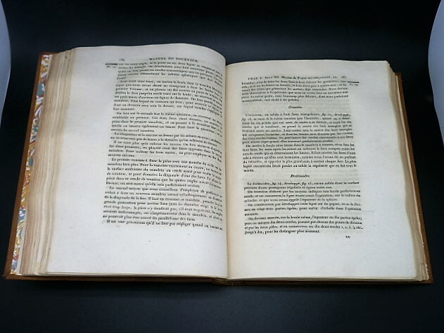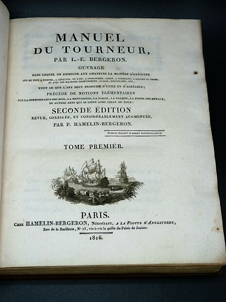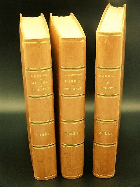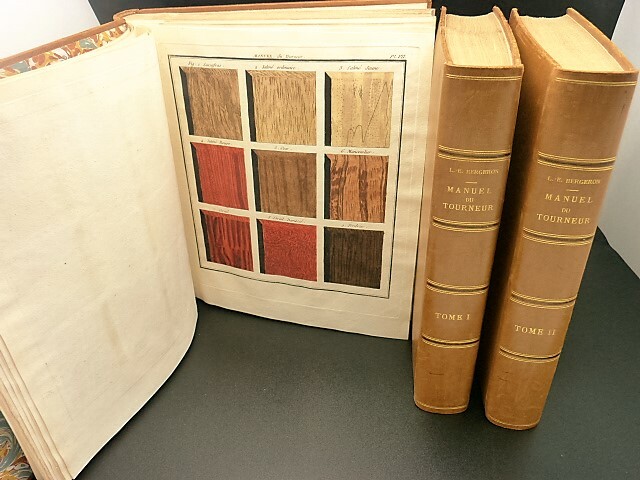 Please consult the conditions of sale at the end of the description before purchasing. BERGERON, THE. Turner's Manual. Paris, Chez Hamelin-Bergeron, 1816. 3 volumes (2 volumes of Text + 1 Atlas), COMPLETE. In-4 - 21 x 27 cm (Text); Large In-4-25.5 x28 cm (Atlas). xxxij-509 pp. (T.1); xi-(1)-542 pp. (T.2); 96 plates (Atlas). Rear binding in full fawn sheepskin , smooth spine decorated with double gilded lines and cold lines simulating the nerves, author, title and volume number in gold. Very complete copy of his Atlas, made up of 2 volumes containing 39 and 57 plates respectively, or 96 in all, including the first 8 (showing 72 species of wood) in color, watercolored at the time, and 42 double or folding plates. Second edition revised, corrected and considerably expanded by P. Hamelin-Bergeron [pseudonym of Louis-Georges-Isaac Salivet (1737-1805)]. This second edition is recognized as more complete and much superior to the original from 1792-1796 (Brunet I -785) of this work, "in which amateurs are taught how to execute on the Tour à Pointes, à Lunettes, en l'Air, à Guillocher, Carré, à Portraits, à Engraver Glass; And with eccentric, oval, epicycloidal Machines, etc., Everything useful and pleasant that Art can produce. Preceded by elementary notions on the Knowledge of Wood, Carpentry, Blacksmithing, Quenching, Casting of Metals, and other Arts which are linked with that of the Tour". In fact, in addition to wood turning, the author addresses iron working, the turning of architectural pieces, twisted columns and the Archimedes screw, the molding of antlers and horn, etc. Tiny little traces of friction, otherwise very good state of conservation for this work, which is rarely found complete in such good condition. ___ Bookstore L’Art et la Manner 19 Route de Pithiviers 45300 BOYNES France Member of SLAM and LILA ( National Union of Ancient and Modern Bookstores / International League of Old Booksellers) ILAB (International League of Antiquarian Booksellers) English spoken Please don't hesitate to contact us if you have any inquiry The greatest care is taken in the description of the works, however, unintentional errors may be made. Do not hesitate to inform us, including after receipt of your purchase. Regarding shipping: The choice is yours! So that you can benefit from the best services and the most advantageous quality/price ratio, the bookstore offers you: Hand delivery by appointment, in Boynes, near Pithiviers, or in Paris on Saturday mornings or during old book fairs. Sending by the Post Office : by letter for folds less than 3 cm thick (packaging included) or by colissimo. Deposit in Relay Point . The bookstore practices group shipments . If you make multiple purchases in our store, u A new claim for payment with adjusted postage costs will be sent to you within a maximum period of 24 hours . THE insurance is optional (option not available for Relay Point shipments). For shipments to Overseas , please contact us beforehand to find out the exact amount of postal costs. Although packaging costs are offered, packages are reinforced and prepared with great care. The Librairie l'Art et la Manière is always on the lookout for rare and old works, to purchase individually or in batches. We travel primarily in Loiret (45), Paris (75) and the south of Ile-de-France (91, 77, 78, 92, 94) as well as in Yonne (89) and Eure-et-Loir (28). If you would like to sell some, do not hesitate to contact us. Just type “Librairie l’Art et la Manière” into your favorite search engine! This second edition is recognized as more complete and much superior to the original from 1792-1796 (Brunet I -785) of this work, "in which amateurs are taught how to execute on the Tour à Pointes, à Lunettes, en l'Air, à Guillocher, Carré, à Portraits, à Engraver Glass; And with eccentric, oval, epicycloidal Machines, etc., Everything useful and pleasant that Art can produce. Preceded by elementary notions on the Knowledge of Wood, Carpentry, Blacksmithing, Quenching, Casting of Metals, and other Arts which are linked with that of the Tour". The Librairie l'Art et la Manière is always on the lookout for rare and old works, to purchase individually or in batches. We travel primarily in Loiret (45), Paris (75) and the south of Ile-de-France (91, 77, 78, 92, 94) as well as in Yonne (89) an