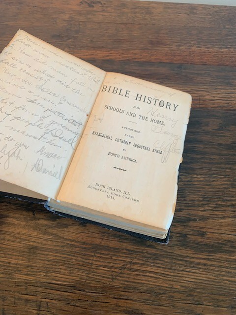 Bible History for Schools and the Home Catechism with Maps 1922 23rd Edition 1898 Copyright, in fair condition as first two pages are loose hand have pencil writing as pictured. Binding is still intact. Wonderful black and white illustrations throughout. The writing is a lovely piece of history. Measures 6"x4"Augustana Book Concern Publisher Questions welcomed and encouraged. We are happy to provide additional photos if asked. Clean, no mold. Books may smell of aged paper and dusty shelves, otherwise known as Bibliosmia (the smell of a good book!) Smoke free home.