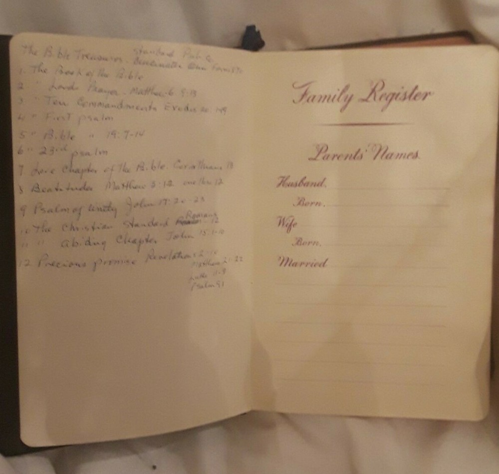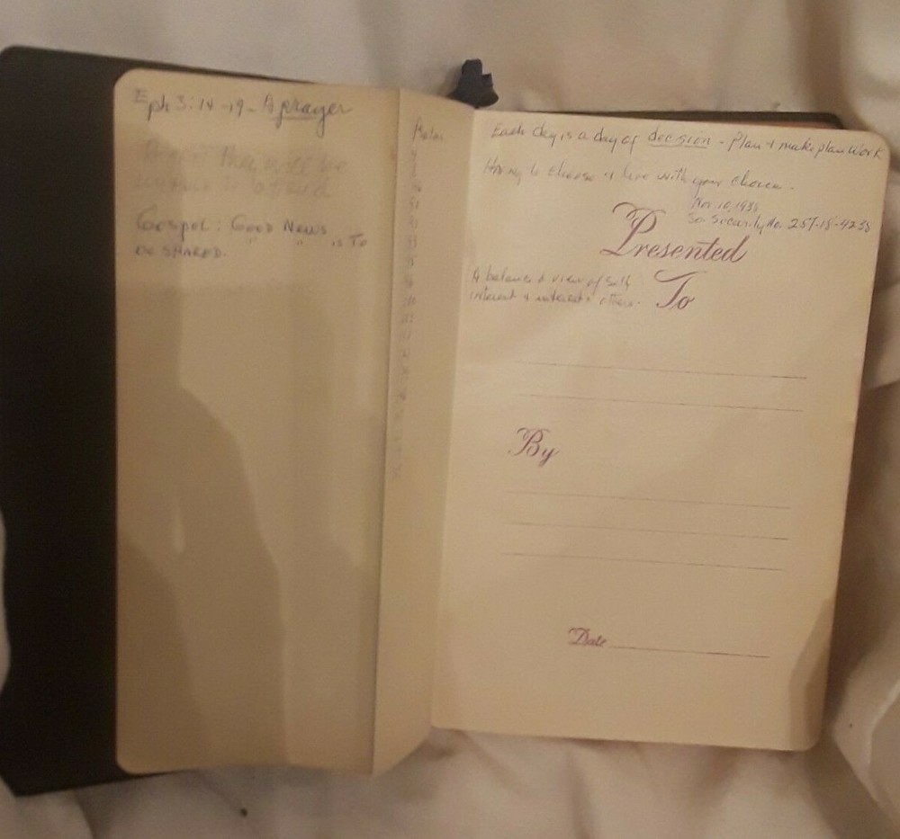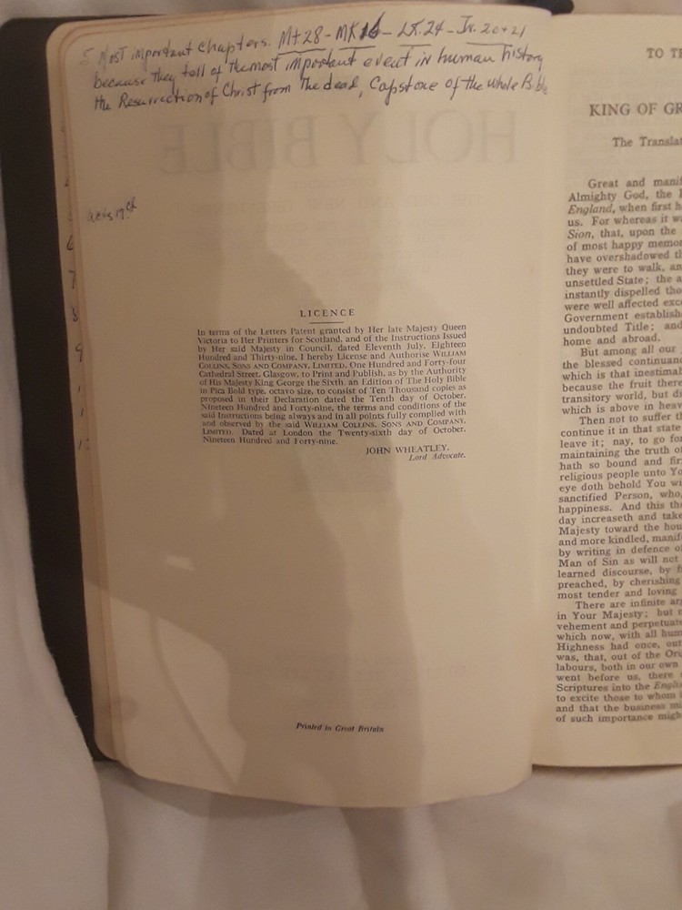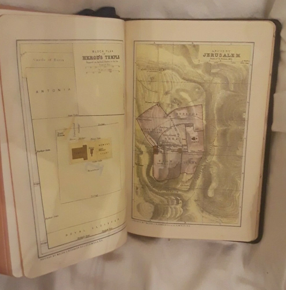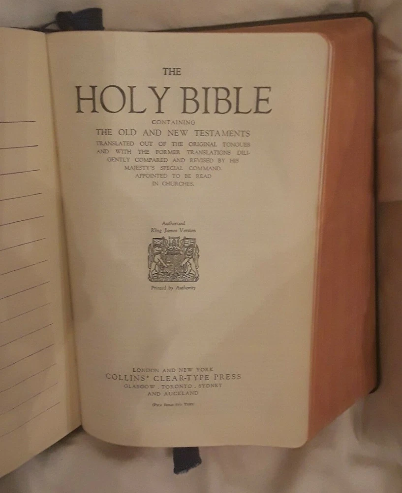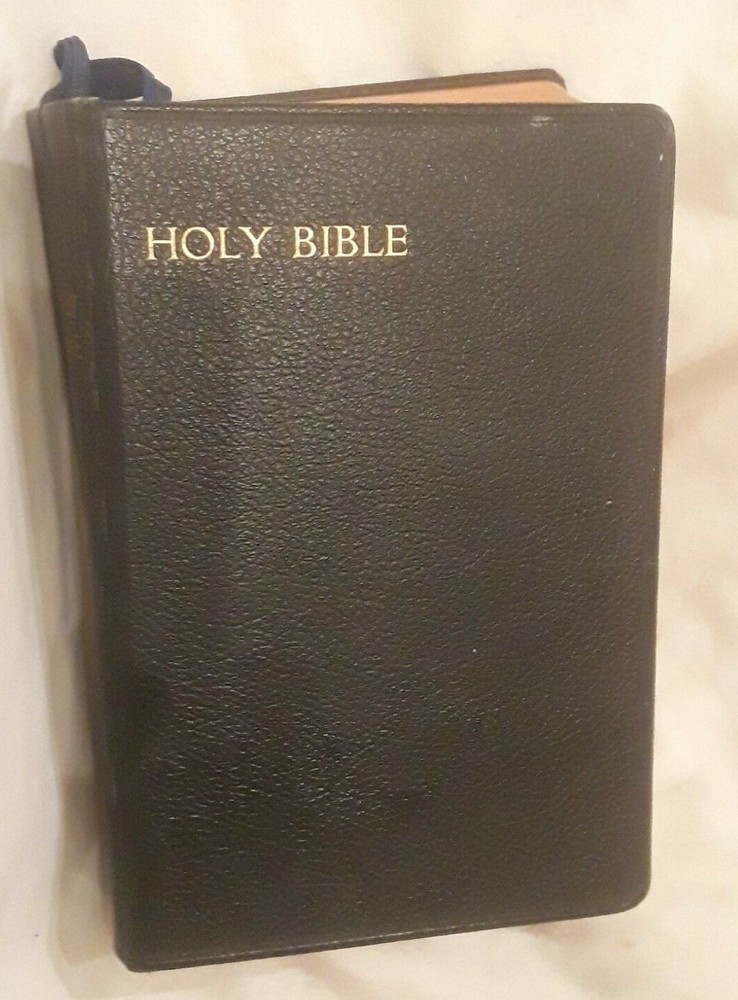 Black 1959 Collins Bible KJV Gilded Clear Type Press Scripture Calendar Maps Has handwritten notes...