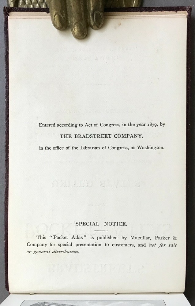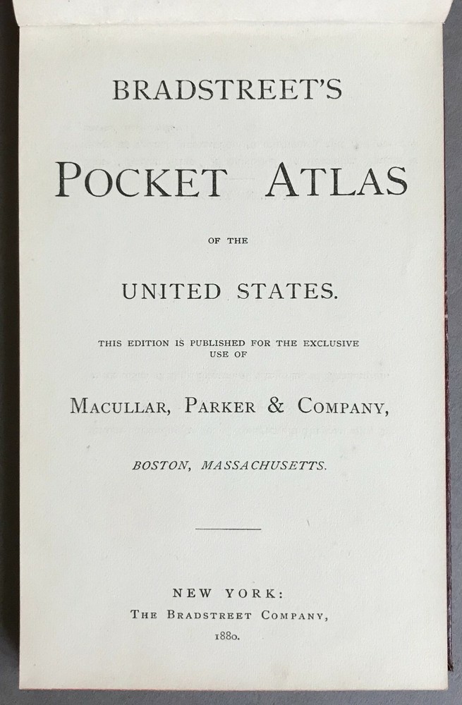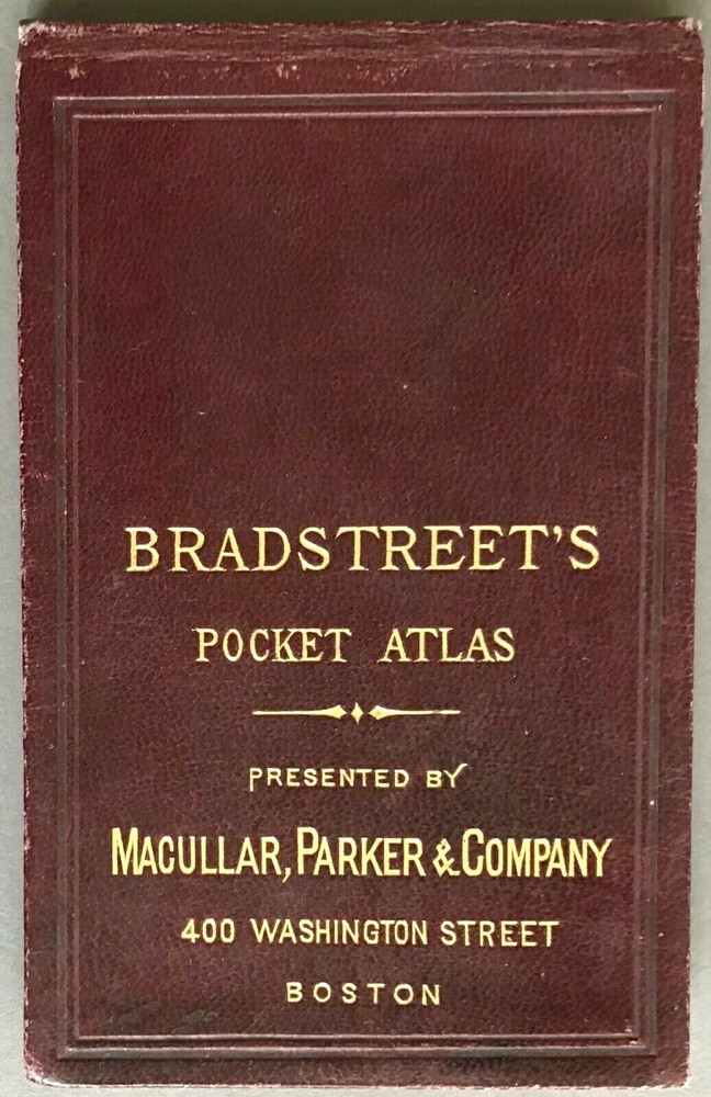 [Boston] Bradstreet’s Pocket Atlas of the United States Bradstreet Co. 1880 Bradstreet’s Pocket Atlas of the United States . New York: Bradstreet Co., 1880. Early reprint edition. 24mo (approx. 5.25 x 3.25 inches). Publisher’s burgundy leather, stamped in gilt to front cover. Fully illustrated with colored maps. This edition is published for the exclusive use of Macullar, Parker & Company, Boston, Massachusetts. Extremities gently rubbed and edgeworn; offsetting to endleaves; light interior toning; early ink ownership inscriptions to first and last blank, rear pastedown. Very good. COL -00049A Please visit our eBay store for more books on travel and exploration! https://www.ebay.com/str/inkqnabula/Travels-Voyages-Places/_i.html?_storecat=24003226014