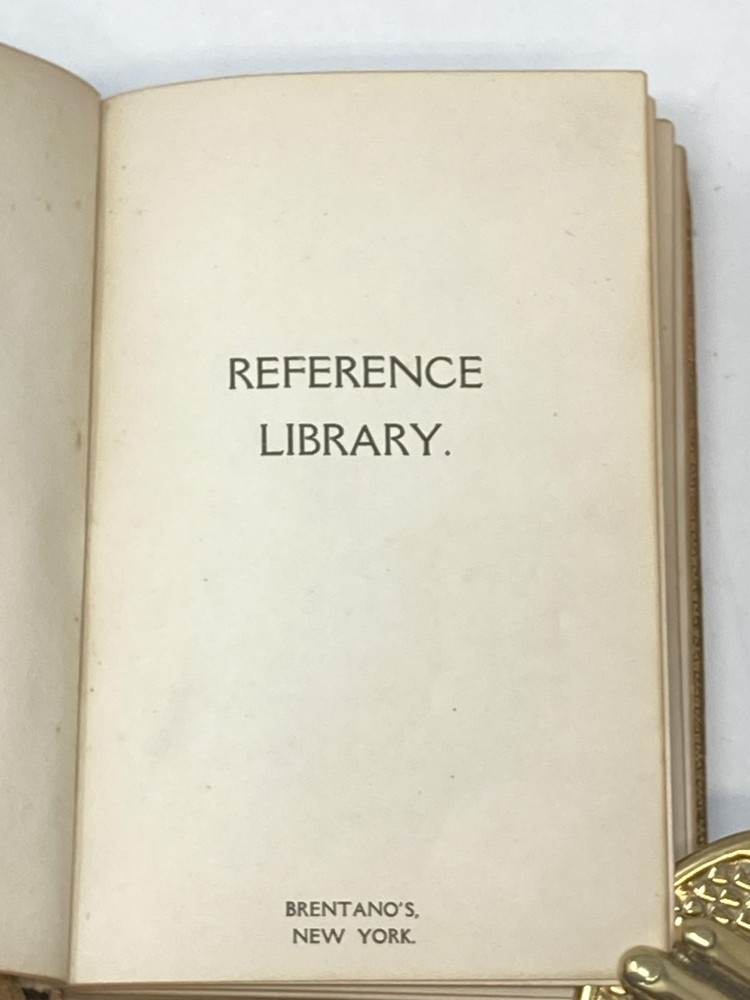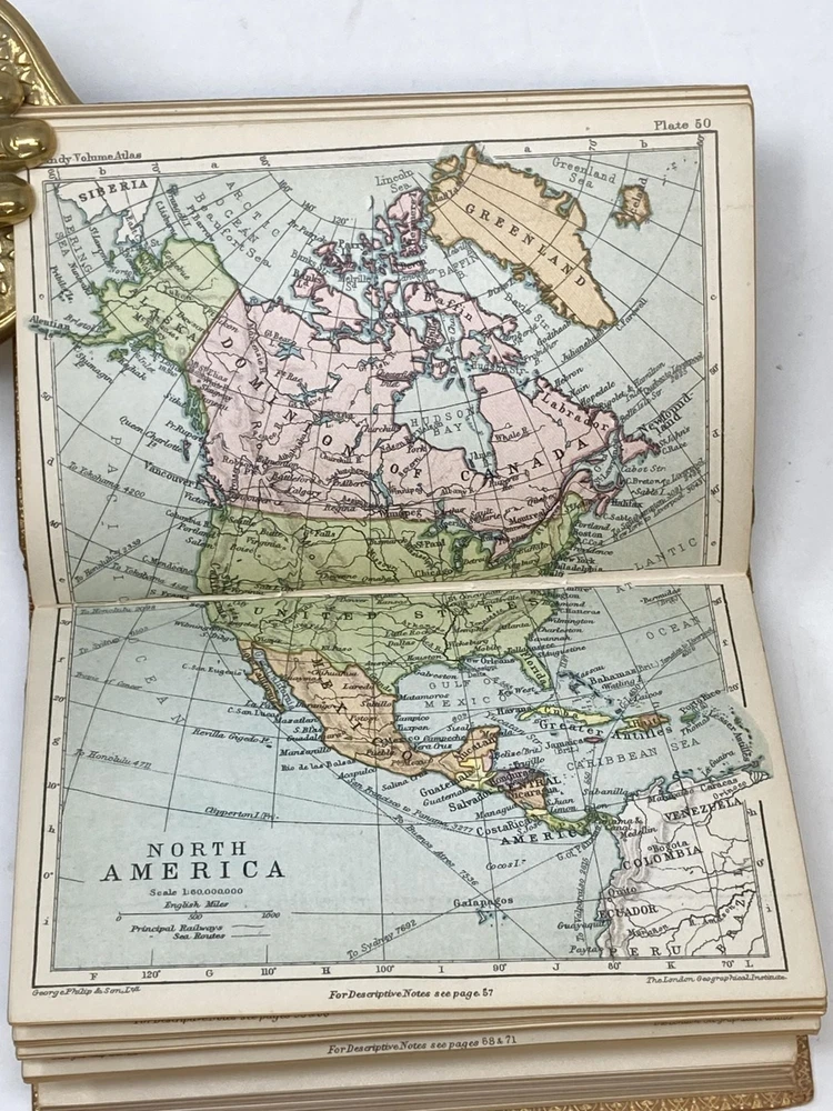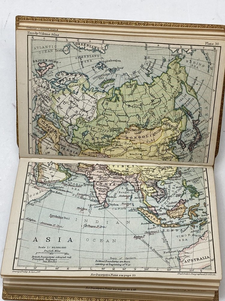 THE HANDY VOLUME ATLAS OF THE WORLD Author: Brentano's Title: THE HANDY VOLUME ATLAS OF THE WORLD Publication: New York: Brentano's, 1918 Edition: Twelfth Edition Description: Leather-bound. 24mo. Full tan morocco (goatskin) (5 3/4 in. x 4 in.) ruled in gilt. Three compartments to spine, the top with gilt titling ("ATLAS") , the other to with gilt flowers, set off by gilt rules. All edges gilt. Some scuffing, discoloration and or rubbing to extremities. Gilt dentelles over marbled endpapers. 73 separate plates, with thorough explanatory prose, and index at rear. Many color maps. 114 pp. in all. Good Plus. "...This wartime (WWI) edition "makes its appearance while the Great War is still being waged, and for this reason, while the maps have been carefuly revised, it has been thought advisable to show the political boundaries as these existed before the War, since the territorial changes which have occurred up to the present are bound to be largely modified by the Terms of Peace, and it is still too early to anticipate the lines on which the maps of Europe and the World will ultimately be redrawn..." "Tol illlustrate the Western Battle Front a new map of Northern France and Belgium has been included in the present edition on an enlarged scale. Seller ID: 88706 Aardvark Rare Books Eugene, OR We work hard to make your Bookbuying Experience safe, easy and fun. Aardvark Books is a proud member of the ABAA (Antiquarian Booksellers Association of America) and IOBA, Independent Online Booksellers Association. Ezra is also an accredited and Qualified Appraiser of Books and Manuscripts, with a designation from the ASA (American Society of Appraisers), with considerable Archive experience as well. Shipping All books shipped to US destinations are sent via the US Postal Service. Faster shipping is available, please ask before paying. We will combine shipping on items purchased at the same time in order to help reduce costs. International shipping is also available. Please inquire for a shipping quote before ordering. This listing was created by Bibliopolis.