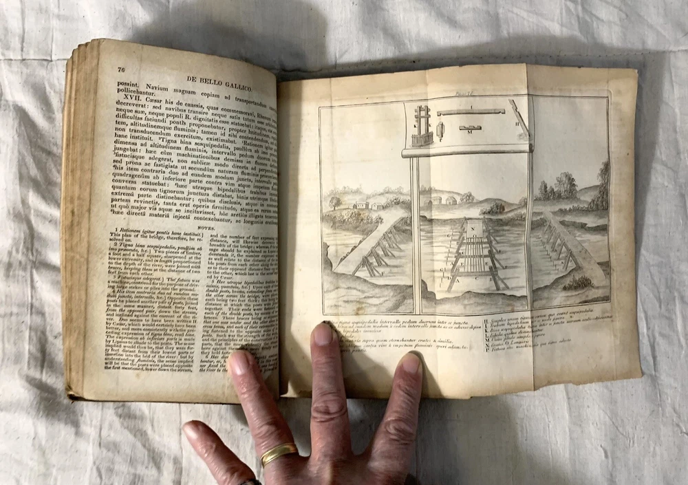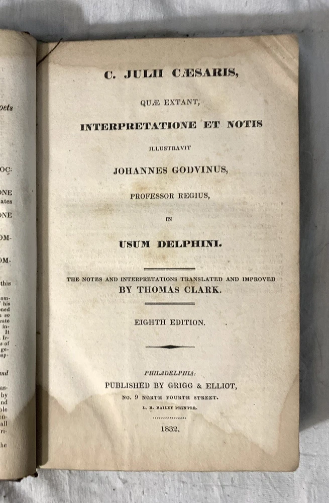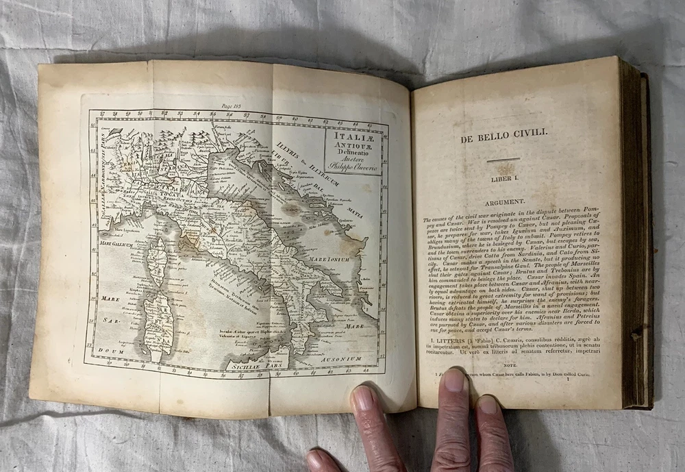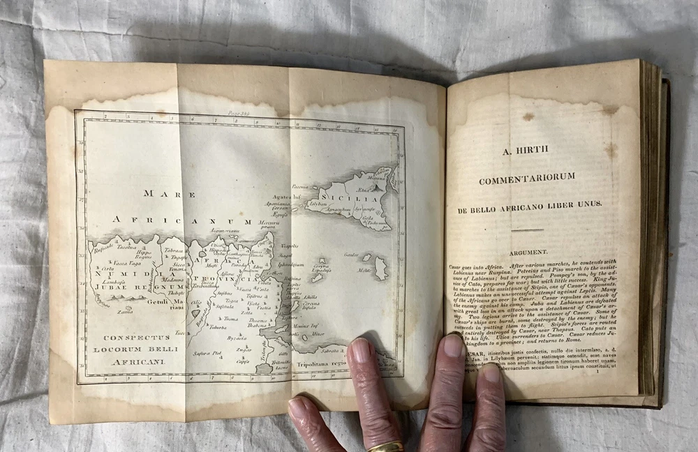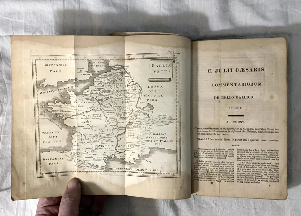 C Julii Caesaris Quae Extant Interpretatione et Notis Folding MAPS 1832 Cluverio. Eighth Edition. Fair to Good condition hardcover book. Size is about 8-1/2” by 5-1/2”. The Preface, a two page biography of C. Julius Caesar, and notes at the bottom of pages are in English. The text is in Latin. Full leather binding is square and tight. We’ll worn; leather cracked back spine edge. Spine label is hard to read and is lifting at one edge. Front endpapers, two of the next three pages; and one back blank page have fountain pen writing. Old moisture staining top and bottom of pages. Very few corners creased. Three foldout maps and one foldout illustration.