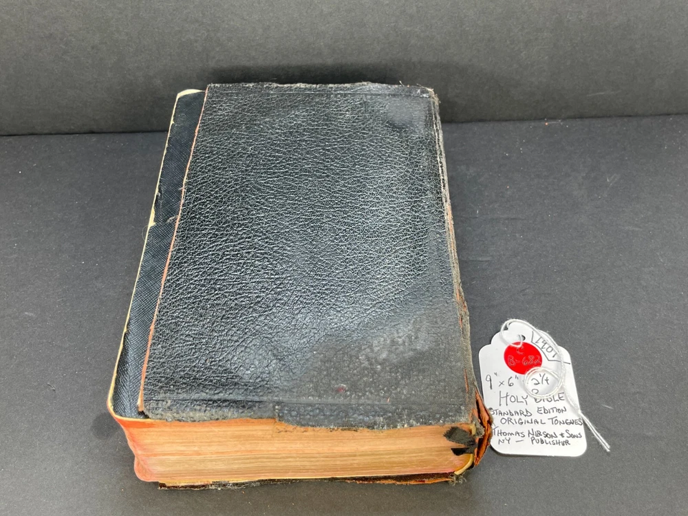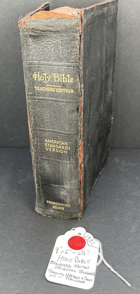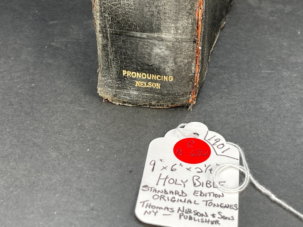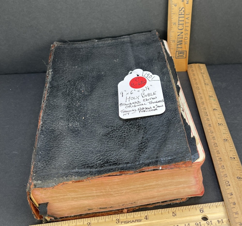 ONE(1) USED ANTIQUE HOLY BIBLE (1901) PUBLISHED BY THOMAS NELSON & SONS. THE BIBLE IS TRANSLATED FROM TONGUES STANDARD EDITION WITH REVIONS BY THE AMERICAN REVISION COMMITTEE IN 1921 WITH OLD AND NEW TESTAMENTS, DICTIONARY AND MAPS. THE COVER IS IN POOR CONDITION, AS IT WAS CUT TO FIT IN A LONG AGO LOST BOOK COVER, BUT THE BIBLE IS OVERALL IN PRETTY GOOD SHAPE FOR BEING 124 YEARS OLD. A NICE TURN OF THE CENTURY NELSON BIBLE.THAT JUST NEEDS A NEW HOME (AND A NEW BIBLE COVER!!!! AS YOU CAN SEE FROM THE PICTURES THIS WAS A WELL TREASURED BIBLE IN IT'S LONG PAST!!! Please see the pictures as completion of the description. PLEASE ASK QUESTIONS BEFORE YOU MAKE A PURCHASE, I REPLY QUICKLY!!! Buy with Confidence, you will get the exact item you see in the sale, and if you have any issues, just check my feedback and rest assured you are purchasing from a long time (24+ years), 100% perfect record EBAY'er. The 1901 NELSON BIBLE will be well packed and shipped within 1 business days of payment! GOOD LUCK BUYERS!!!