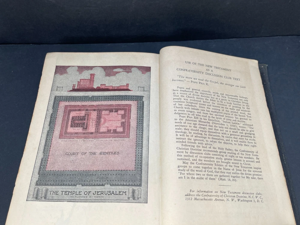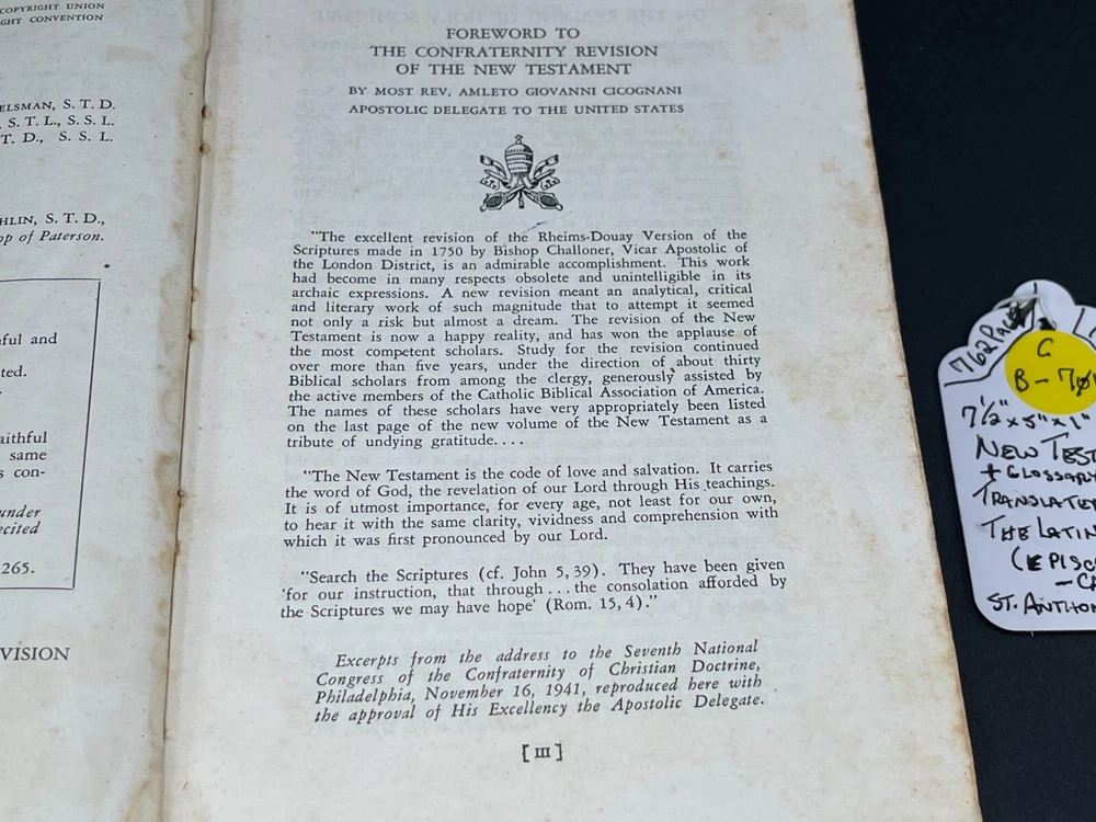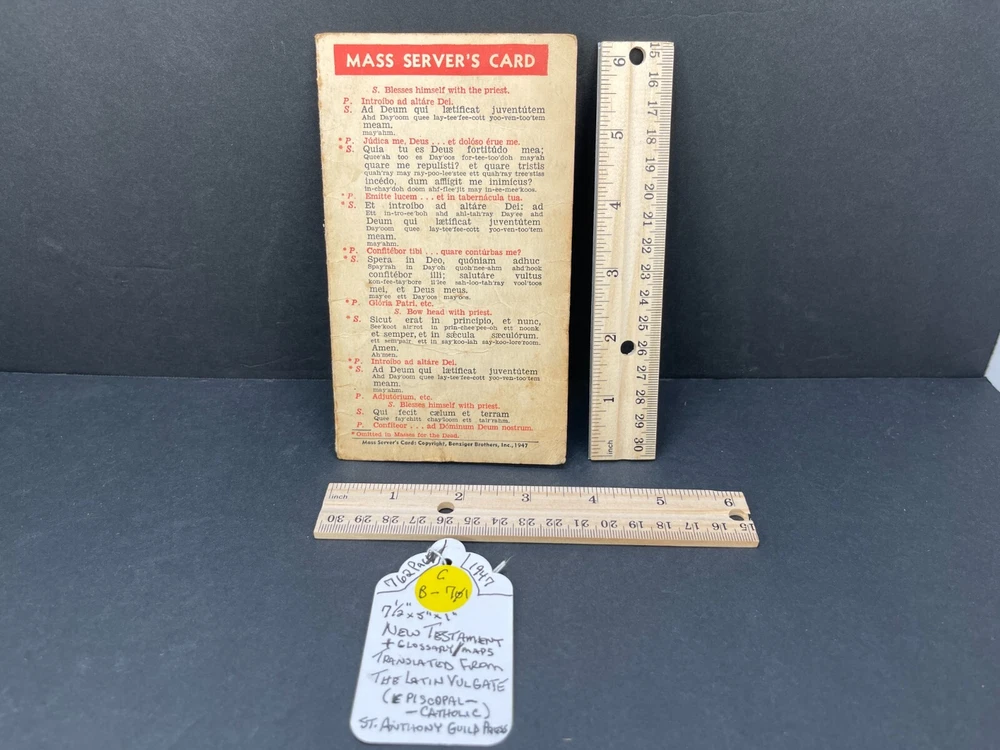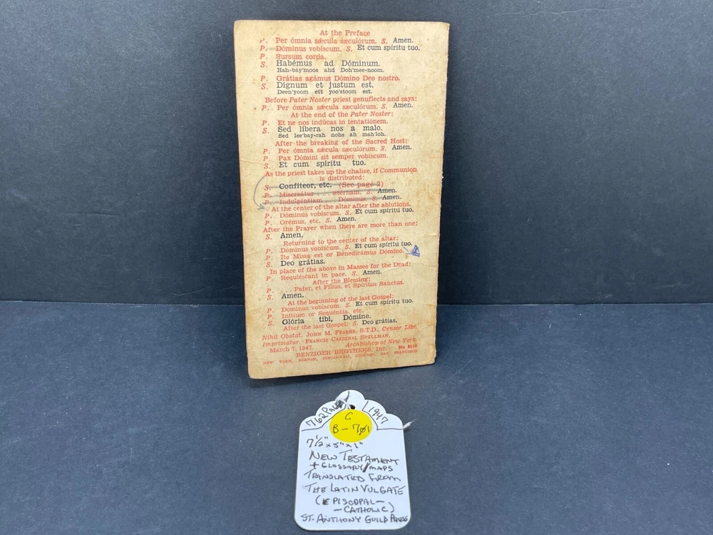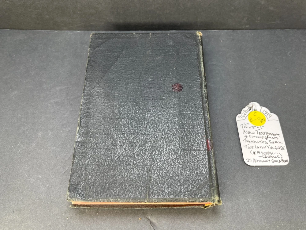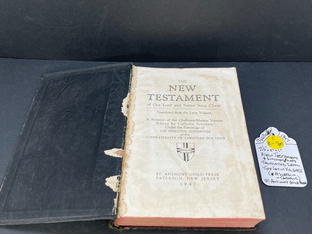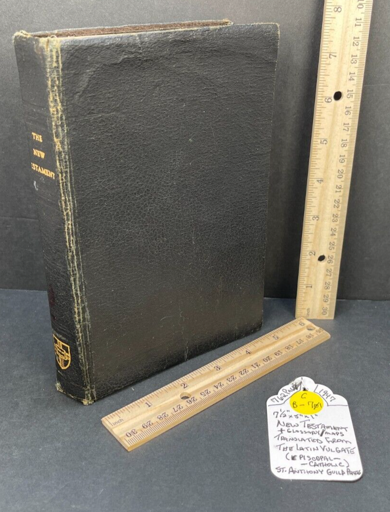 ONE(1) USED ANTIQUE NEW TESTAMENT BIBLE PUBLISHED IN 1947 BY ST. ANTHONY GUILD PRESS. THE BIBLE IS TRANSLATED FROM THE LATIN VULGATE. IT IS A REVISION OF THE CHALLONER-RHEIMS VERSION EDITED BY CATHOLIC SCHOLARS UNDER THE PATRONAGE OF THE EPISCOPAL COMMITTEE OF THE CONFRATERNITY OF CHRISTIAN DOCTRINE. THE BIBLE WAS PRINTED IN THE U.S.A. INCLUDED WITH THE BIBLE IS A 1947 MASS SERVER'S CARD , WITH ENGLISH AND LATIN. A RARE FIND ON ITS OWN. PLEASE CHECK OUT MY OTHER SALES, AS I AM SELLING OFF A LARGE BIBLE/ RELIGIOUS PRAYER BOOK COLLECTION!!! I WILL BE ADDING MORE BIBLES UNTIL THE ENTIRE COLLECTION IS POSTED!!! Please see the pictures as completion of the description. We will only accept a return if you did not get the pictured item, or our description is incorrect. PLEASE ASK QUESTIONS BEFORE YOU MAKE A PURCHASE, I REPLY QUICKLY!!! Buy with Confidence, you will get the exact item you see in the sale, and if you have any issues, just check my feedback and rest assured you are purchasing from a long time (25+ years), 100% perfect record EBAY'er. The 1947 ST. ANTHONY GUILD PRESS NEW TESTAMENT BIBLE will be well packed and shipped within 1 business days of payment! GOOD LUCK BUYERS!!!