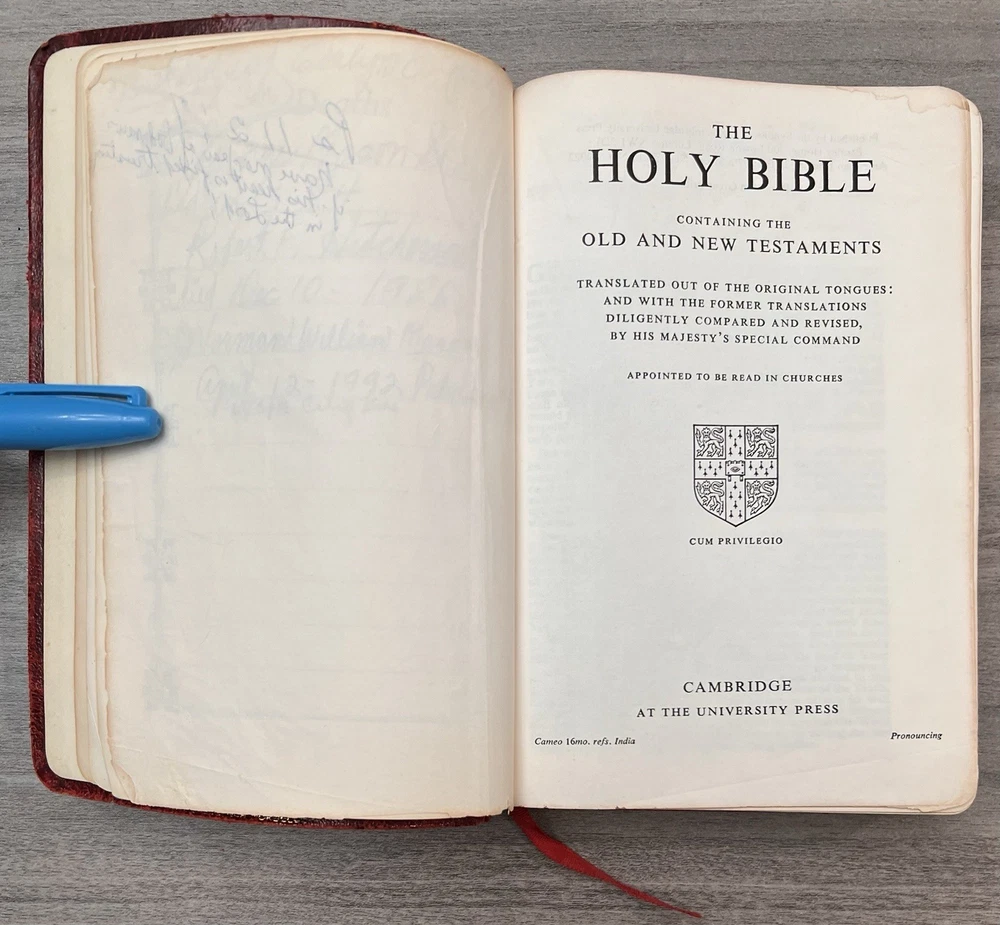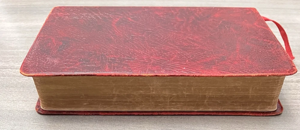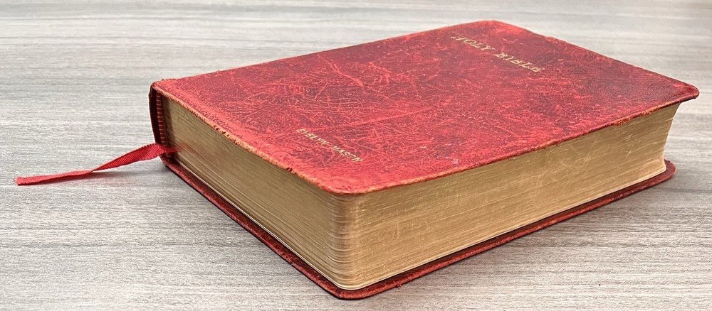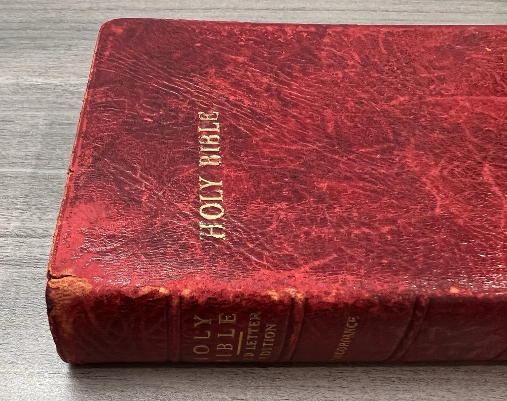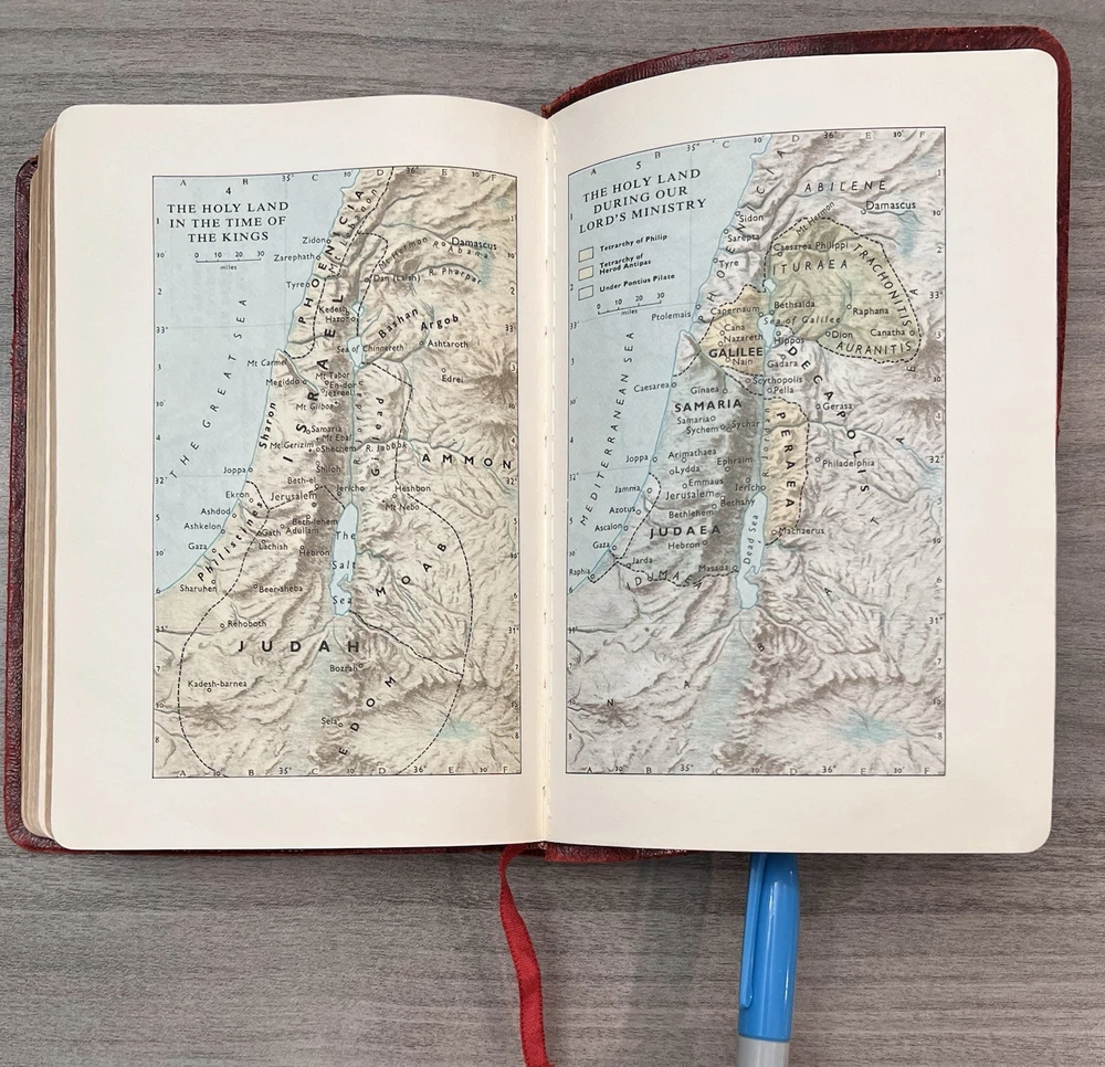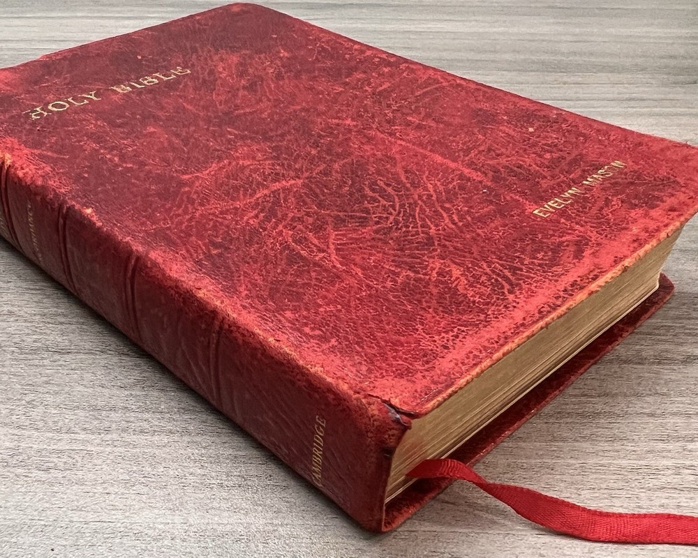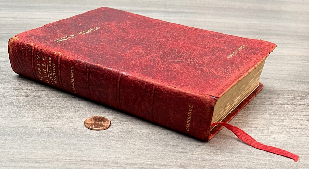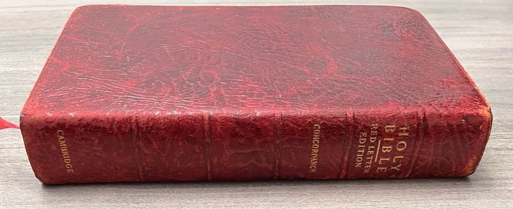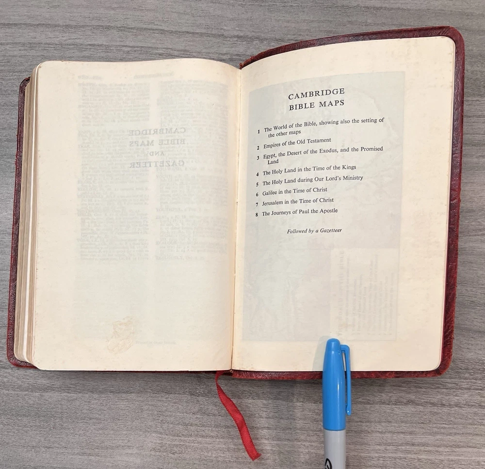 Cambridge Cameo KJV Holy Bible - 1975 - KJV Red Antique French Morocco Leather - Sewn Binding Concordance - Gazetteer - Eight Color Maps King James Version Handy Size Bible Double Column with Center Column References Gold Pages Edges Ribbon Marker Presentation Page and Family Pages Filled 74RXL = Stamped on Back of Volume Page Notes: I rated this Bible in acceptable condition. General aging, shelf wear and moderate usage wear for a 49-year old Bible (see photos). Cover wear. I flipped through the pages and found: This was a working Bible . Several pages with notes or underlining/marks. No fluorescent highlighting. Solid sewn binding. Still a Bible that can be carried to worship. Please view the photos for examples of content and condition. Thanks! Copyright/Published: 1975 (Based on Date on Presentation Page) Publisher: Cambridge (Printed in Great Britain) Binding: Textured Red French Antique Morocco Leather Softcovers Dimensions : ~7.38" x ~5.13"; width = ~1.18" Pages: Pre-Genesis text pages + 1109 + 339 + 152 + 3+ Color Maps and Gazetteer Visit our Ebay Store for more books like this one. Our books are sold as-is. Please email any questions prior to purchasing. Thanks!