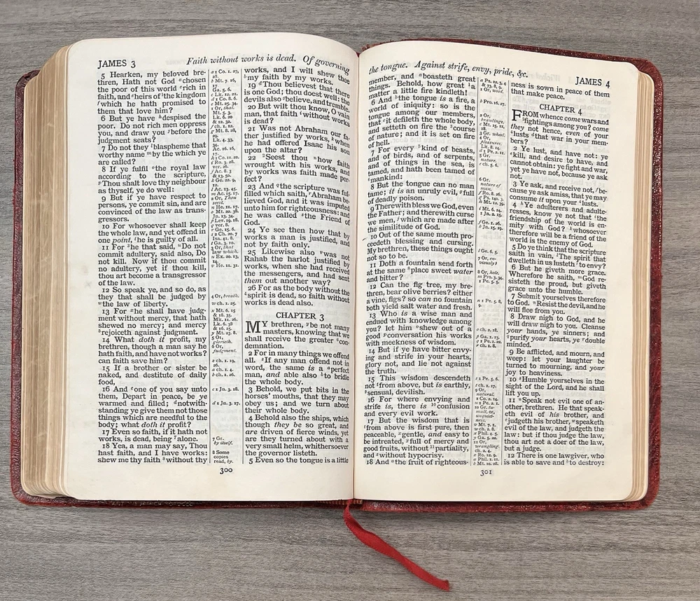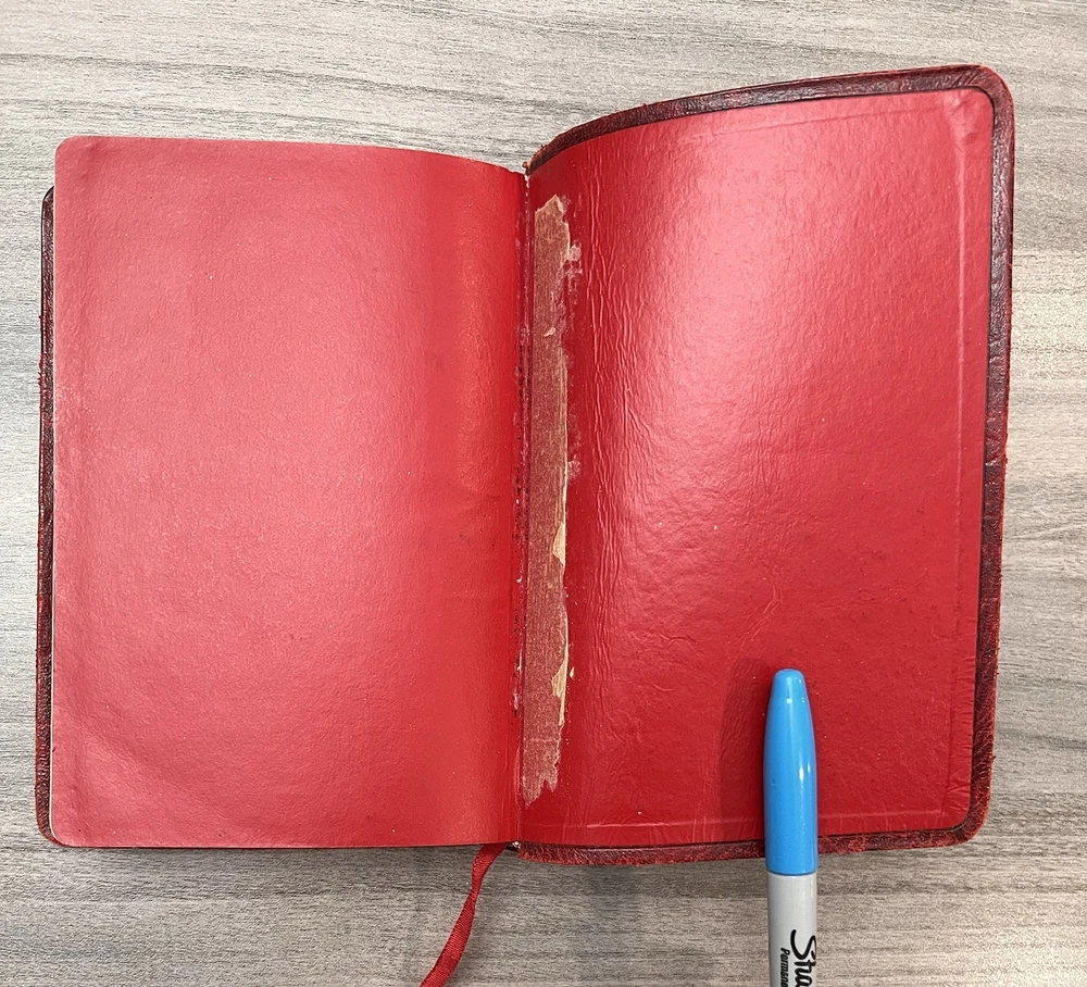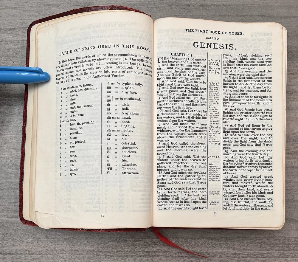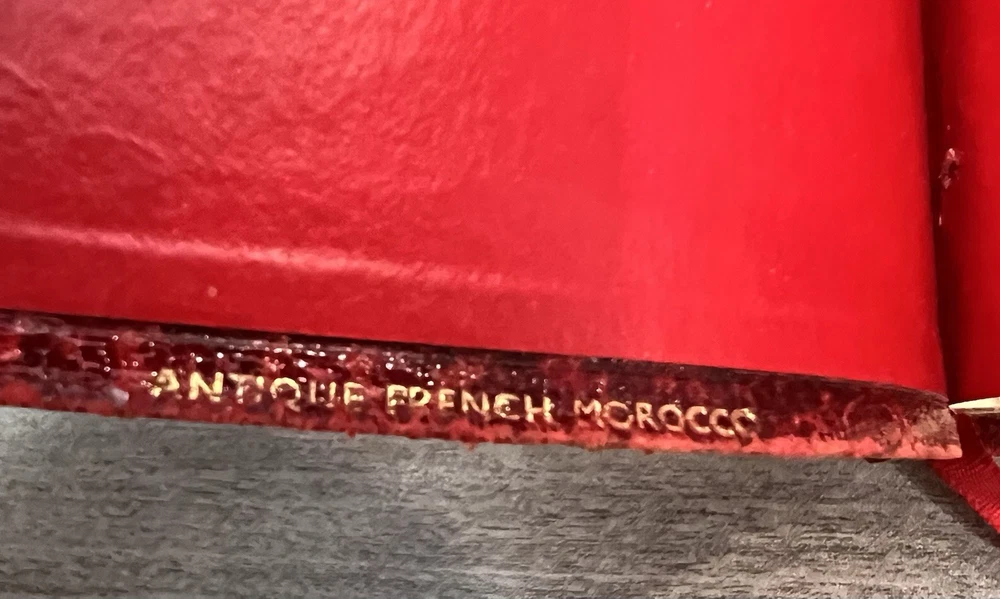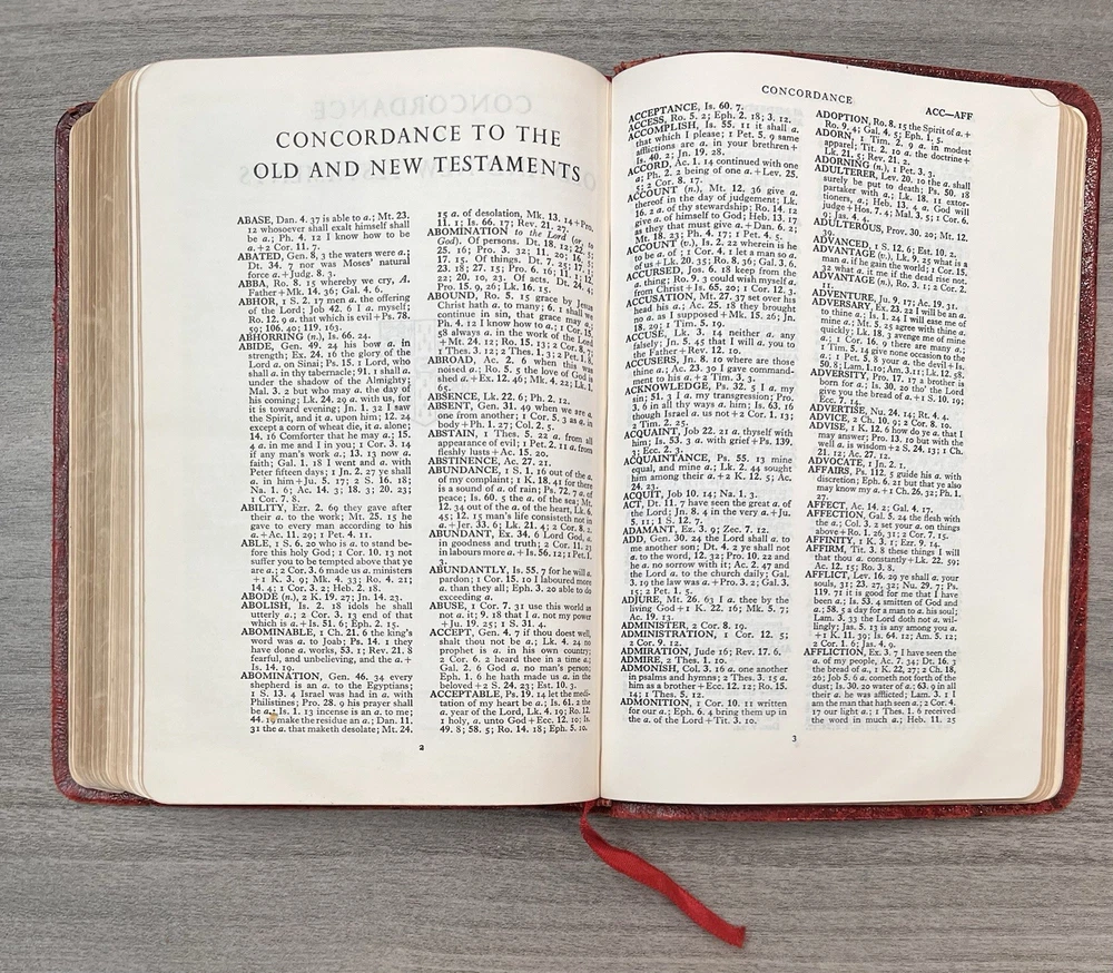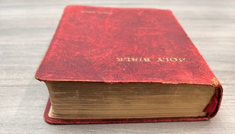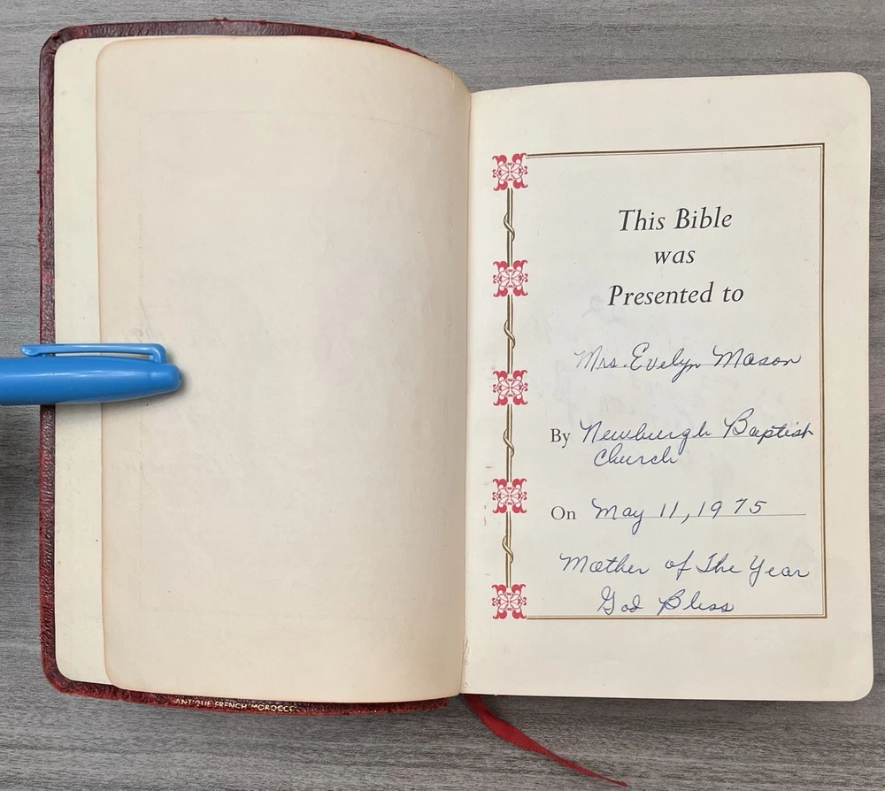 Cambridge Cameo KJV Holy Bible - 1975 - KJV Red Antique French Morocco Leather - Sewn Binding Concordance - Gazetteer - Eight Color Maps King James Version Handy Size Bible Double Column with Center Column References Gold Pages Edges Ribbon Marker Presentation Page and Family Pages Filled 74RXL = Stamped on Back of Volume Page Notes: I rated this Bible in acceptable condition. General aging, shelf wear and moderate usage wear for a 49-year old Bible (see photos). Cover wear. I flipped through the pages and found: This was a working Bible . Several pages with notes or underlining/marks. No fluorescent highlighting. Solid sewn binding. Still a Bible that can be carried to worship. Please view the photos for examples of content and condition. Thanks! Copyright/Published: 1975 (Based on Date on Presentation Page) Publisher: Cambridge (Printed in Great Britain) Binding: Textured Red French Antique Morocco Leather Softcovers Dimensions : ~7.38" x ~5.13"; width = ~1.18" Pages: Pre-Genesis text pages + 1109 + 339 + 152 + 3+ Color Maps and Gazetteer Visit our Ebay Store for more books like this one. Our books are sold as-is. Please email any questions prior to purchasing. Thanks!
