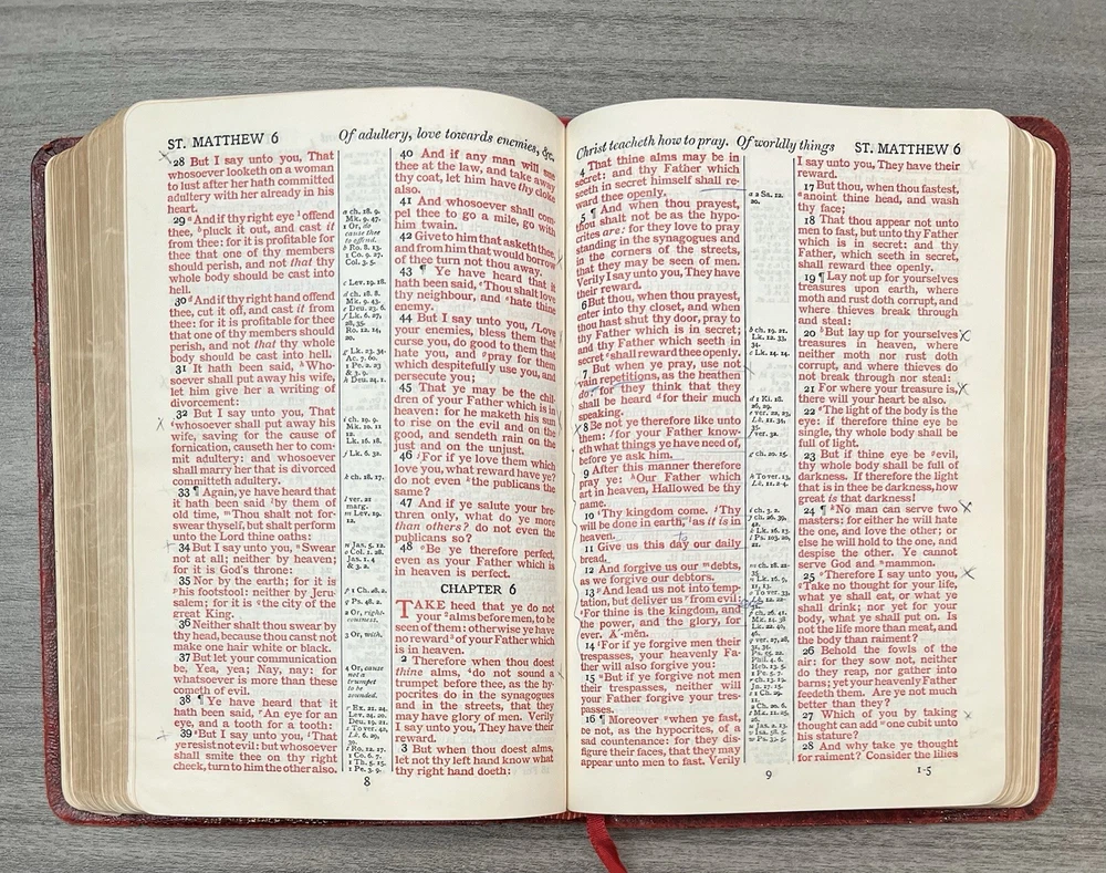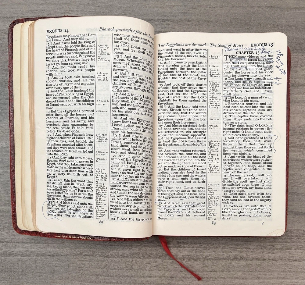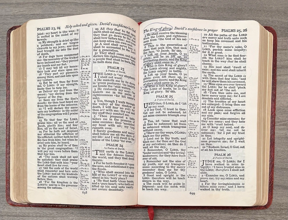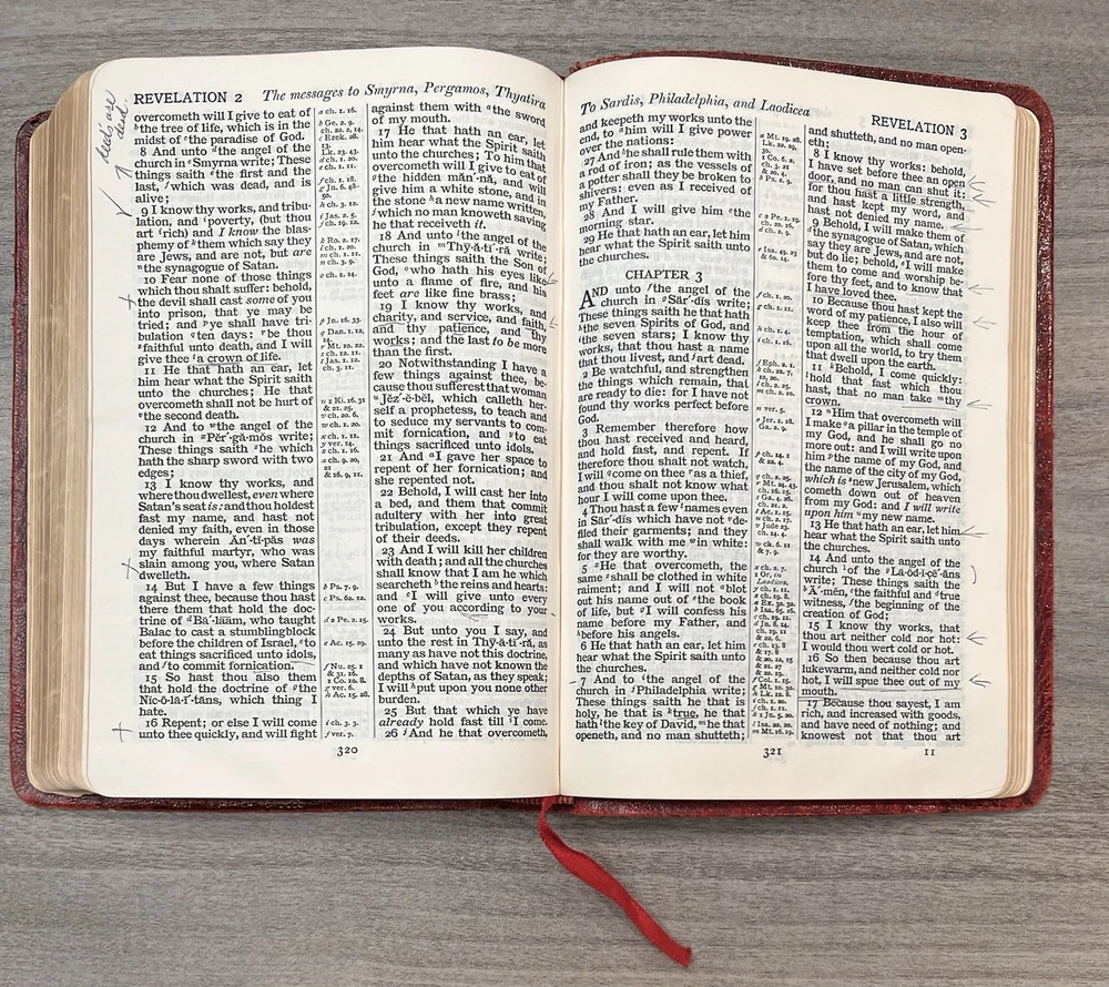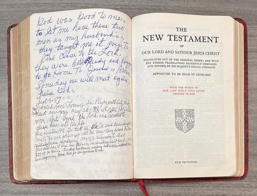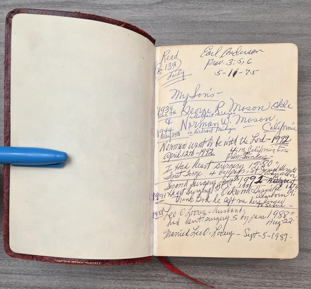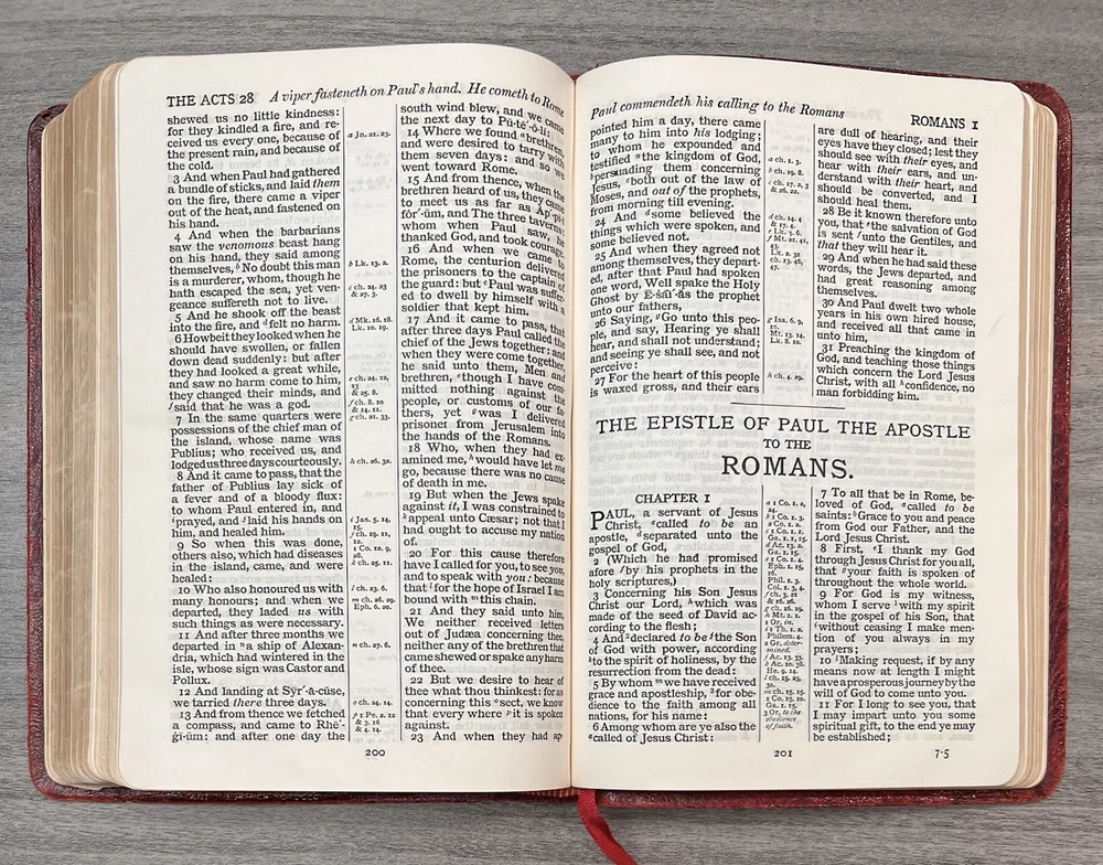 Cambridge Cameo KJV Holy Bible - 1975 - KJV Red Antique French Morocco Leather - Sewn Binding Concordance - Gazetteer - Eight Color Maps King James Version Handy Size Bible Double Column with Center Column References Gold Pages Edges Ribbon Marker Presentation Page and Family Pages Filled 74RXL = Stamped on Back of Volume Page Notes: I rated this Bible in acceptable condition. General aging, shelf wear and moderate usage wear for a 49-year old Bible (see photos). Cover wear. I flipped through the pages and found: This was a working Bible . Several pages with notes or underlining/marks. No fluorescent highlighting. Solid sewn binding. Still a Bible that can be carried to worship. Please view the photos for examples of content and condition. Thanks! Copyright/Published: 1975 (Based on Date on Presentation Page) Publisher: Cambridge (Printed in Great Britain) Binding: Textured Red French Antique Morocco Leather Softcovers Dimensions : ~7.38" x ~5.13"; width = ~1.18" Pages: Pre-Genesis text pages + 1109 + 339 + 152 + 3+ Color Maps and Gazetteer Visit our Ebay Store for more books like this one. Our books are sold as-is. Please email any questions prior to purchasing. Thanks!