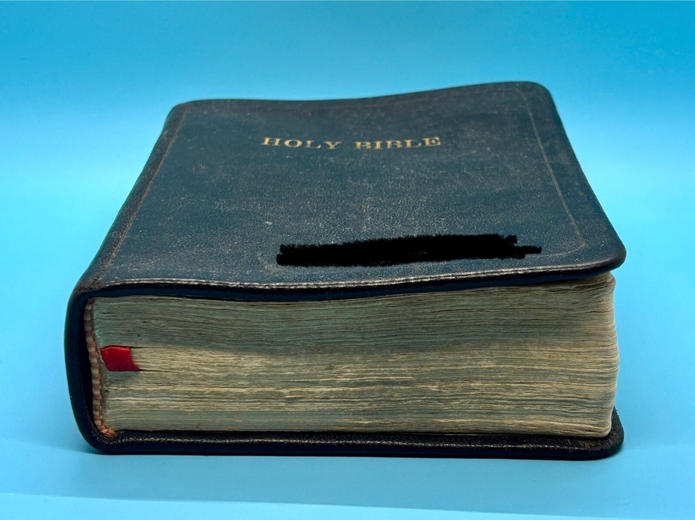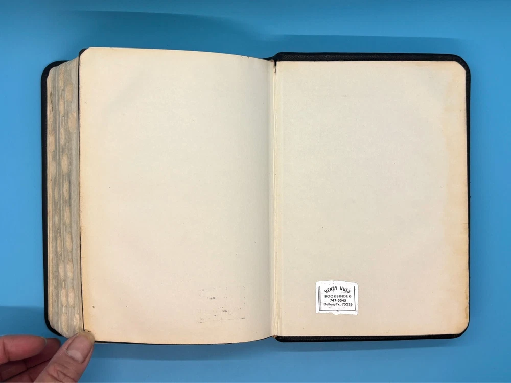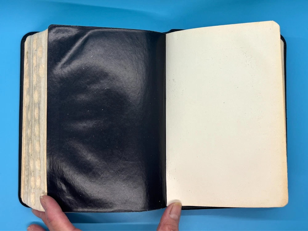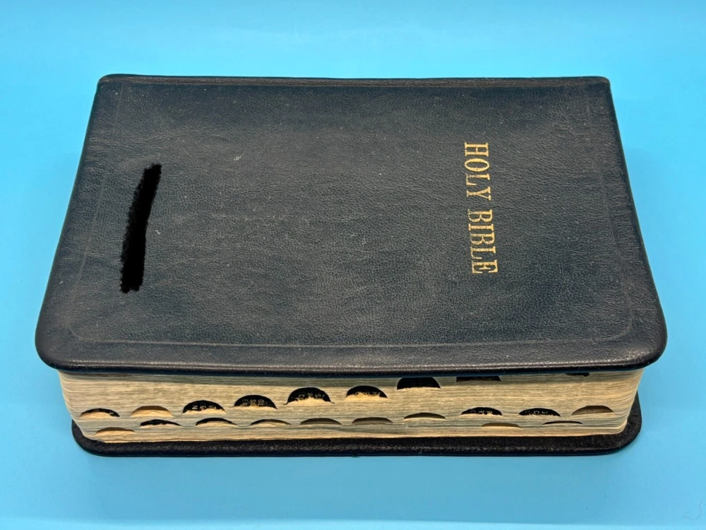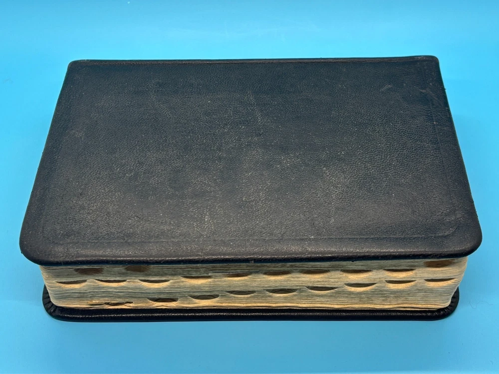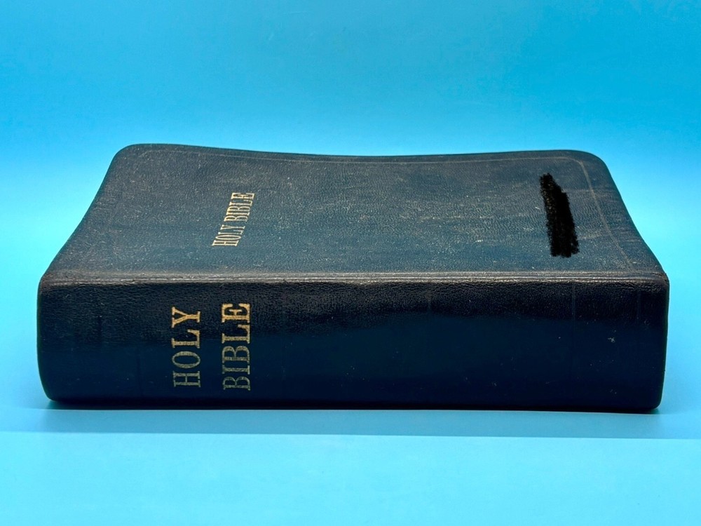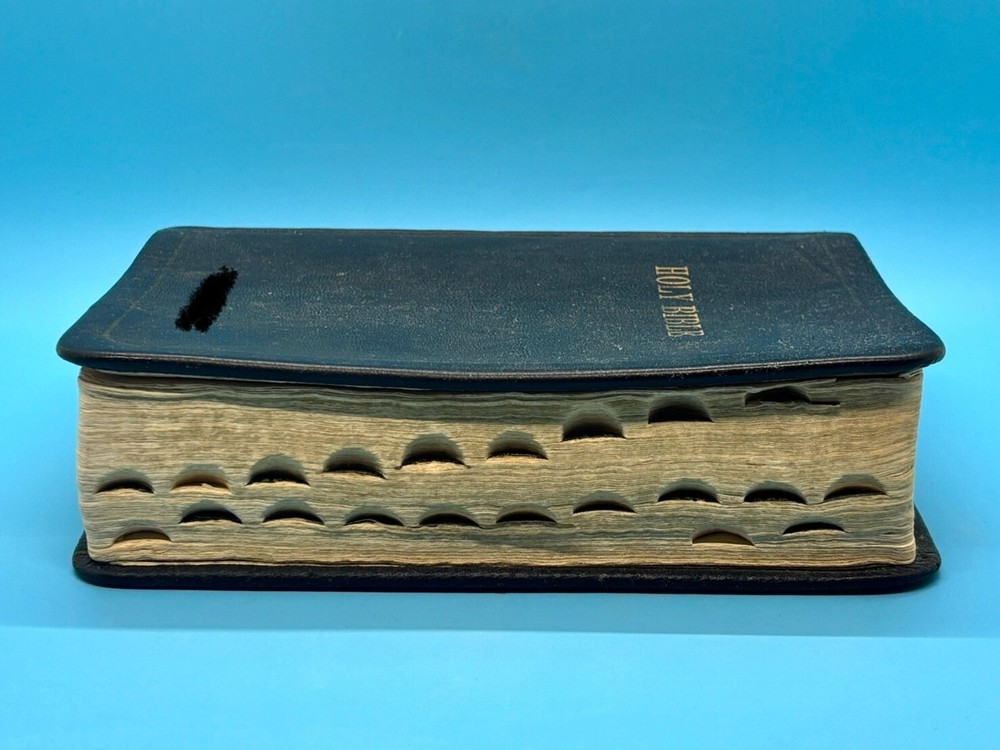 Cambridge Black Leather KJV Bible Indexed Red Letter Concordance Dictionary Maps This appears to be a re-bound Bible with black leather covers. Cover has owner's name, which is blacked out in photos. No writing on inscription page. Some pages have stains. There is some writing and highlighting inside but it is not excessive. Red letter edition. Bible is indexed - some of the index markers are different from the others. Faded gold gilded pages. Concordance, maps, and concise dictionary are at the end. Text is dark and clearly legible. Red cloth bookmark. See photos for details on condition. Cover is 7-1/4" from top to bottom. Photos show exact item being sold. Will ship free via USPS Ground Advantage.