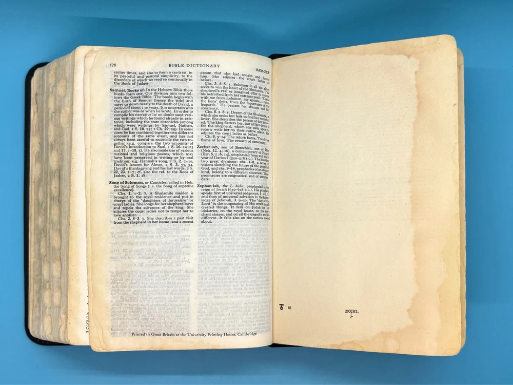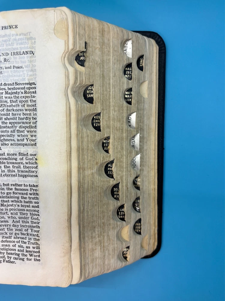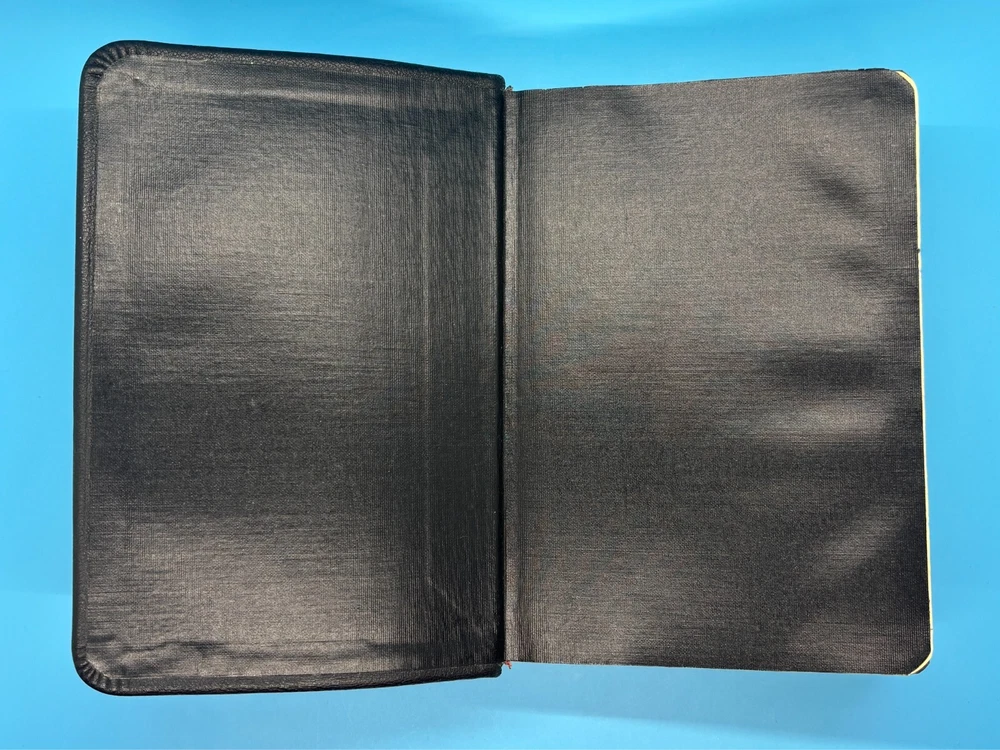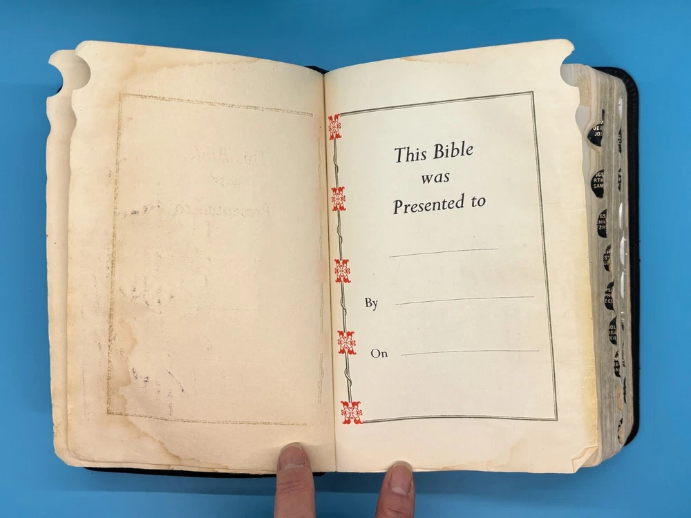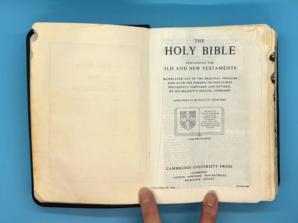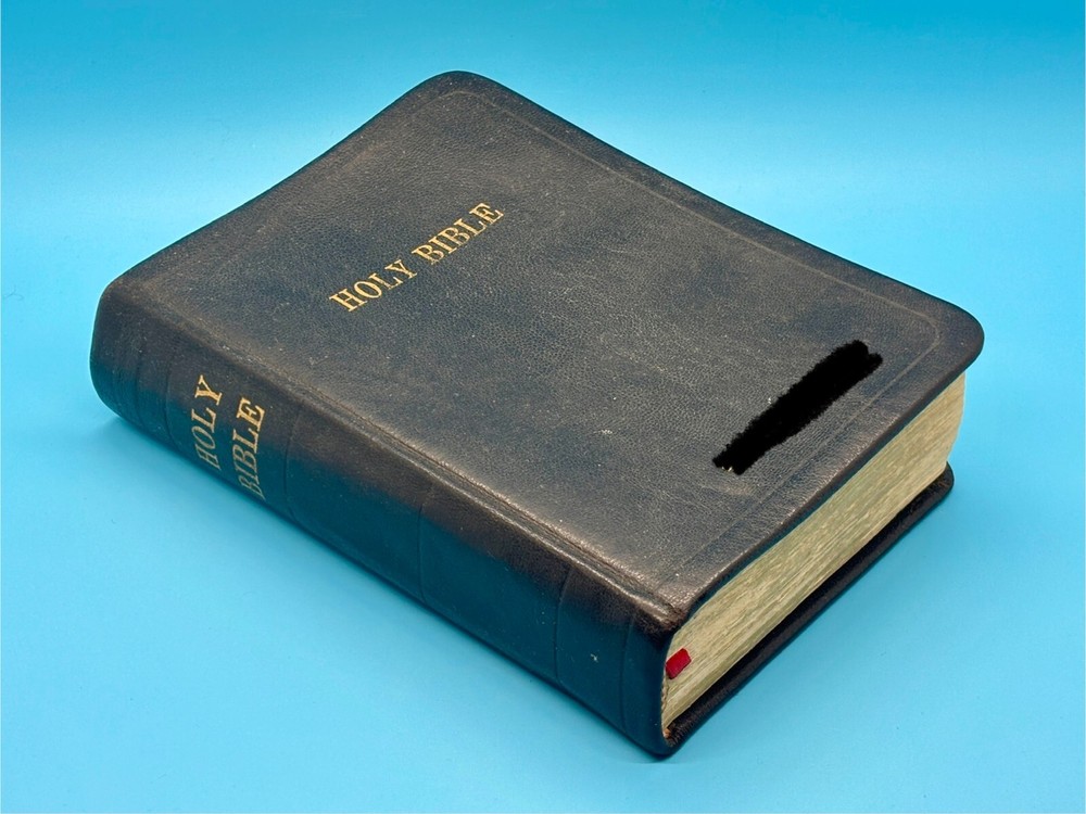 Cambridge Black Leather KJV Bible Indexed Red Letter Concordance Dictionary Maps This appears to be a re-bound Bible with black leather covers. Cover has owner's name, which is blacked out in photos. No writing on inscription page. Some pages have stains. There is some writing and highlighting inside but it is not excessive. Red letter edition. Bible is indexed - some of the index markers are different from the others. Faded gold gilded pages. Concordance, maps, and concise dictionary are at the end. Text is dark and clearly legible. Red cloth bookmark. See photos for details on condition. Cover is 7-1/4" from top to bottom. Photos show exact item being sold. Will ship free via USPS Ground Advantage.