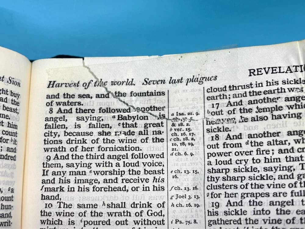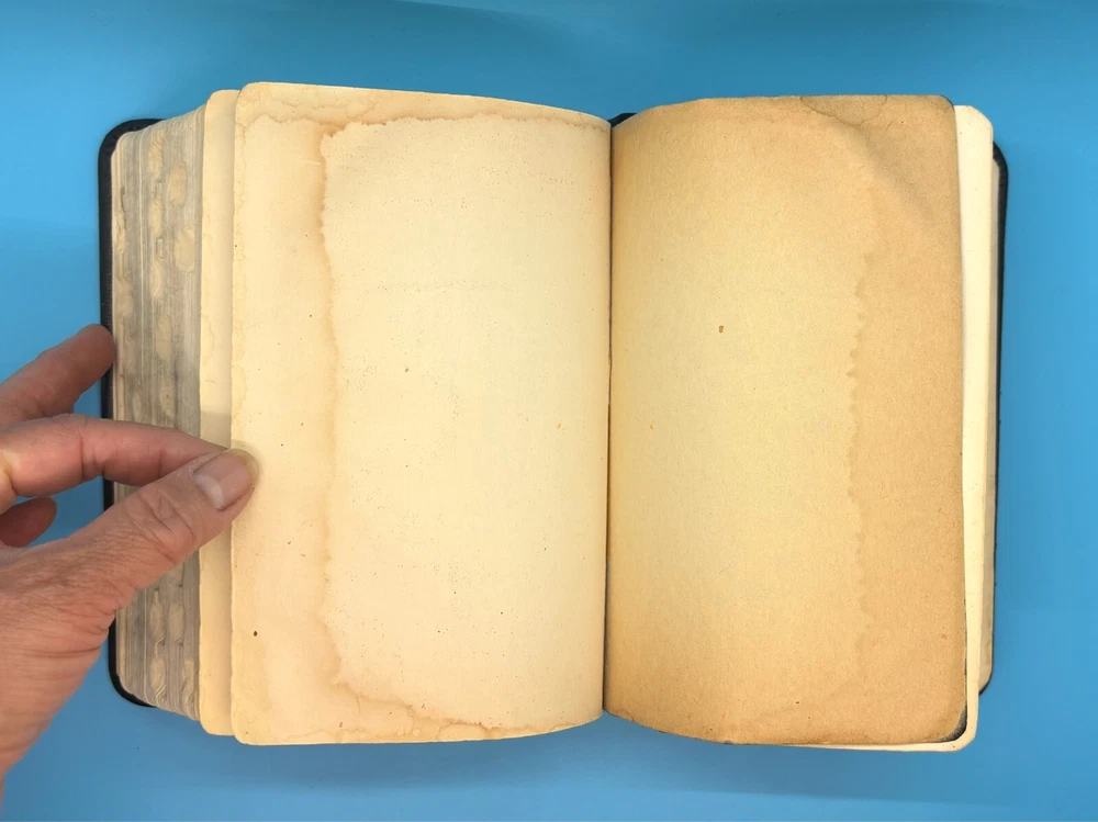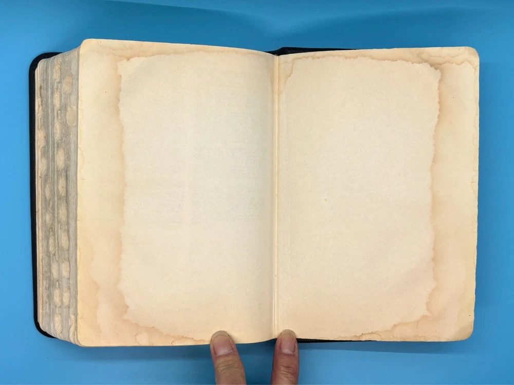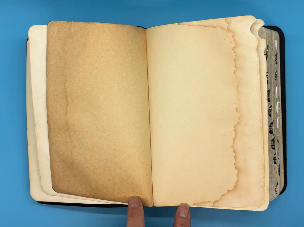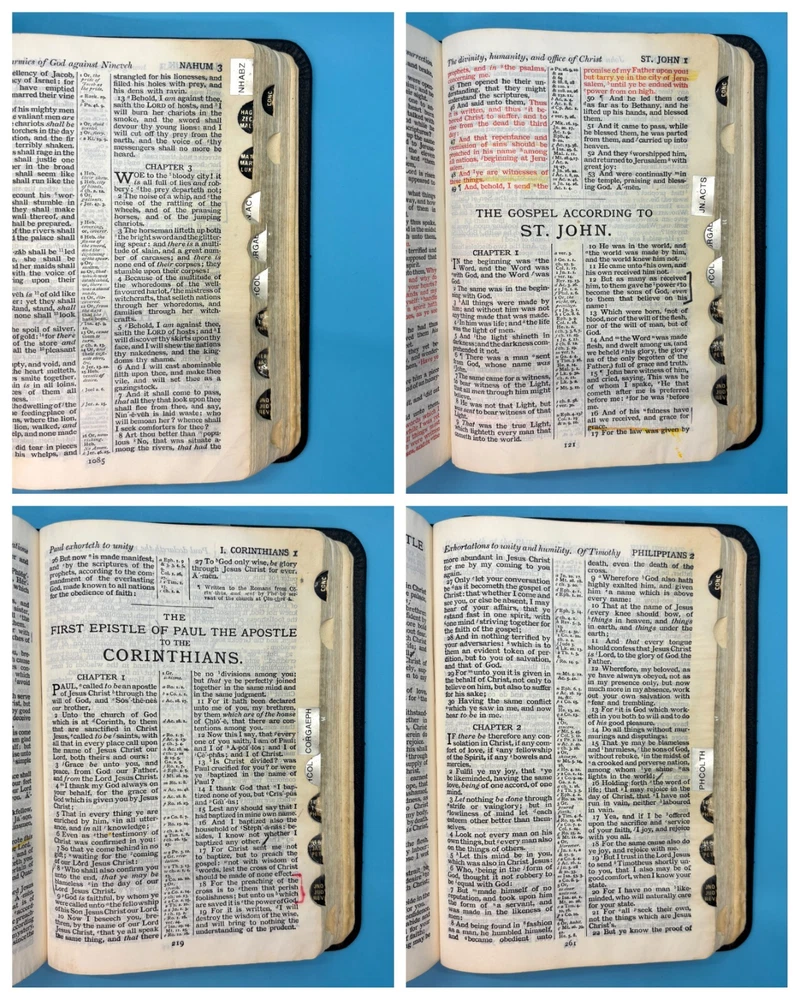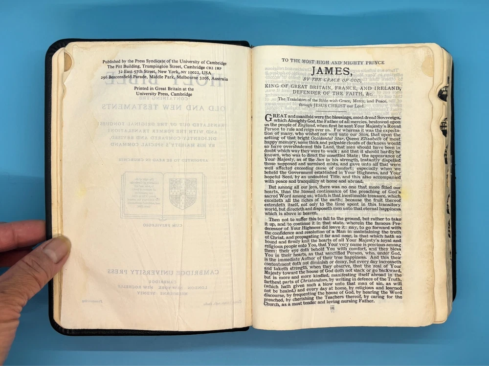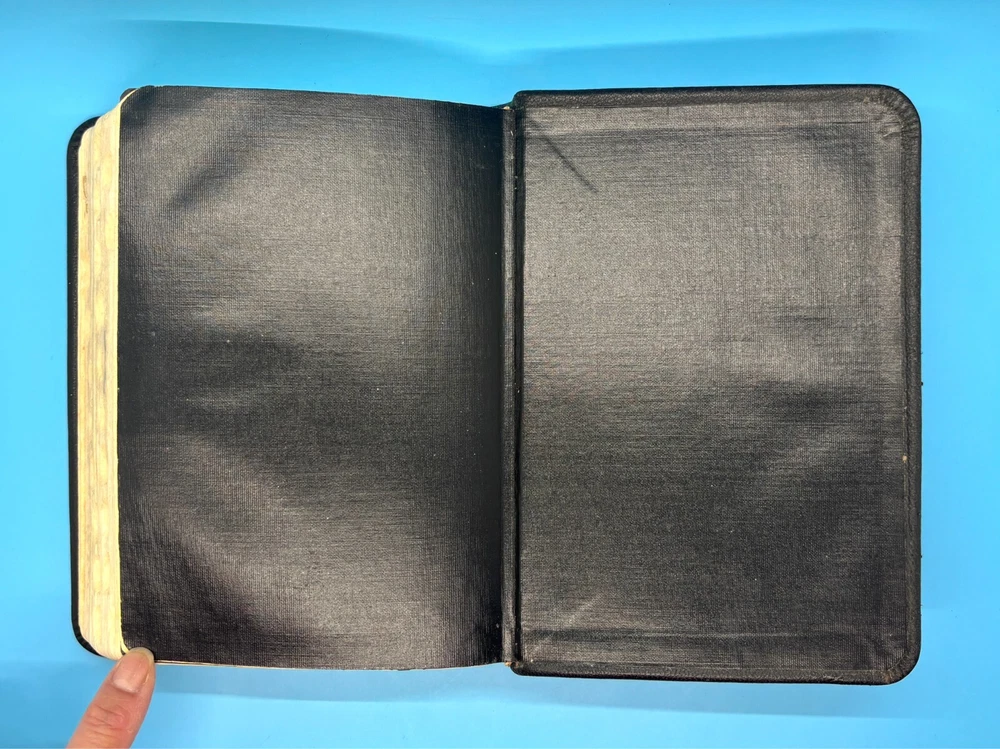 Cambridge Black Leather KJV Bible Indexed Red Letter Concordance Dictionary Maps This appears to be a re-bound Bible with black leather covers. Cover has owner's name, which is blacked out in photos. No writing on inscription page. Some pages have stains. There is some writing and highlighting inside but it is not excessive. Red letter edition. Bible is indexed - some of the index markers are different from the others. Faded gold gilded pages. Concordance, maps, and concise dictionary are at the end. Text is dark and clearly legible. Red cloth bookmark. See photos for details on condition. Cover is 7-1/4" from top to bottom. Photos show exact item being sold. Will ship free via USPS Ground Advantage.