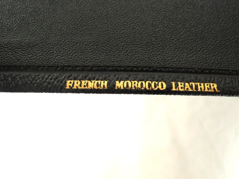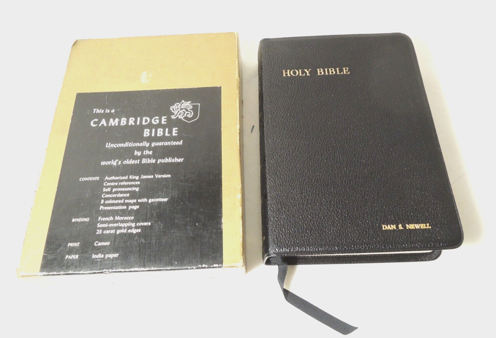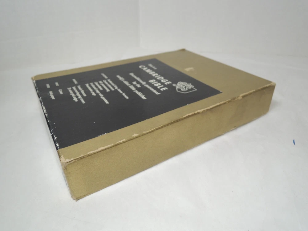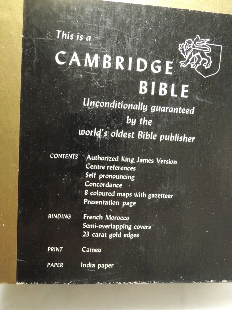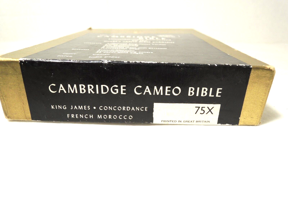 This Cambridge Cameo Bible has French Morocco Leather Style# 75X King James Version Cameo print style Original Box Color Maps Concordance 23 Karat gold page edges Approximate dimensions: 7-1/4 X 5 X 1-1/8 inches [18.4 x 12.7 x 3 cm] Published in U.K.