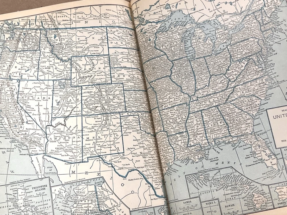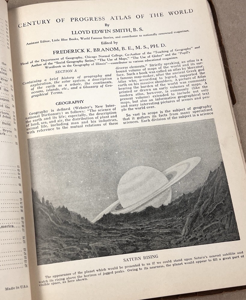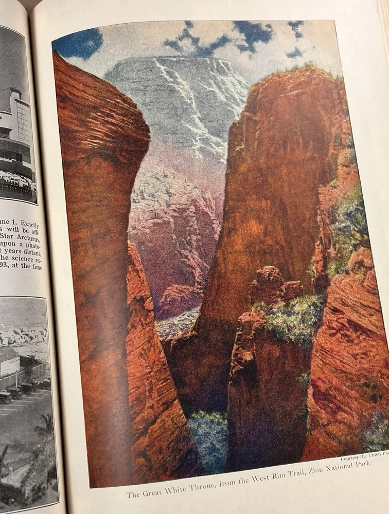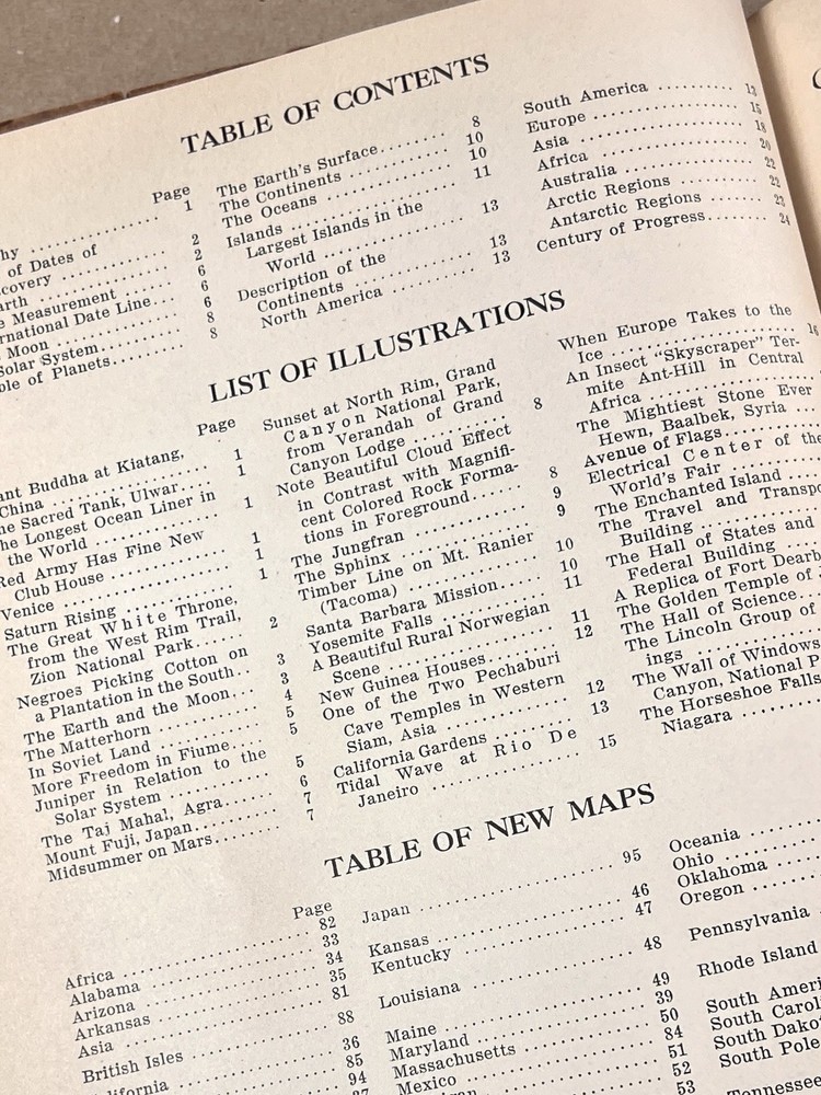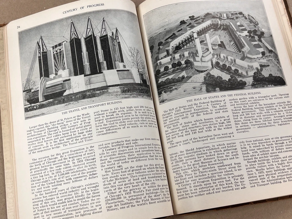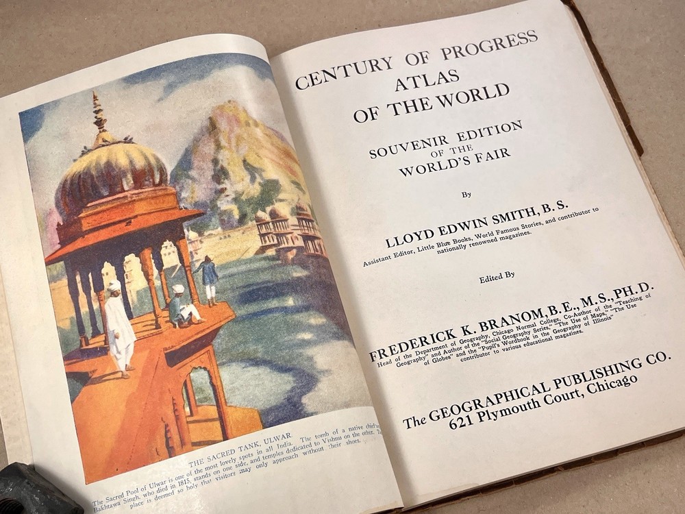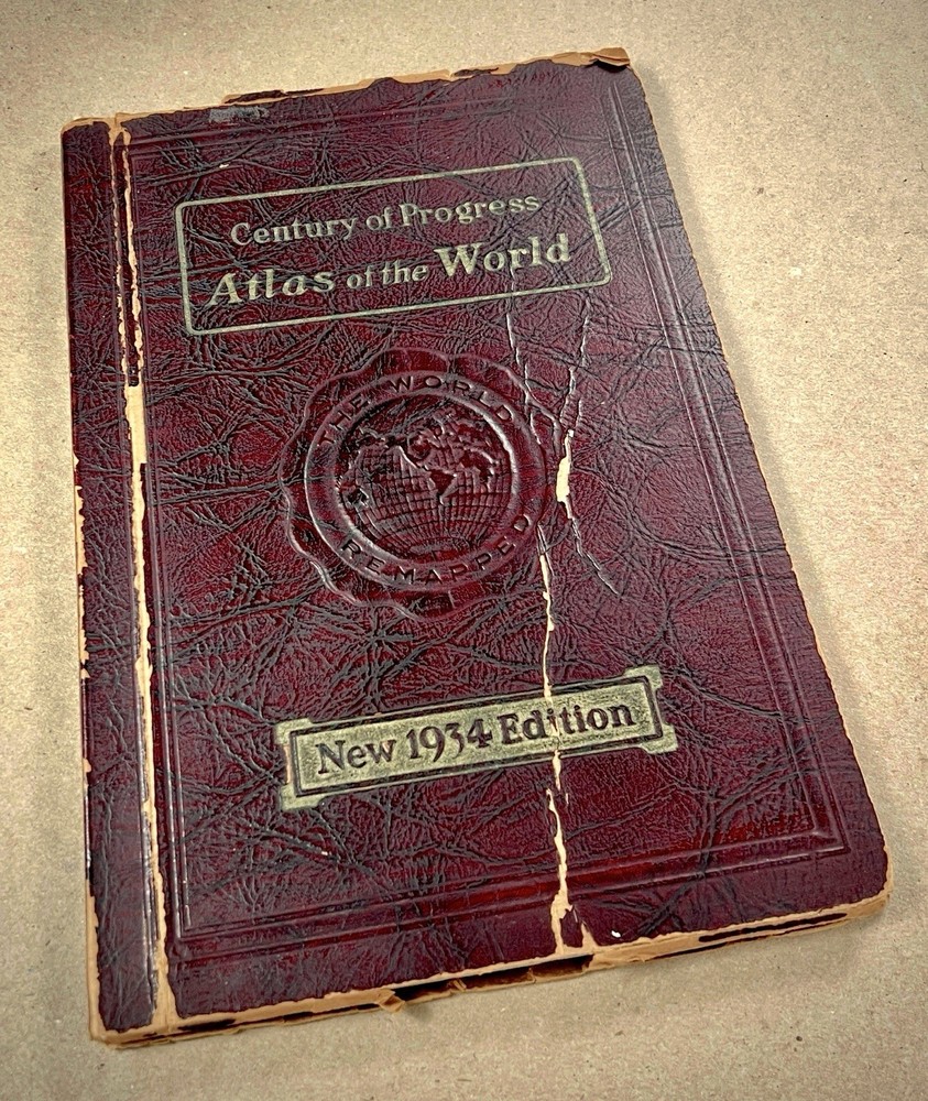 Century of Progress Atlas of the World 1934 Edition Chicago Worlds Fair The century of progress International Exposition was a World's Fair held in Chicago from 1933 to 1934 to celebrate the city's centennial. The fair showcased technological innovations and cultural exhibits, attracting millions of visitors during the depths of the Great Depression. This lovely volume features maps reflecting the geopolitical landscape of the time as well as scientific information about the earth and solar system, islands and continents as well as a chapter on the fair and its attractions. Measures 10 1/4" x 7 3/8" with 108 numbered pages. Richly illustrated with Color and B&W images. Flexible burgundy faux leather wraps. The covers extend beyond the text block as show minimal wear. Vertical cover ship. The bindings are tight, pages clean and complete. A nice copy in good vintage condition. Please see photos for more detailed condition review. Questions welcome. (Please consider adding us to your our "saved sellers" list as we are always adding new items.)