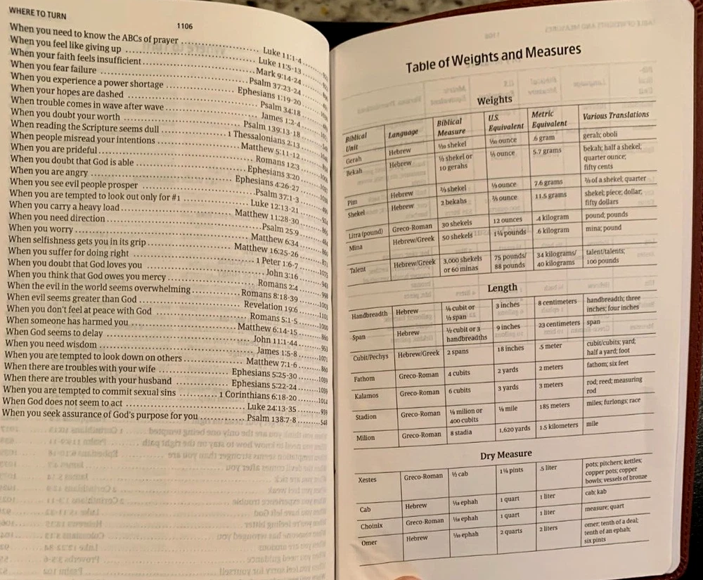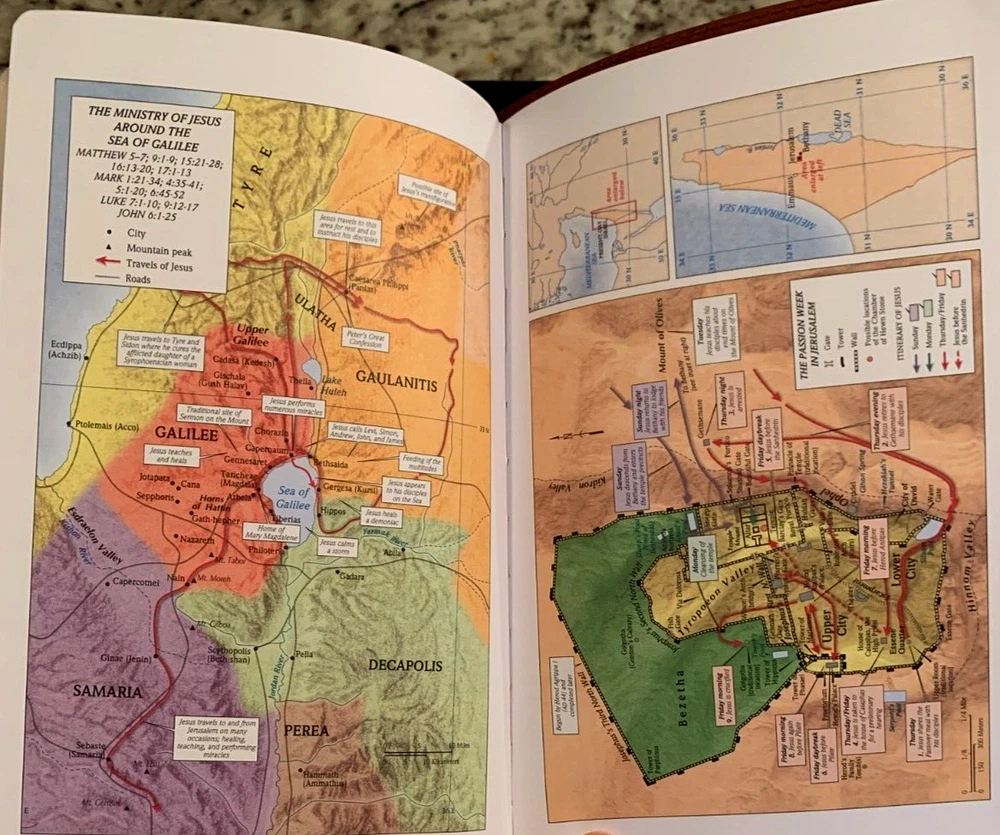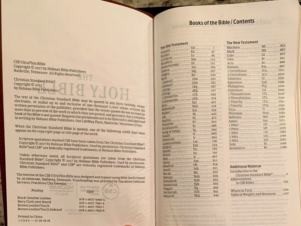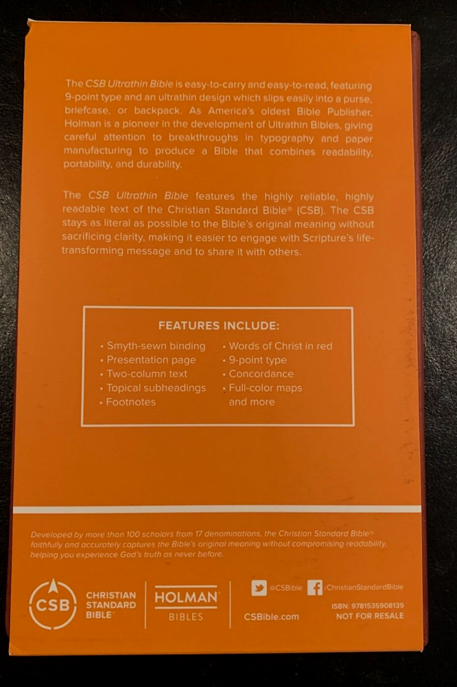 * Wonderful BRAND NEW Christian Standard Bible in Gift Protective Cover * Several helpful study tools including concordance, "Where to Turn" Index, Tables of Weights and Measures, and 8 pages of maps of the Holy Land and other ancient areas * Features include : Red Letter edition, luxury onion thin paper, gold gilded edges, 2 sewn in satin book marks, presentation page, Smyth-sewn binding, two-column text, topical subheadings, 9-point type, brown LeatherPoint cover * Ultra thin --6 x 9 x 1 slips easily into purse, briefcase, or backpack * Developed by more than 100 Bible scholars from 17 denominations to result in an accurate and easy to read version, published by Holman -- America's oldest Bible publisher