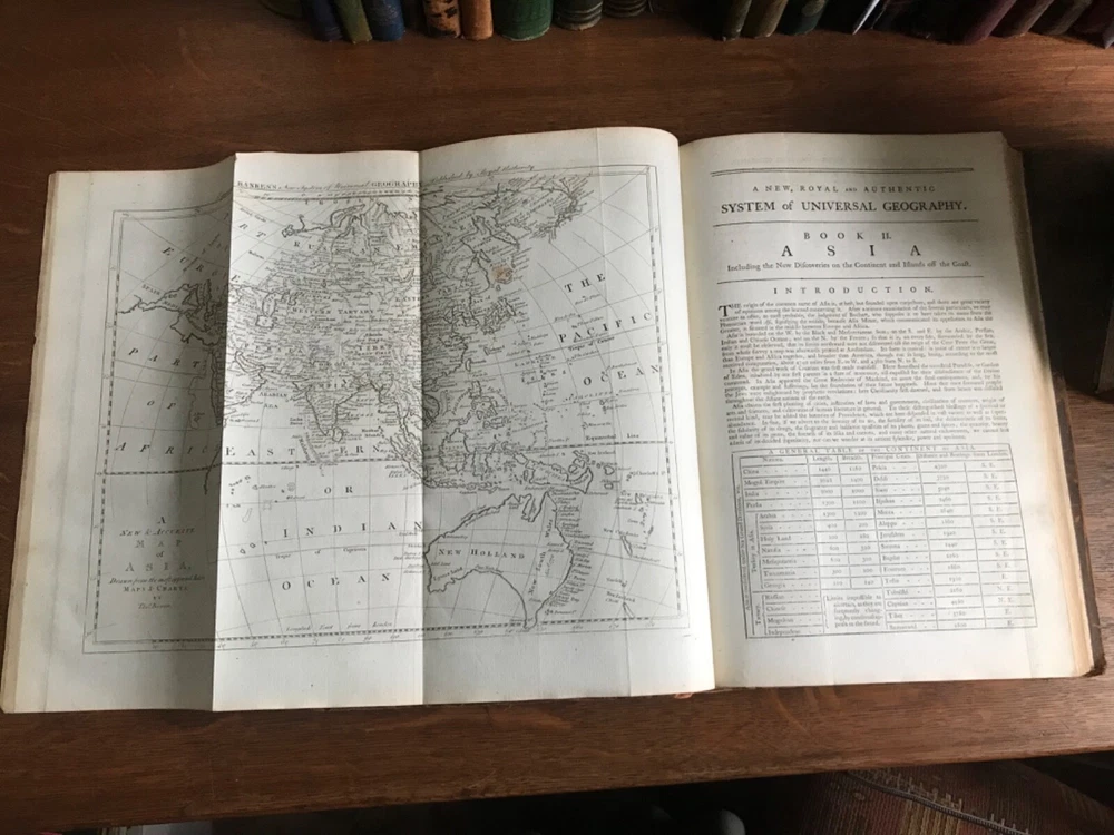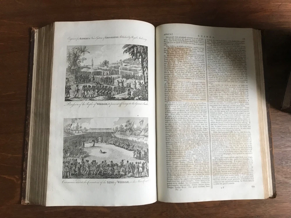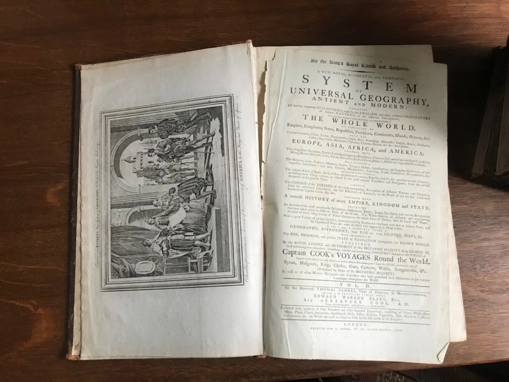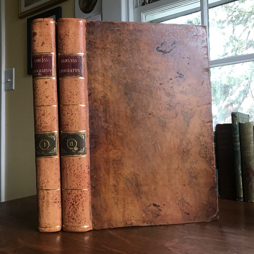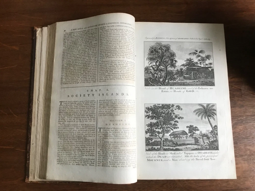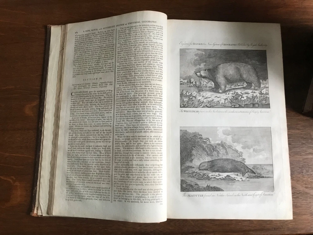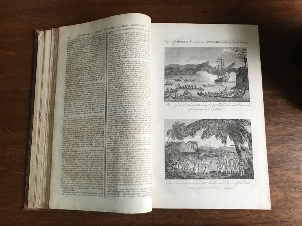 A New Royal Authentic and Complete System of Universal Geography, Antient and Modern… Thomas Bankes, Edward Warren Blake, Alexander Cook, Thomas Lloyd, Embellished with nearly Two Hundred Engravings, consisting of Views, Antiquities, Customs, Ceremonies, besides Whole Sheet Maps, Plans, Charts, &c. Executed in a much superior stile than any Thing that has ever appeared in this Kingdom. Printed for C. Cooke, London, circa 1790, Volume I: 1-460 pp, Volume II: 460-990 pp, full original leather, 15.5 x 10.25”, elephant folios. In good condition. Spines handsomely rebacked with original spine labels reattached. Very nice and sturdy. Light wear to extremities with moderate scuffing to corners. Original leather is peeling along edges. A fine leather was used for this binding. Remnants from a bookplate on pastedowns. Interiors are bright and clean. Light offsetting from plates with minor instance of age stain. Free of known markings. Lacking map of West Indies 517 pp, Map of United States, 492 pp. all else complete. Folding maps are in good working order. Internally fresh and attractively bound. A solid set. Please see photos. Early edition. Collated, not quite complete. This book went through six editions in the 1790’s and was revised to reflect new discoveries and English interest in the colony of New Holland. Much of the content deals with the South Pacific, Cook’s Voyages, and Australia (New Holland). Many of the illustrations were derived from Cook’s voyages, and were the most generally available representations of the natives of the Pacific Northwest including the Salish, Tasmania, New Zealand, Hawaii & the Pacific accessible to the public at the time. RAREB1790TXYR