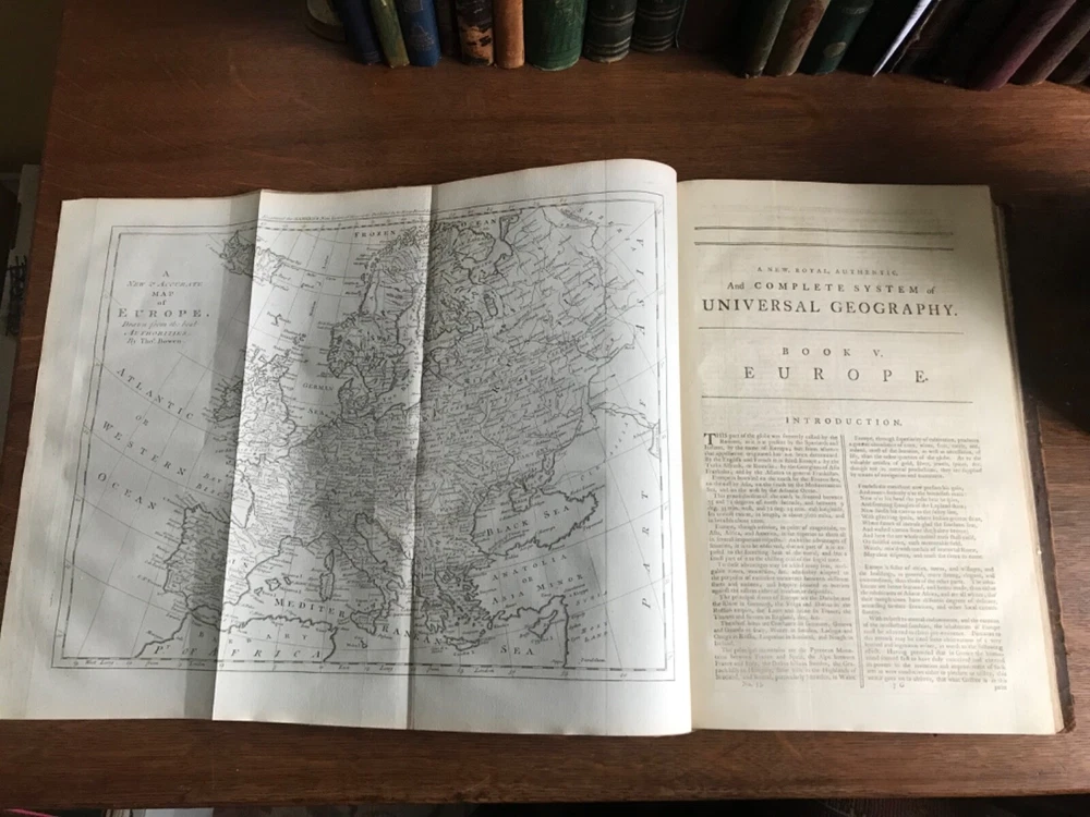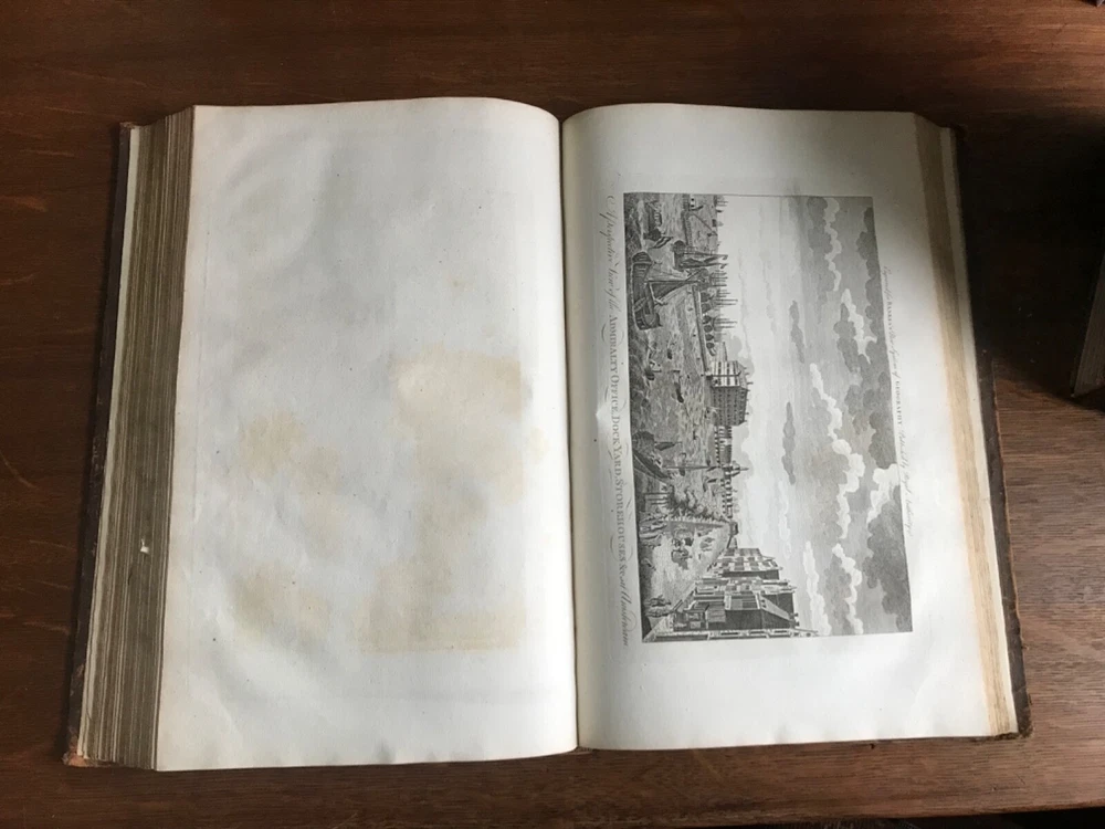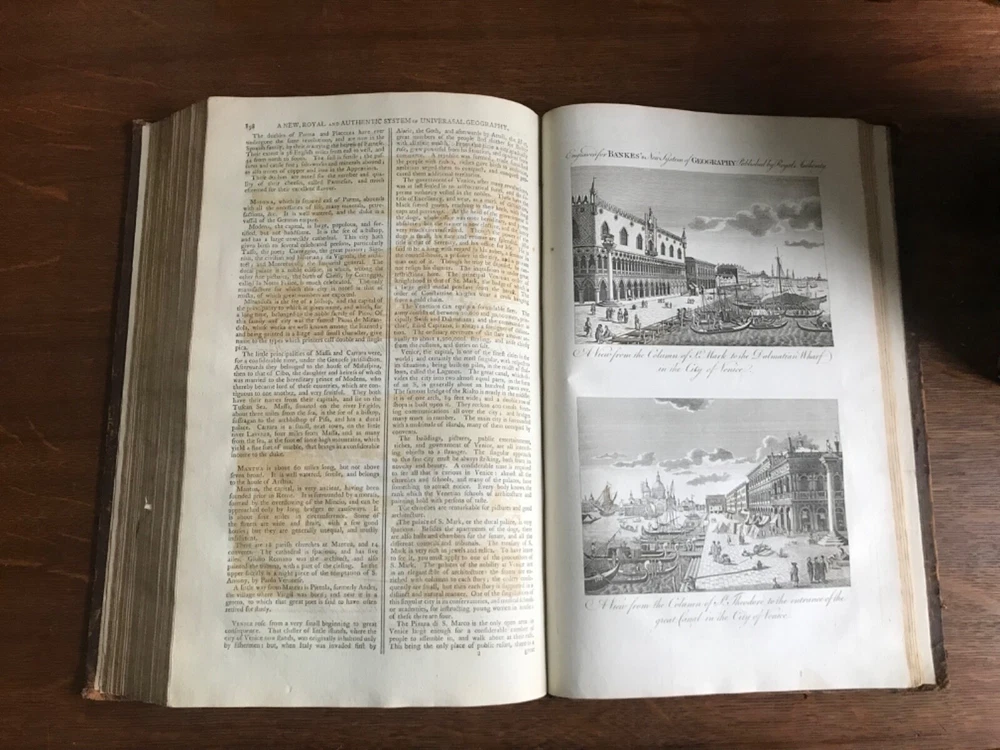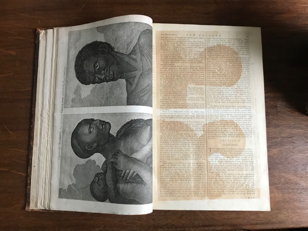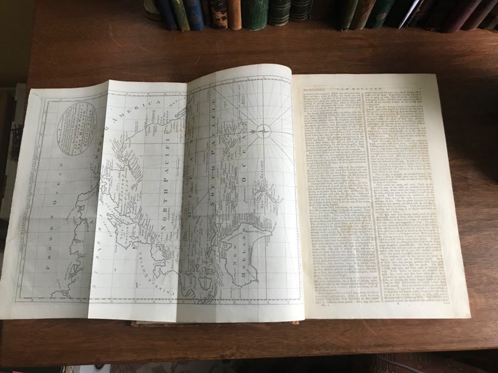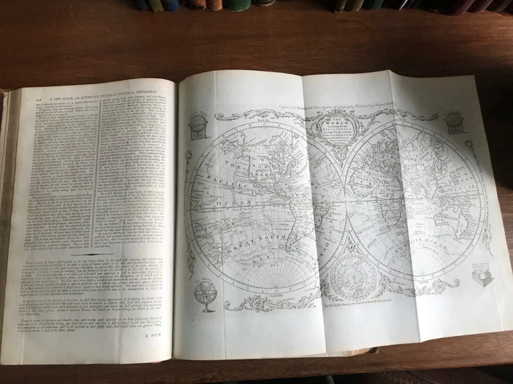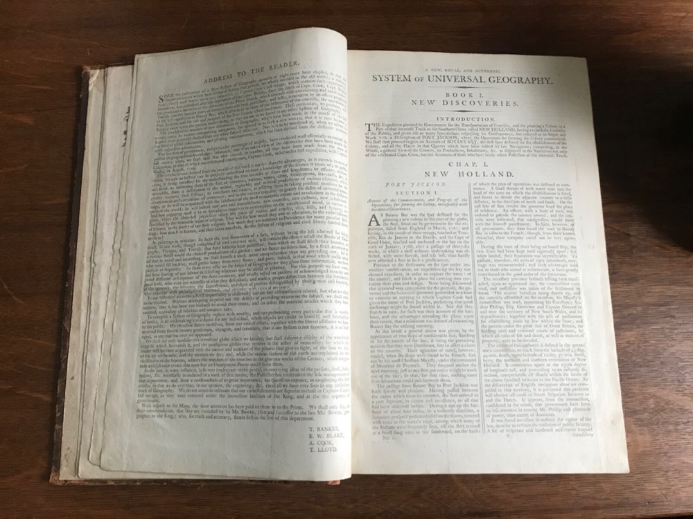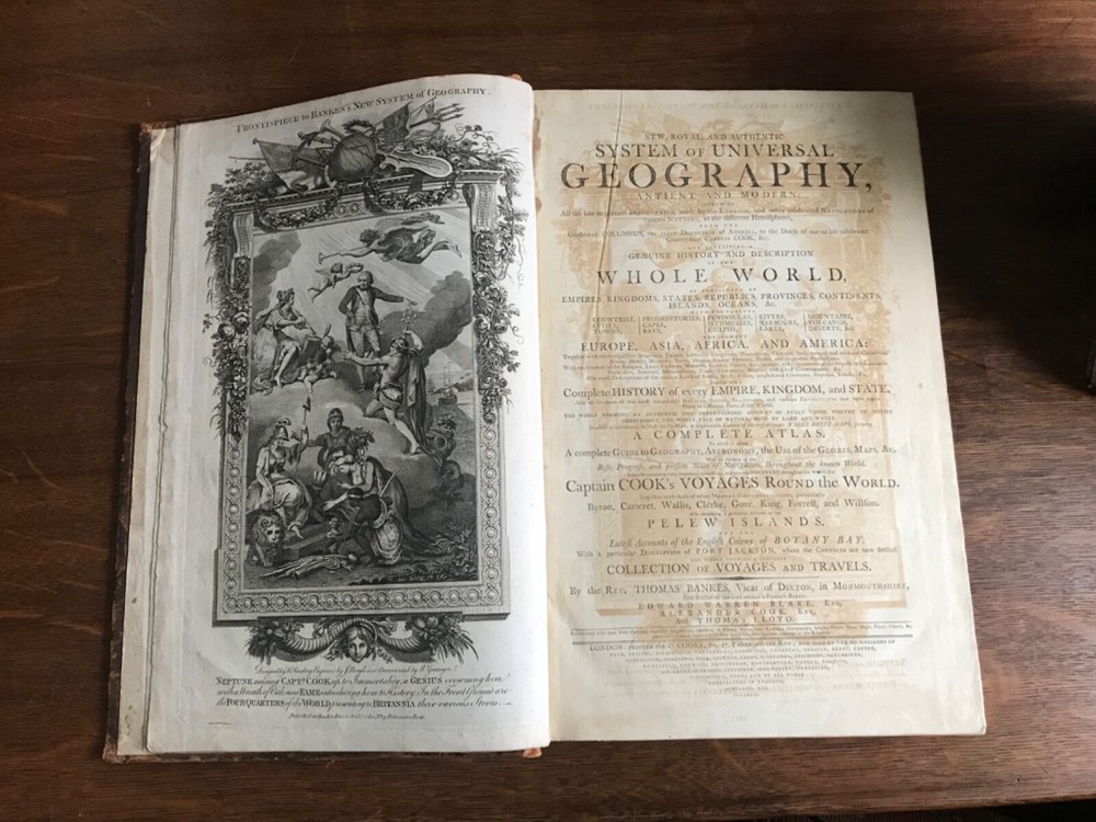 A New Royal Authentic and Complete System of Universal Geography, Antient and Modern… Thomas Bankes, Edward Warren Blake, Alexander Cook, Thomas Lloyd, Embellished with nearly Two Hundred Engravings, consisting of Views, Antiquities, Customs, Ceremonies, besides Whole Sheet Maps, Plans, Charts, &c. Executed in a much superior stile than any Thing that has ever appeared in this Kingdom. Printed for C. Cooke, London, circa 1790, Volume I: 1-460 pp, Volume II: 460-990 pp, full original leather, 15.5 x 10.25”, elephant folios. In good condition. Spines handsomely rebacked with original spine labels reattached. Very nice and sturdy. Light wear to extremities with moderate scuffing to corners. Original leather is peeling along edges. A fine leather was used for this binding. Remnants from a bookplate on pastedowns. Interiors are bright and clean. Light offsetting from plates with minor instance of age stain. Free of known markings. Lacking map of West Indies 517 pp, Map of United States, 492 pp. all else complete. Folding maps are in good working order. Internally fresh and attractively bound. A solid set. Please see photos. Early edition. Collated, not quite complete. This book went through six editions in the 1790’s and was revised to reflect new discoveries and English interest in the colony of New Holland. Much of the content deals with the South Pacific, Cook’s Voyages, and Australia (New Holland). Many of the illustrations were derived from Cook’s voyages, and were the most generally available representations of the natives of the Pacific Northwest including the Salish, Tasmania, New Zealand, Hawaii & the Pacific accessible to the public at the time. RAREB1790TXYR