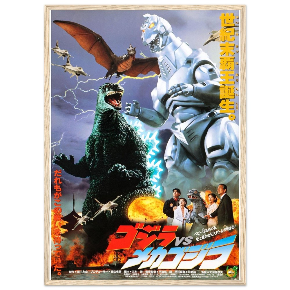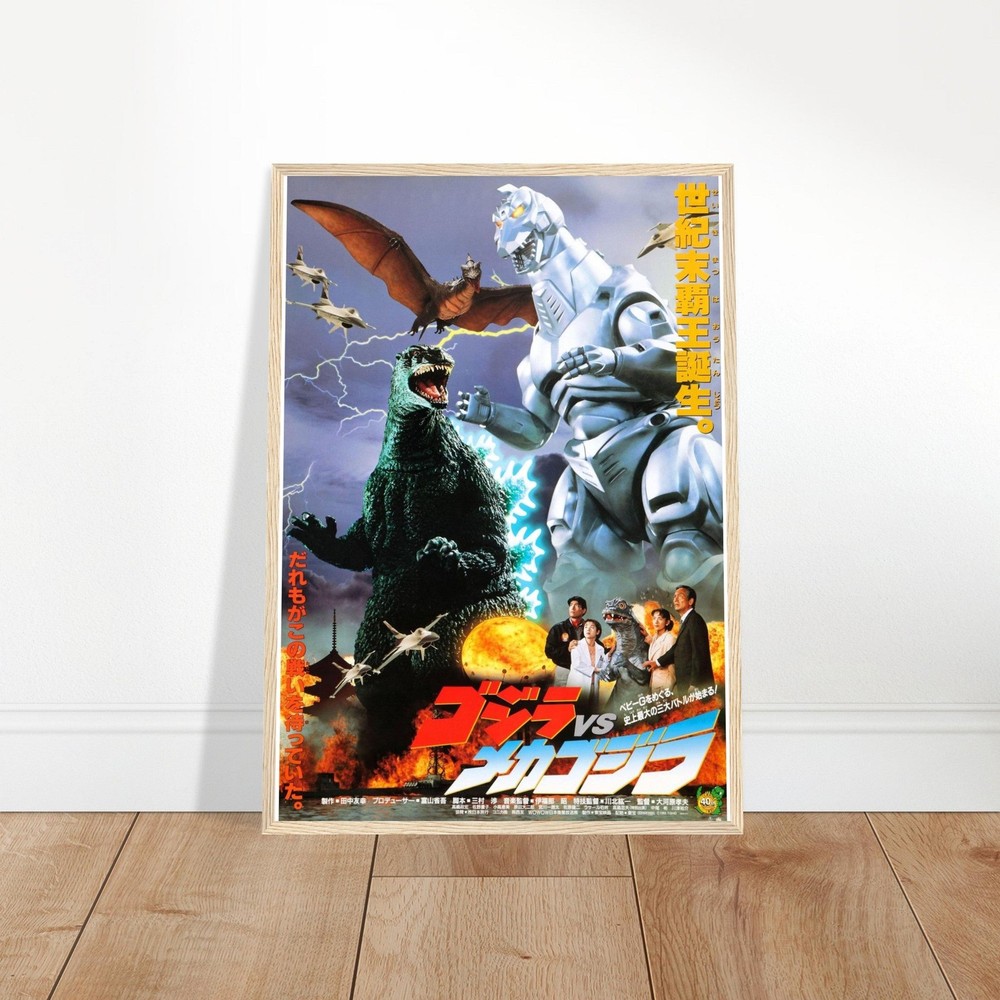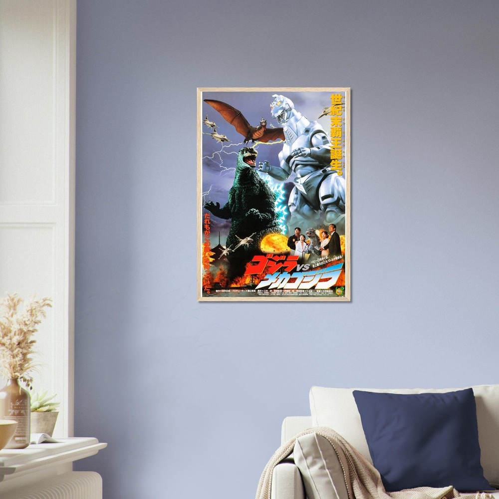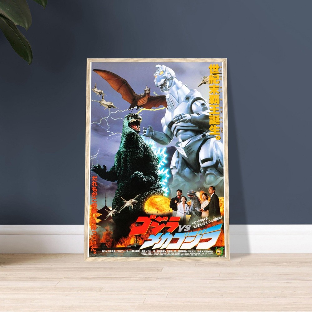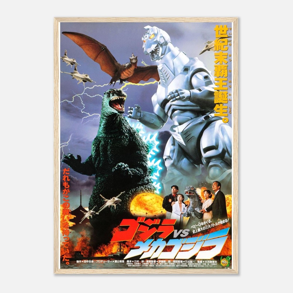 Dynamic movie poster artwork featuring an epic clash between monsters. Shows a metallic robotic creature facing off against a classic kaiju and flying creature amid lightning strikes and explosions. Bold retro Japanese sci-fi aesthetics with dramatic lighting effects and an urban backdrop. Perfect for fans of classic monster movies and vintage film art --- Our sturdy wooden framed posters come ready to hang and are printed on heavyweight white matte paper with a smooth, luxurious finish—designed to stand the test of time: Ready-to-hang: Includes hanging kit, ready to hang directly on the wall. Frame Material: Durable pine wood. Frame Measurements: 20-25mm (0.79"-0.98") thick, 10-14mm (0.4"-0.6") wide. Paper Weight: 200 gsm (80 lb), thickness: 0.22 mm (8.7 mils). Paper Finishing: Matte, smooth, non-reflective surface. Protection: Shatterproof plexiglass protects the poster. Sustainable Paper: FSC-certified materials or equivalent.