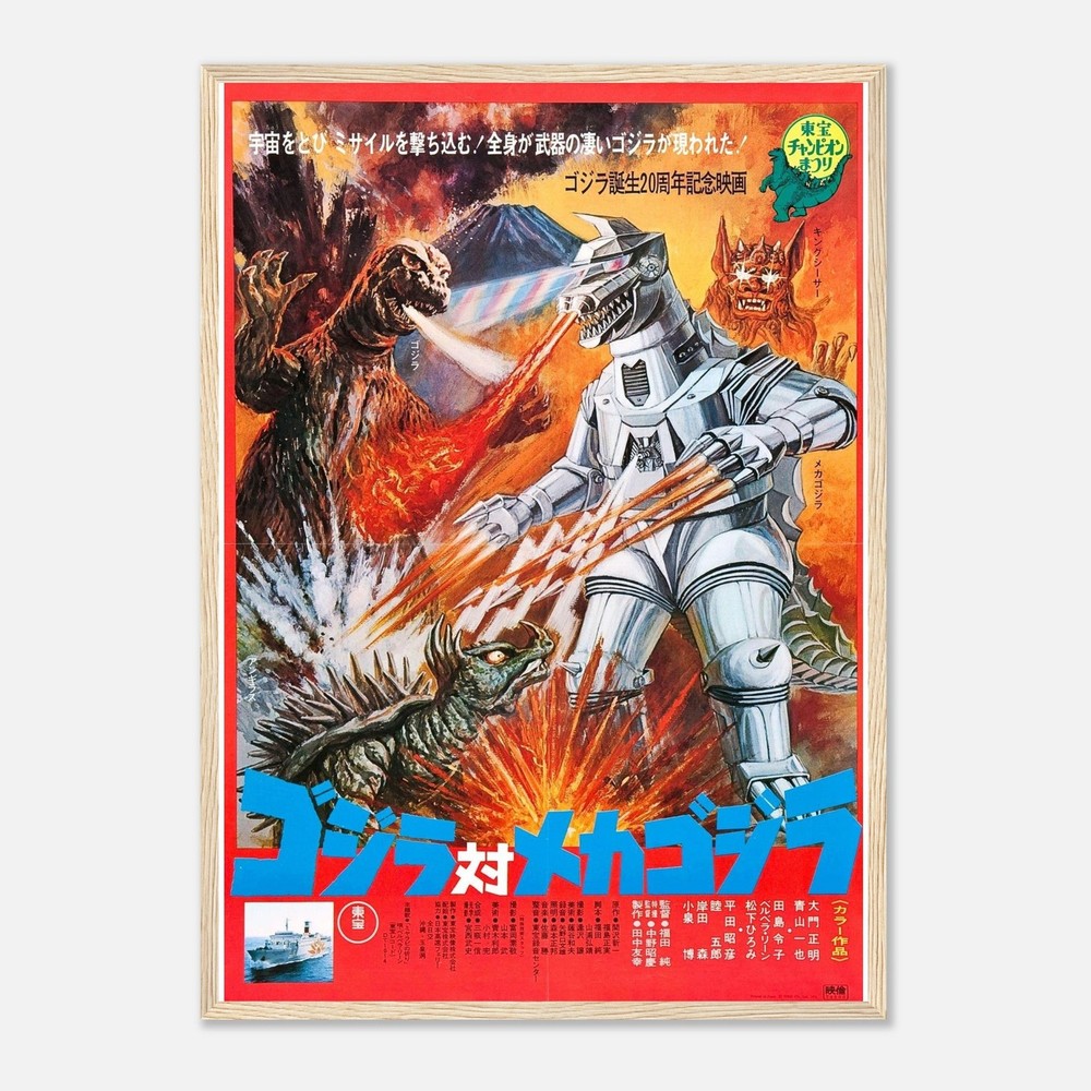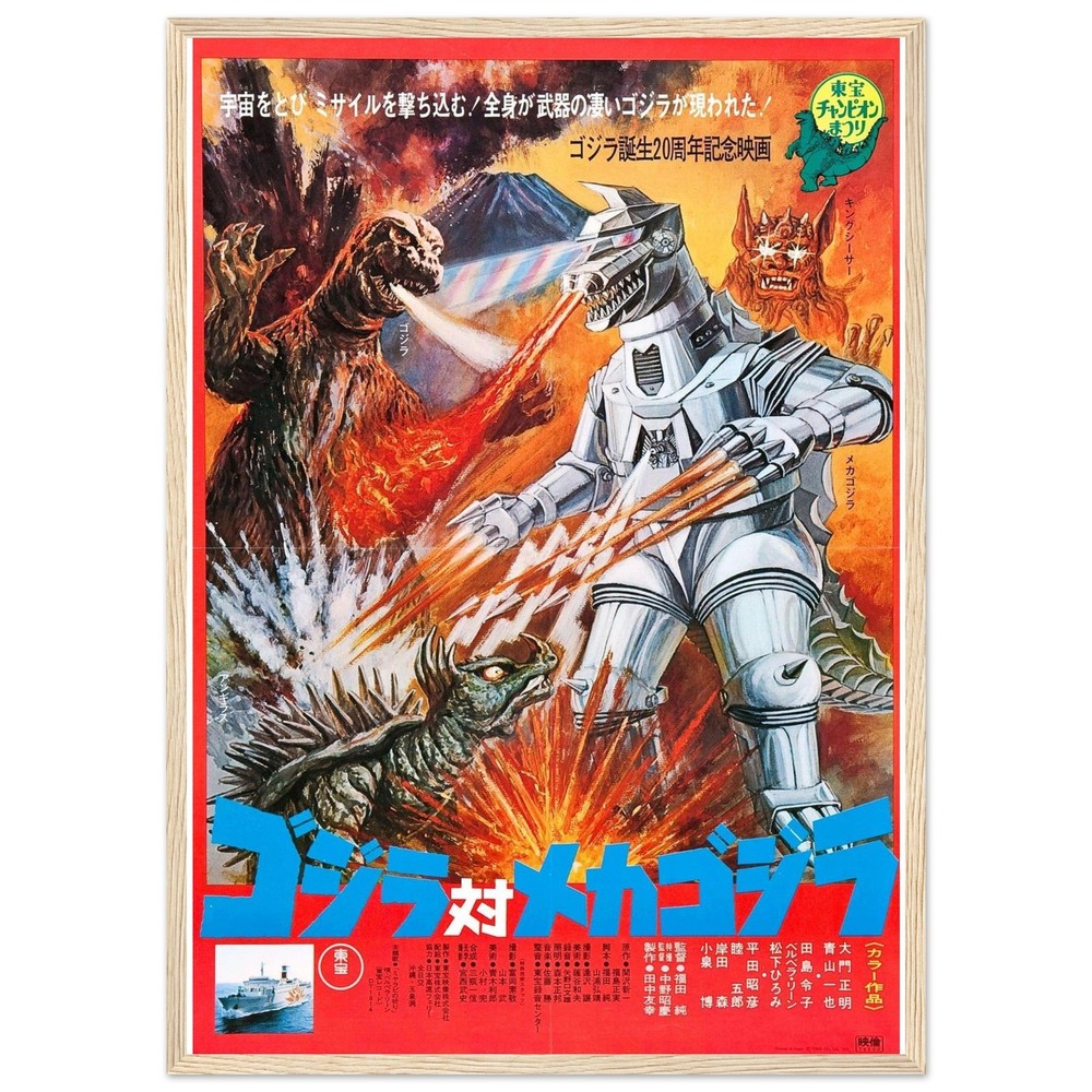 Vibrant vintage Japanese movie poster artwork featuring an epic battle between mechanical and monster creatures. Dynamic action scene with explosive red and orange flames, showcasing classic kaiju film art style. Bold retro design captures the essence of 1970s science fiction movie promotional art --- Our sturdy wooden framed posters come ready to hang and are printed on heavyweight white matte paper with a smooth, luxurious finish—designed to stand the test of time: Ready-to-hang: Includes hanging kit, ready to hang directly on the wall. Frame Material: Durable pine wood. Frame Measurements: 20-25mm (0.79"-0.98") thick, 10-14mm (0.4"-0.6") wide. Paper Weight: 200 gsm (80 lb), thickness: 0.22 mm (8.7 mils). Paper Finishing: Matte, smooth, non-reflective surface. Protection: Shatterproof plexiglass protects the poster. Sustainable Paper: FSC-certified materials or equivalent.