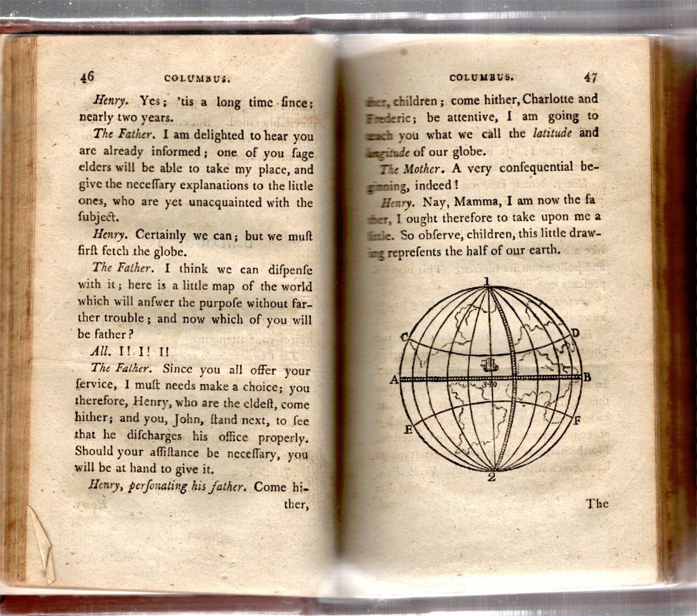 Columbus; or, The Discovery of America: as Related by a Father to His Children, and Designed for the Instruction of Youth, in Two Volumes, Translated from the German of J. H. Campe, (Author of the New Robinson Crusoe), by Elizabeth Helme, Author of Instructive Rambles in London and its Environs, the Abridgment of Plutarch's Lives, etc., etc., Printed by and for Sampson Low, Berwick Street, Soho: and sold by C. Law, Ave Maria Lane; E. Booker, New Bond Street; and R. and L. Peacock, Juvenile LIbrary, No. 159, Oxford Street, London, England, 1799 — 351 total pages (Volume I: 170 pages — Volume II: 187 pages) — missing one illustration plate — within text world map present — measures: 4 1/2" x 7 1/8" — Volume I and Volume II together in a beautifully re-bound leather volume, crafted by Gilbert — to ship boxed. OCLC Number / Unique Identifier: 1328771686351