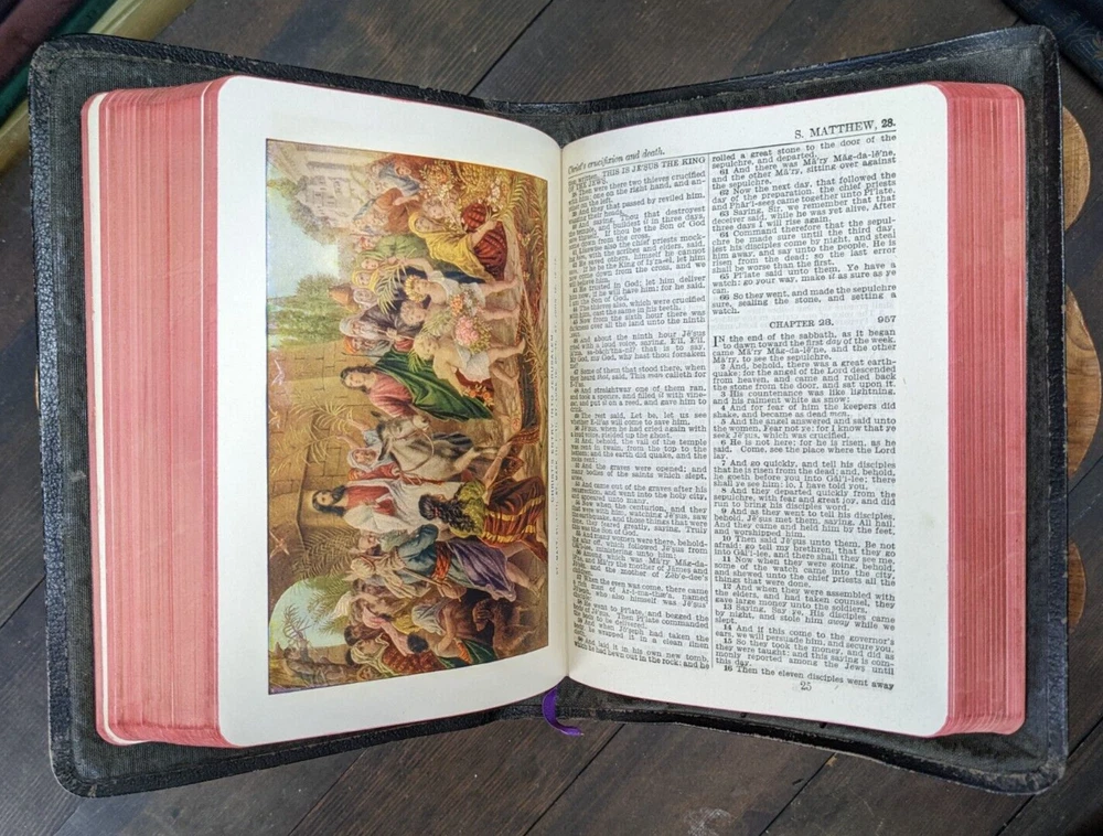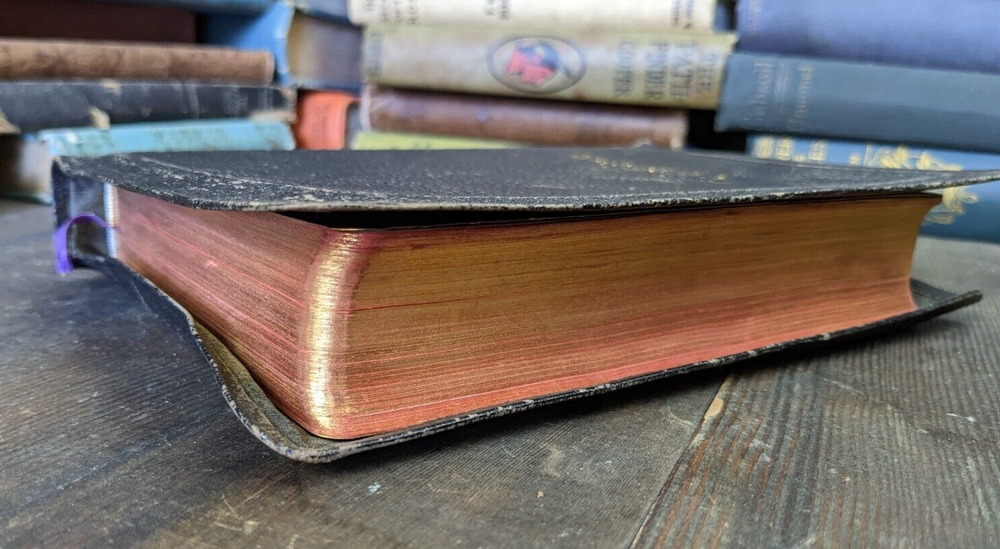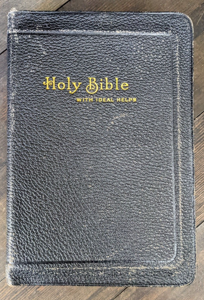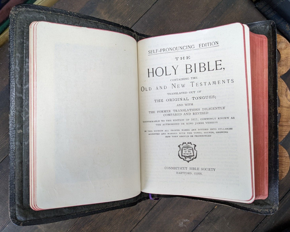 For your consideration is a piece from my personal local collection. It is an early (inscribed 1919 to a child on their 9th birthday) rare copy of the Connecticut Bible Society's Holy Bible with Ideal Helps. Self-Pronouncing King James with Old and New Testament. Includes a surprising amount of color images and a handful of maps. Faux leather cover with flaps measures about 9" x 6", pages are 7-1/4" x 5". Condition, althought not perfect, is overall good for being over a century old and being gifted to a 9 year old initially. Pages are bright with no writing other than the inscription. No missing or torn pages, no moisture damage, and the binding is as good as new. This was not a cheap printing as it's gilded on all edges with an interesting gold/red shimmer that changes depending on how you look at it. Cover has wear as shown but overall again, a very respectable copy of a very rare copy from the Connecticut Bible Society which was chartered by the state in the 19th C and is still active today! Free shipping to the USA and I'm happy to ship internationally at cost. Thanks for looking!
