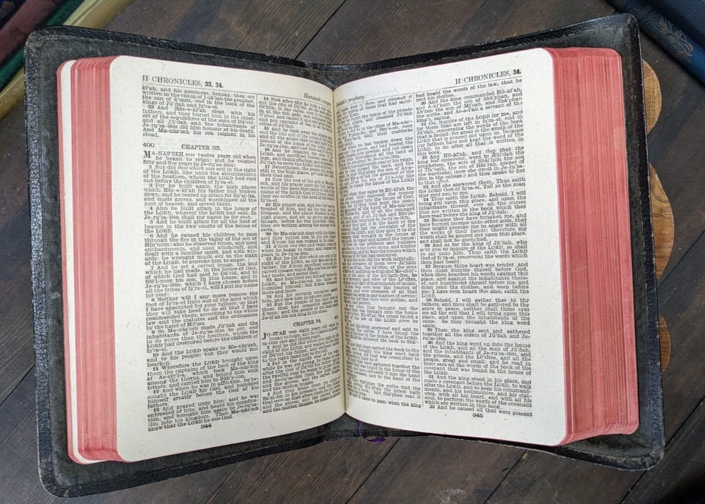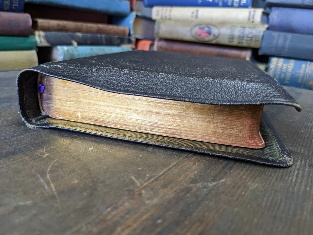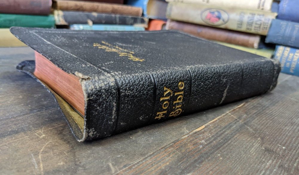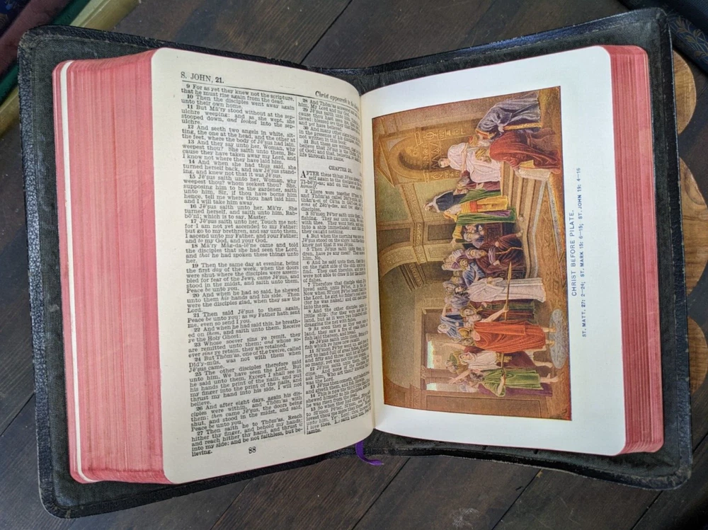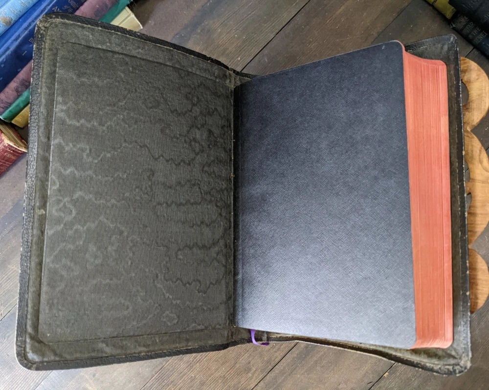 For your consideration is a piece from my personal local collection. It is an early (inscribed 1919 to a child on their 9th birthday) rare copy of the Connecticut Bible Society's Holy Bible with Ideal Helps. Self-Pronouncing King James with Old and New Testament. Includes a surprising amount of color images and a handful of maps. Faux leather cover with flaps measures about 9" x 6", pages are 7-1/4" x 5". Condition, althought not perfect, is overall good for being over a century old and being gifted to a 9 year old initially. Pages are bright with no writing other than the inscription. No missing or torn pages, no moisture damage, and the binding is as good as new. This was not a cheap printing as it's gilded on all edges with an interesting gold/red shimmer that changes depending on how you look at it. Cover has wear as shown but overall again, a very respectable copy of a very rare copy from the Connecticut Bible Society which was chartered by the state in the 19th C and is still active today! Free shipping to the USA and I'm happy to ship internationally at cost. Thanks for looking!