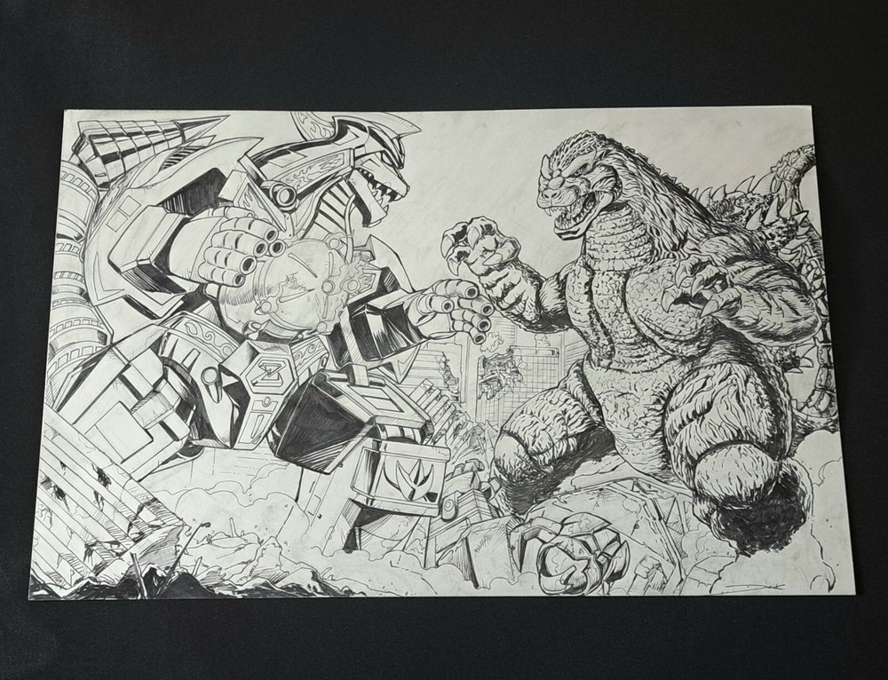 Dan Khanna. Godzilla vs Power Rangers. 11" x 17". Inked full sketch of Godzilla battling the Dragonzord done as an art print. Signed by Dan Khanna on the bottom right. Page in great condition with some shelfwear. I ship all items from a newly opened, cleaned, and sanitized space. Many items are pre-packed in their shipping box so you do not need to worry about contamination of any kind. I combine shipping, please contact me for an invoice before paying. Buyer is responsible for local taxes and/or customs on all orders. Contacting me about falsifying shipping records will result in you being blocked. Please understand that we are dealing with a global pandemic and an overworked postal system. Your order will likely be delayed. There's nothing you or I can do about it.