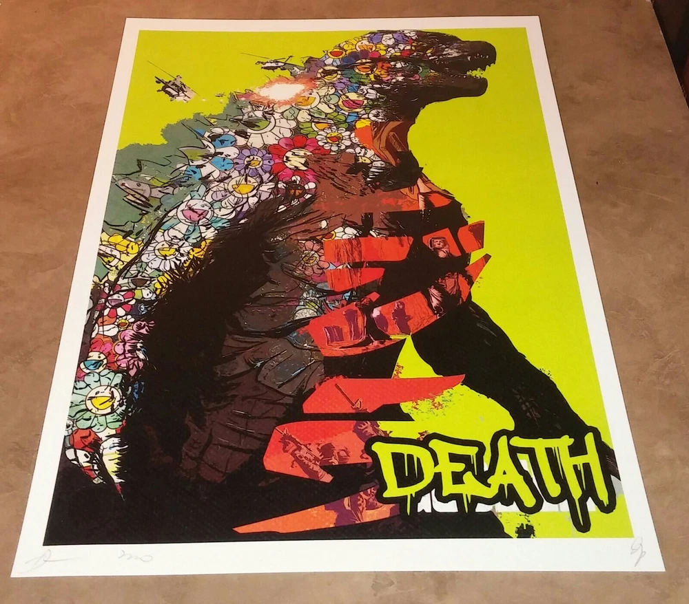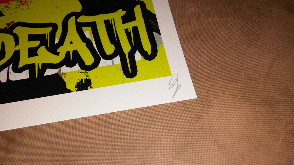 我可以寄到中国。给我发消息,我会将清单从印刷品更改为绘画,然后可以运送到中国。 Wǒ kěyǐ jì dào zhōngguó. Gěi wǒ fā xiāoxī, wǒ huì jiāng qīngdān cóng yìnshuāpǐn gēnggǎi wèi huìhuà, ránhòu kěyǐ yùnsòng dào zhōngguó Item can be shipped to China. Message me so i can change the listing category from a print to a painting. Death NYC Print is Brand New 100% Authentic Size: 45cm x 32cm (large) Edition of 100 and Artists Proofs (of which there are approx 20-30) This print is an Artists Proof (AP) The art print is signed and dated by DEATH NYC Paper: Fine art 300 gsm paper Print is Blind Stamped and Comes With Certificate of Authenticity Card signed by DEATH NYC And Gold Seal Sticker